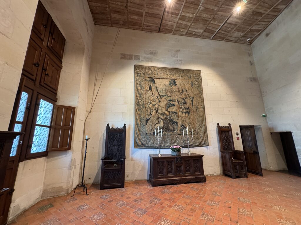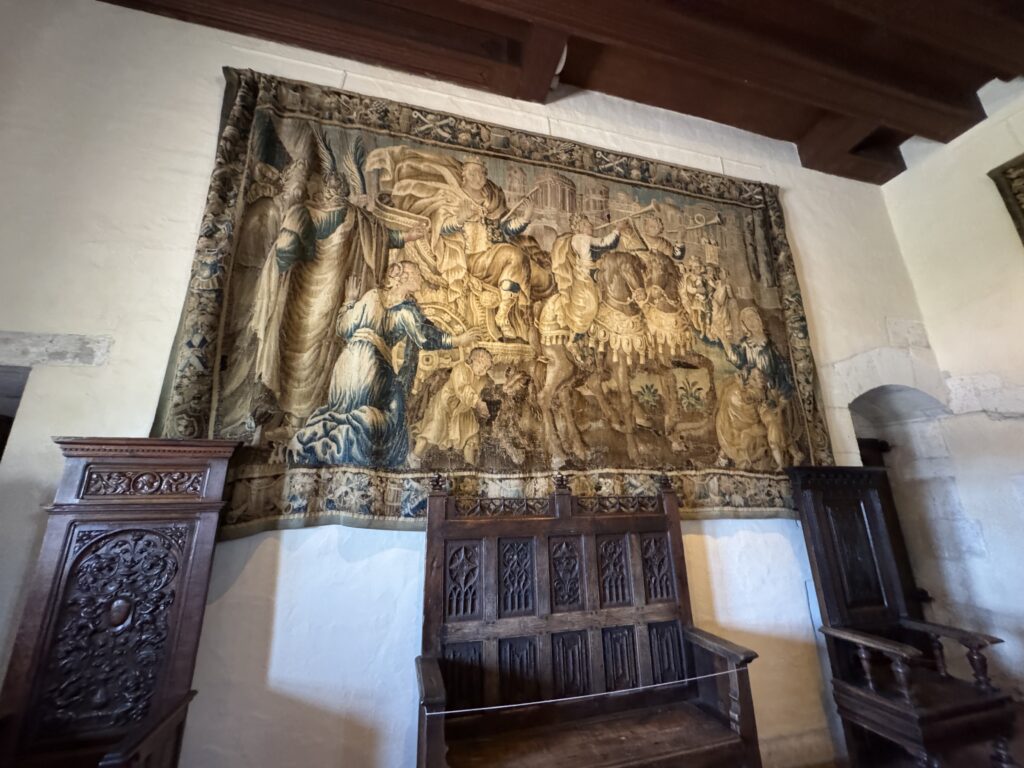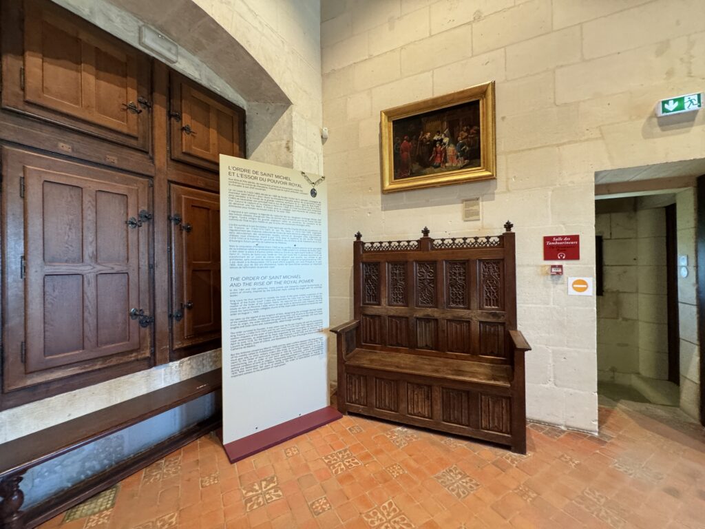 «Выйдя из зала королевской стражи мы поднимаемся в зал тамбуринщиков. Обратите внимание на пол, украшенный изображениями королевских лилий. На стене висят фламандские гобелены (XVI) с сюжетами из жизни Александра Македонского. По своему расположению это помещение соответствует приемному залу короля, стены которого украшались гобеленами. Двор часто перемещался и предметы обстановки перевозились вместе с ним. Название «Зал тамбуринщиков» (музыкантов) напоминает о празднествах и балах, устраивавшихся в замке. Он был так назван в честь пребывания в Амбуазе короля Людовика XIV (1661 г.)»