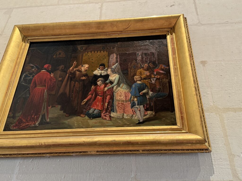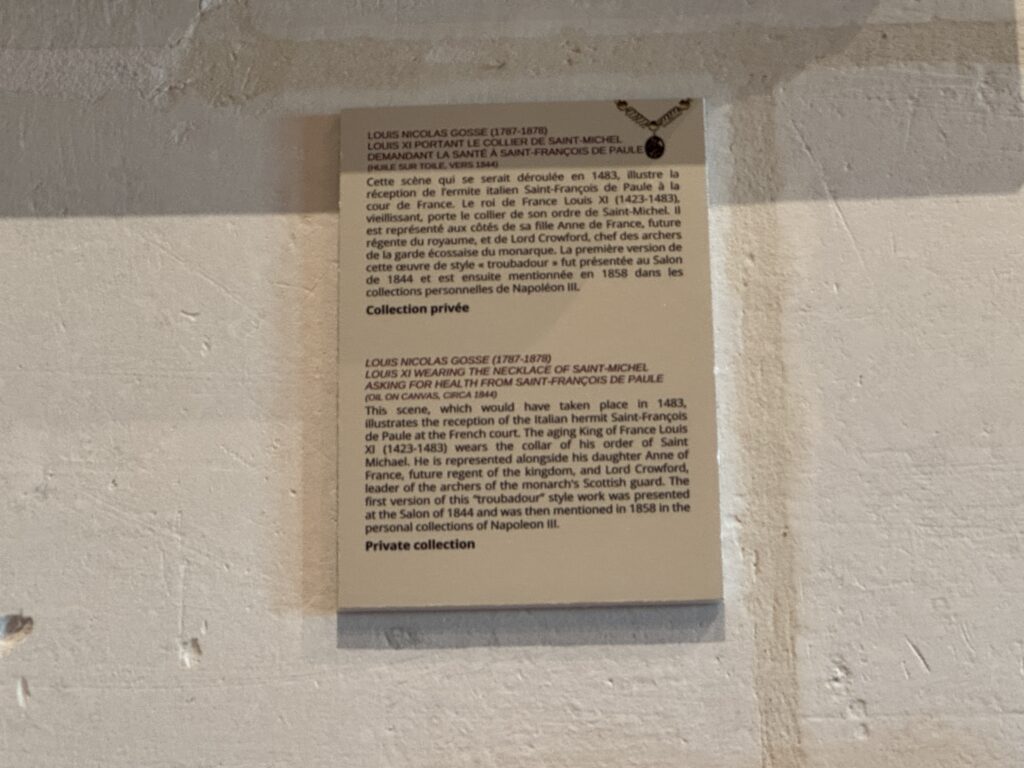 Луи Николя Госс (1787-1878) Людовик XI с цепью ордена святого Михаила, просящий здоровья у святого Франциска из Паулы (холст, масло, около 1844 г.) Эта сцена, предположительно произошедшая в 1483 году, изображает приём итальянского отшельника, святого Франциска из Паолы, при французском дворе. Стареющий король Франции Людовик XI (1423–1483) носит цепь ордена Святого Михаила. Он изображён рядом со своей дочерью Анной Французской, будущей регентшей королевства, и лордом Кроуфордом, главным лучником шотландской гвардии монарха. Первая версия этой работы в стиле трубадуров была представлена ​​на Салоне 1844 года и позднее, в 1858 году, упоминалась в личной коллекции Наполеона III. Частная коллекция