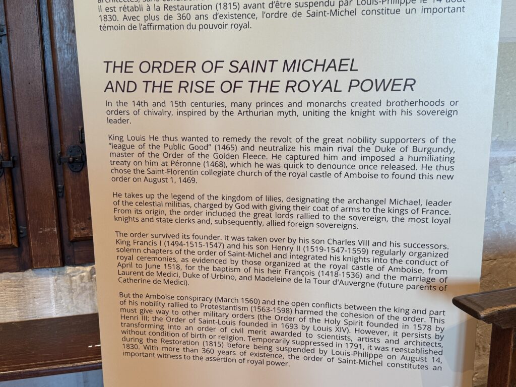 Однако Амбуазский заговор (март 1560 г.) и открытые конфликты между королём и частью его знати, принявшей протестантизм (1563–1598 гг.), нанесли ущерб единству ордена. Орден вынужден был уступить место другим военным орденам (Ордену Святого Духа, основанному в 1578 году Генрихом III; Ордену Святого Людовика, основанному в 1693 году Людовиком XIV). Однако он продолжает существовать, преобразовавшись в орден гражданских заслуг, присуждаемый учёным, художникам и архитекторам независимо от происхождения или вероисповедания. Временно упразднённый в 1791 году, он был возрождён во время Реставрации (1815 г.), прежде чем был упразднён Луи-Филиппом 14 августа 1830 года. Более чем 360-летняя история ордена Святого Михаила является важным свидетельством утверждения королевской власти.»