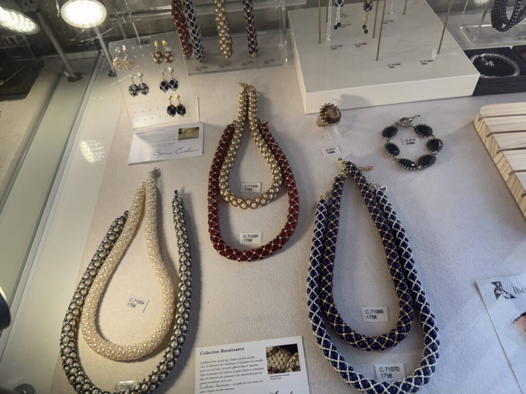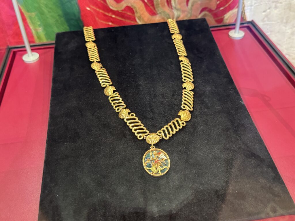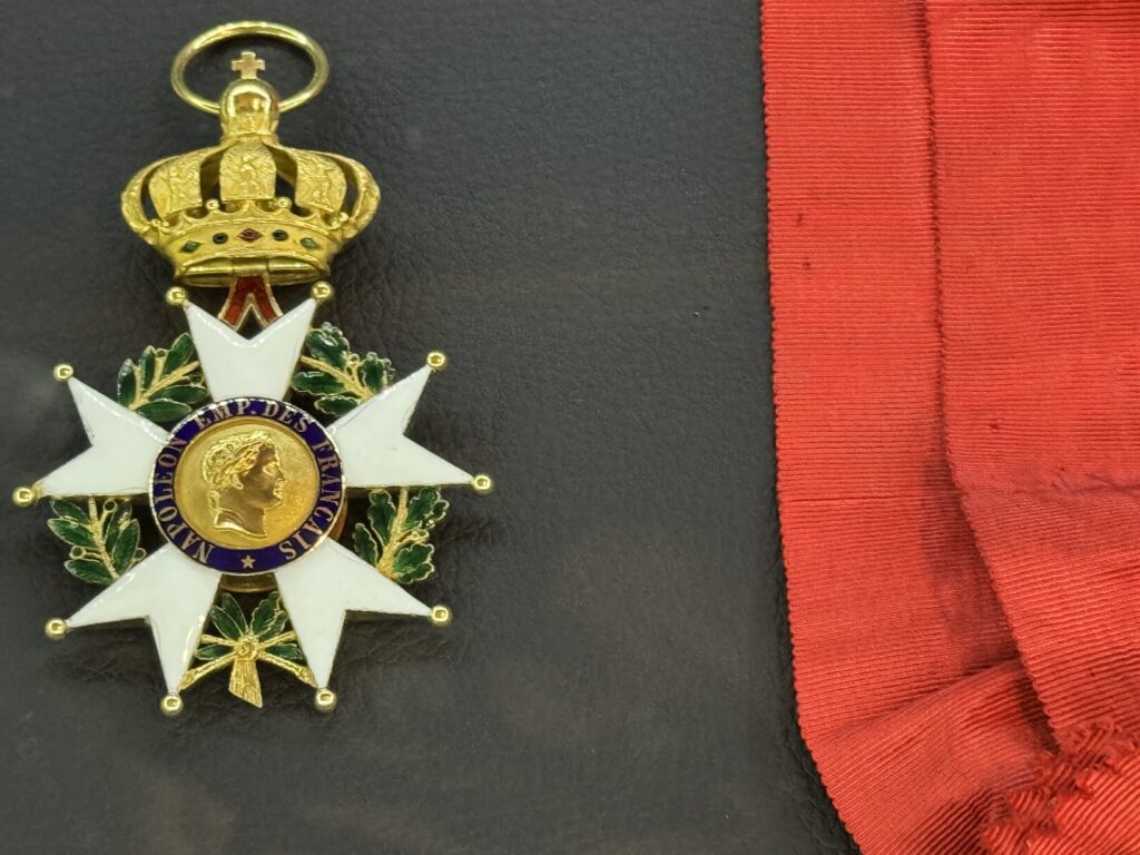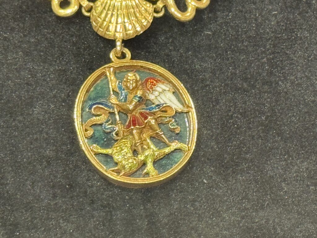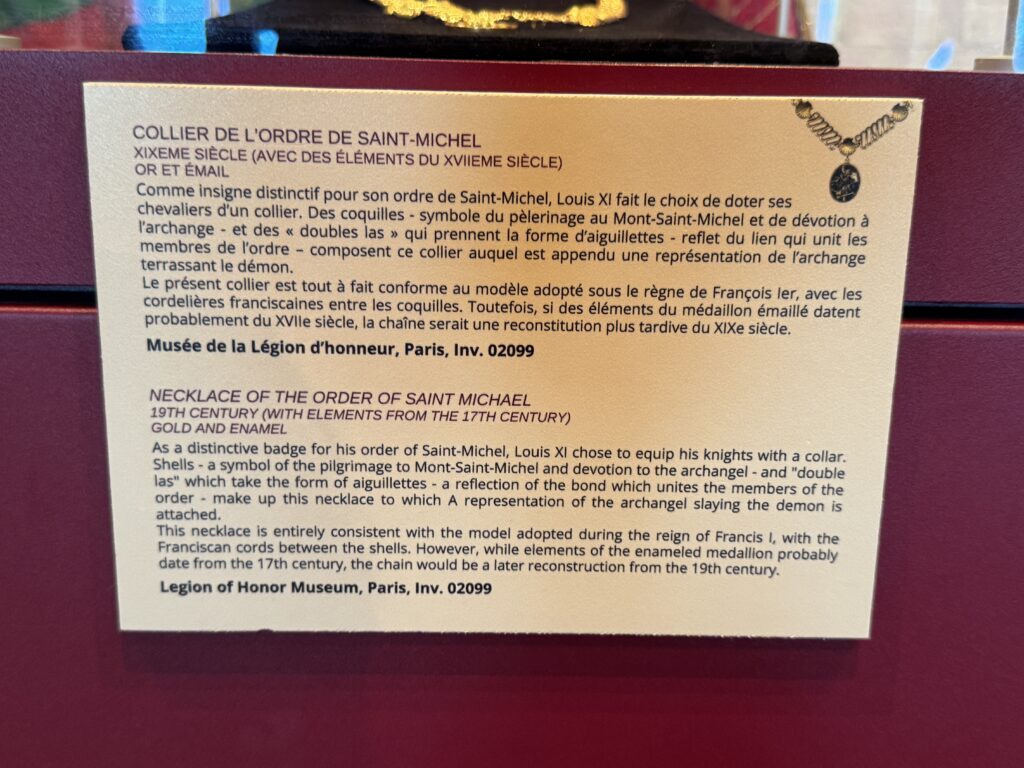 «Цепь ордена Святого Михаила, 17-19 век, золото, эмаль. В качестве отличительного знака ордена Святого Михаила Людовик XI решил снабдить своих рыцарей цепью. Эта цепь состоит из ракушек – символа паломничества к Мон-Сен-Мишель и преданности архангелу – и фигур, отражающих узы, объединяющие членов ордена. К цепи прикреплено изображение архангела, поражающего дьявола. Это ожерелье полностью соответствует модели, принятой в эпоху правления Франциска I, с францисканскими шнурами между раковинами. Однако, если элементы эмалевого медальона, вероятно, относятся к XVII веку, то цепь представляет собой более позднюю реконструкцию XIX века. Музей Почетного легиона, Париж, инв. 02099″