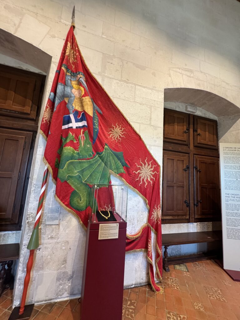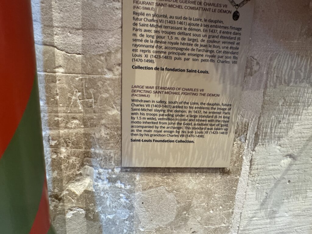 Удалившись в безопасное место к югу от Луары, дофин, будущий Карл VII (1403–1461), добавил к своим эмблемам изображение святого Михаила, поражающего демона. В 1437 году он вступил в Париж со своими войсками, марширующими под большим знаменем (6 м в длину и 1,5 м в ширину), ярко-красного цвета, украшенным королевским девизом, унаследованным от Иоанна Доброго, – сияющей золотой звездой в сопровождении архангела. Этот штандарт был принят в качестве главного королевского символа его сыном Людовиком XI (1423–1483), а затем внуком Карлом VIII (1470–1498). Коллекция Фонда Сен-Луи.»