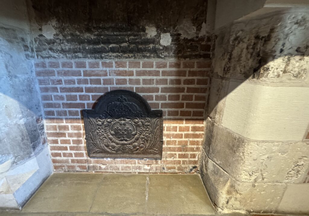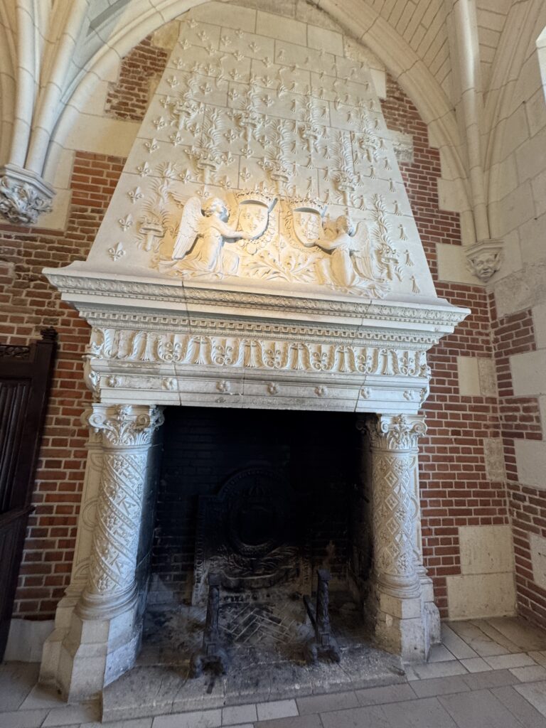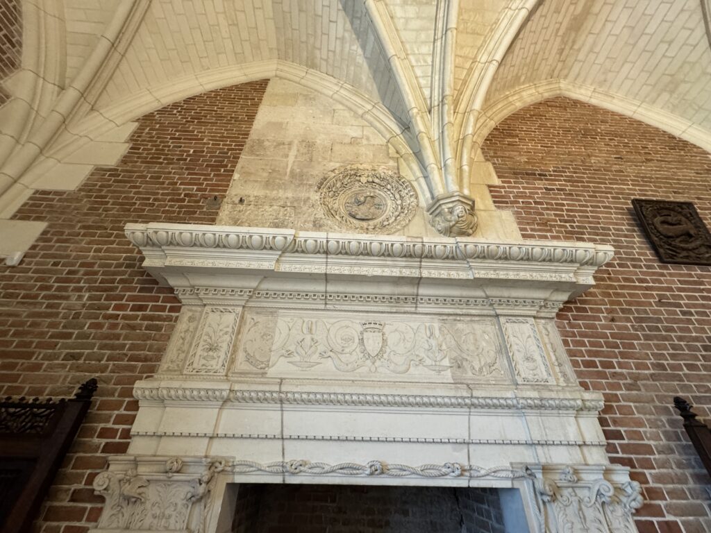— Первый камин создает уют в холодный сезон. Его трапецеидальный навес еще не несет на себе отпечатка готической традиции. Украшения навеса: эмблема Карла VIII — стилизованный под пальмовую ветвь меч в стиле пламенеющей готики.
