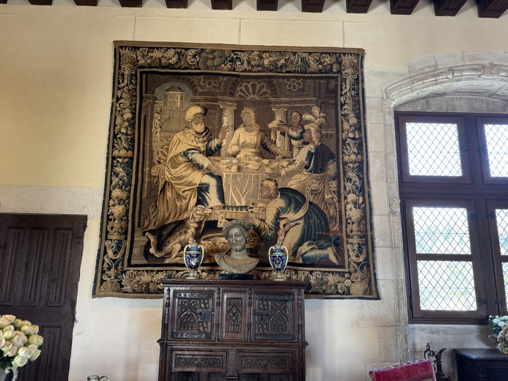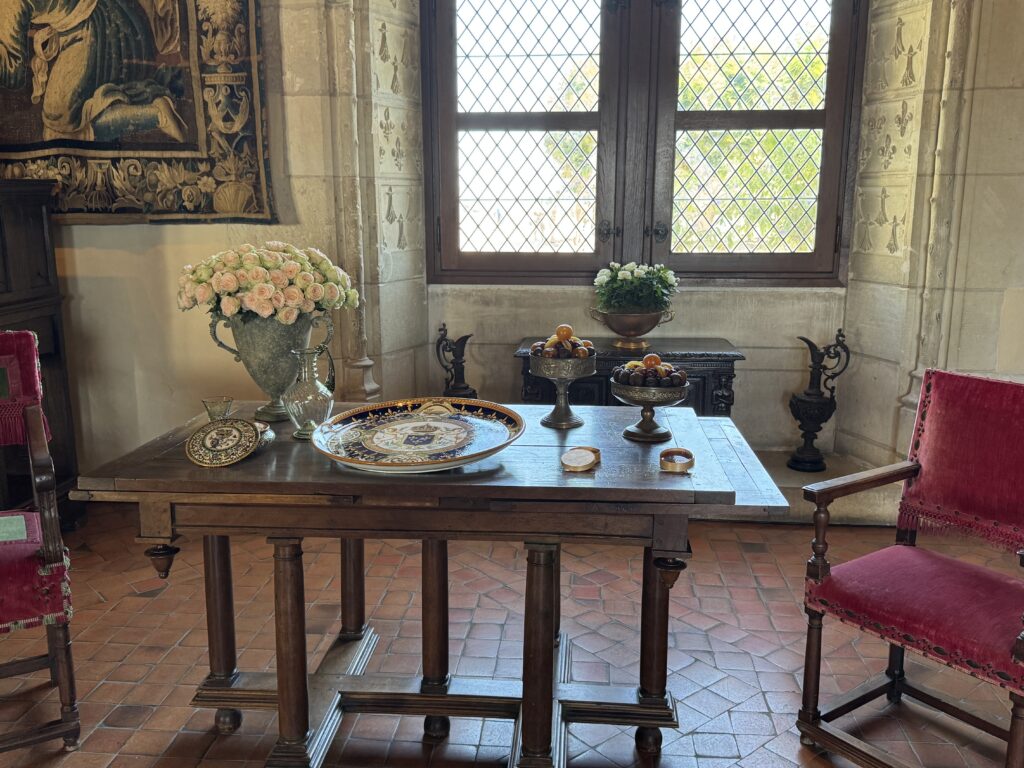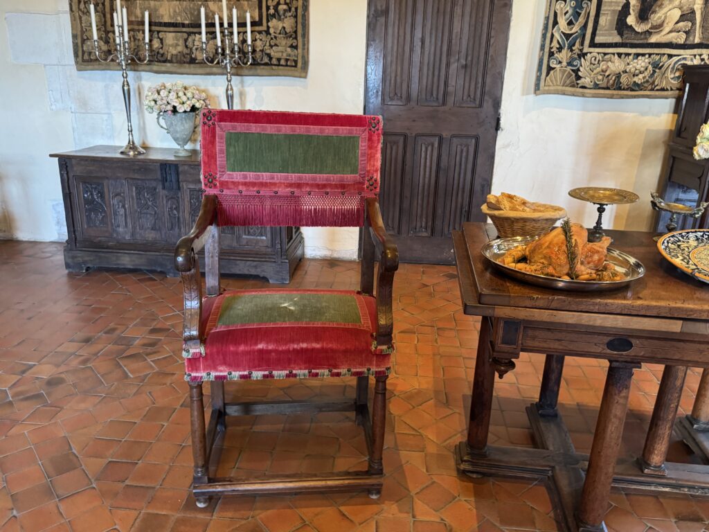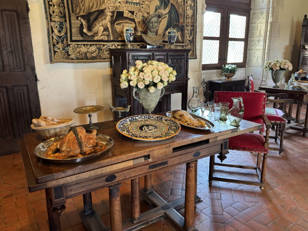 «Покои эпохи Возрождения: Зал виночерпия. Этот зал в дворце напоминает об обычаях за королевским столом, где виночерпий подавал напитки. На смену средневековым козлам пришли столы. Появляется «итальянский» стол. Он богато украшен и может раскладываться. Столовый этикет эволюционирует медленно: вилка с двумя зубцами входит в обиход очень постепенно (до Генриха II гораздо охотнее пользовались ножом и ложкой)»