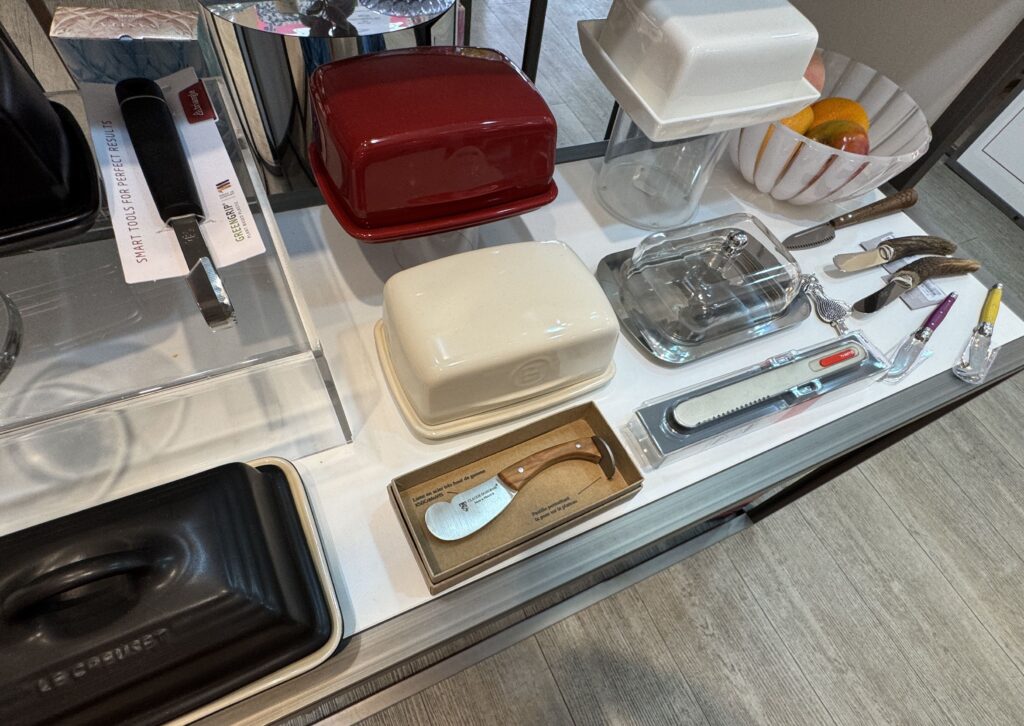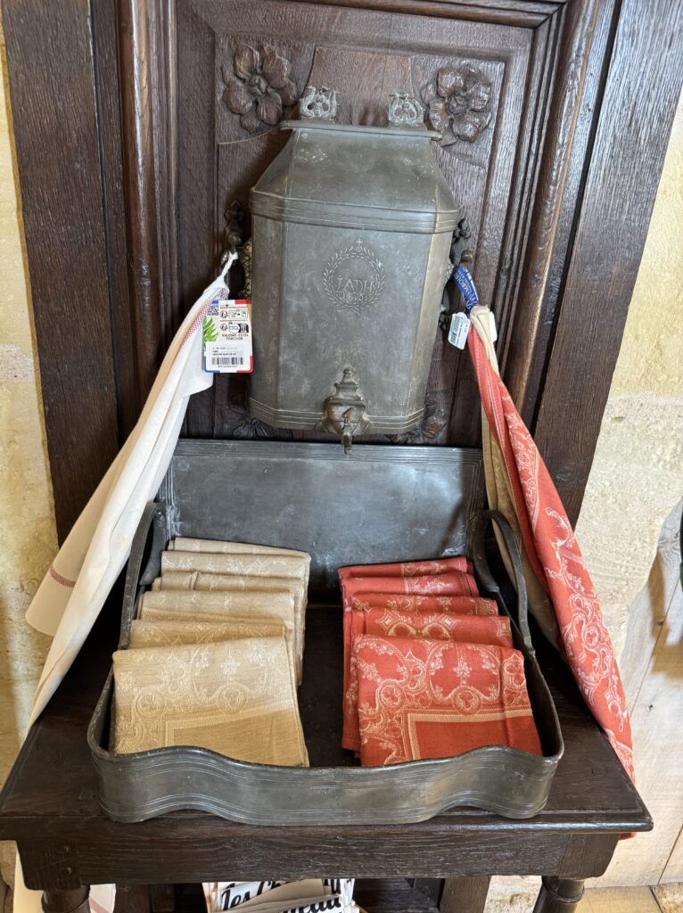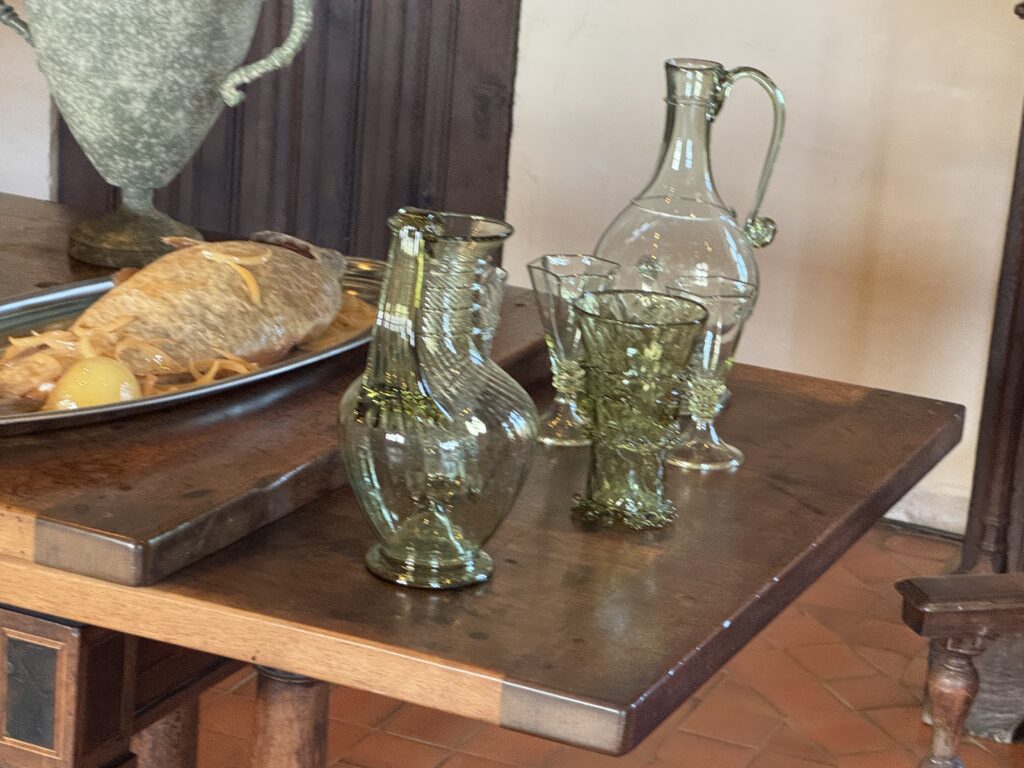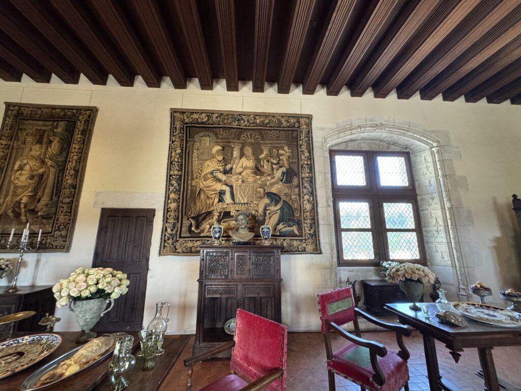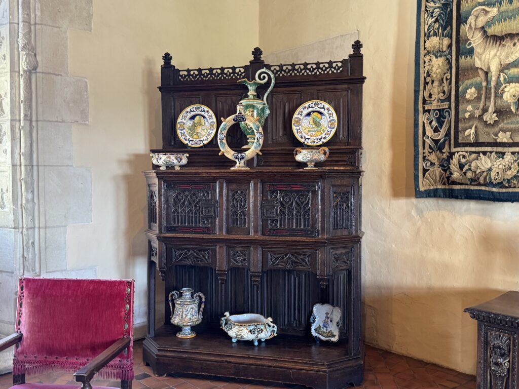 «Покои эпохи Возрождения: Зал виночерпия. Этот зал в дворце напоминает об обычаях за королевским столом, где виночерпий подавал напитки. На смену средневековым козлам пришли столы. Появляется «итальянский» стол. Он богато украшен и может раскладываться. Столовый этикет эволюционирует медленно: вилка с двумя зубцами входит в обиход очень постепенно (до Генриха II гораздо охотнее пользовались ножом и ложкой)»