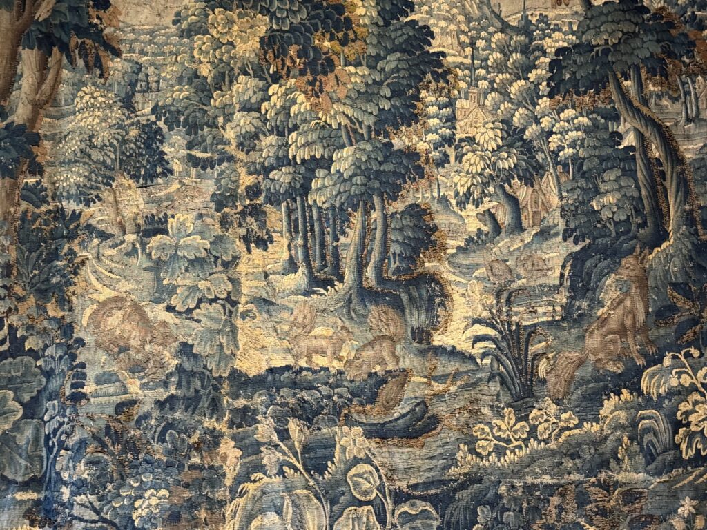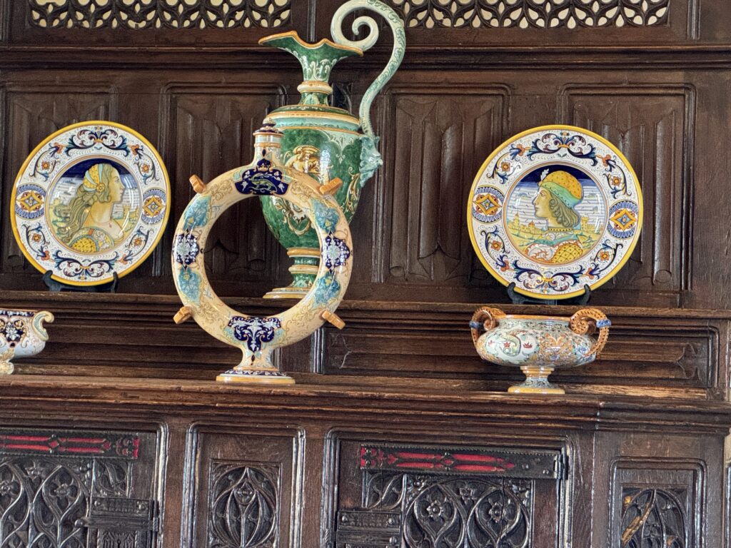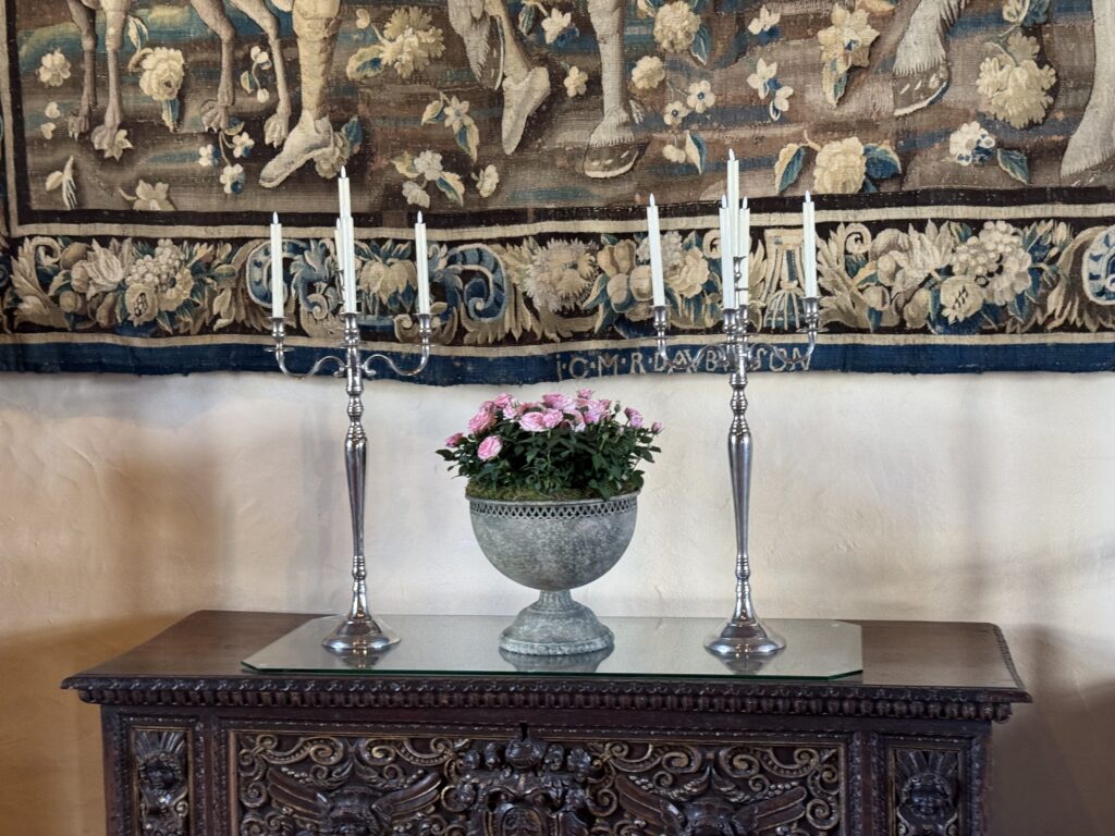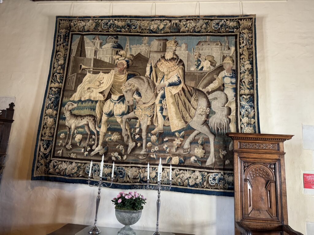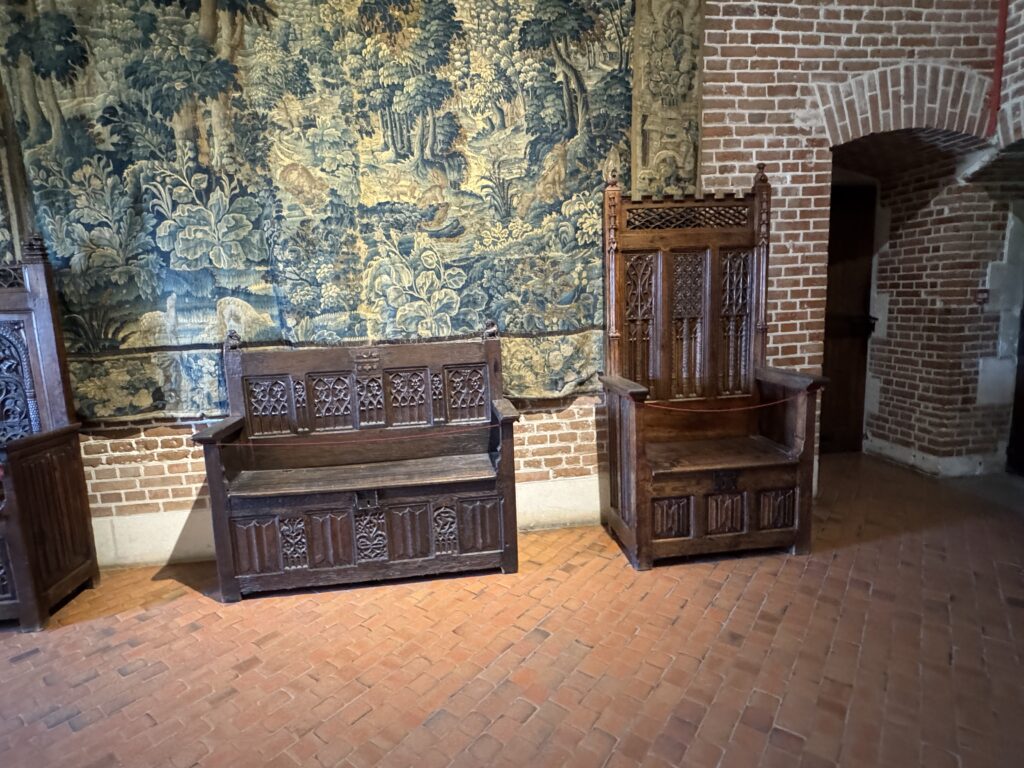 Мебель в готическом стиле: «горка» (именовавшаяся также сервант или буфет), сундук, два кресла. Мебель в стиле Возрождения: «итальянские» столы и большой ореховый сундук, кресла, скамья-ларь, раскладной стол. Гобелены французских мануфактур в Обюссоне, вытканные в XVII в. по эскизам Лебрена.