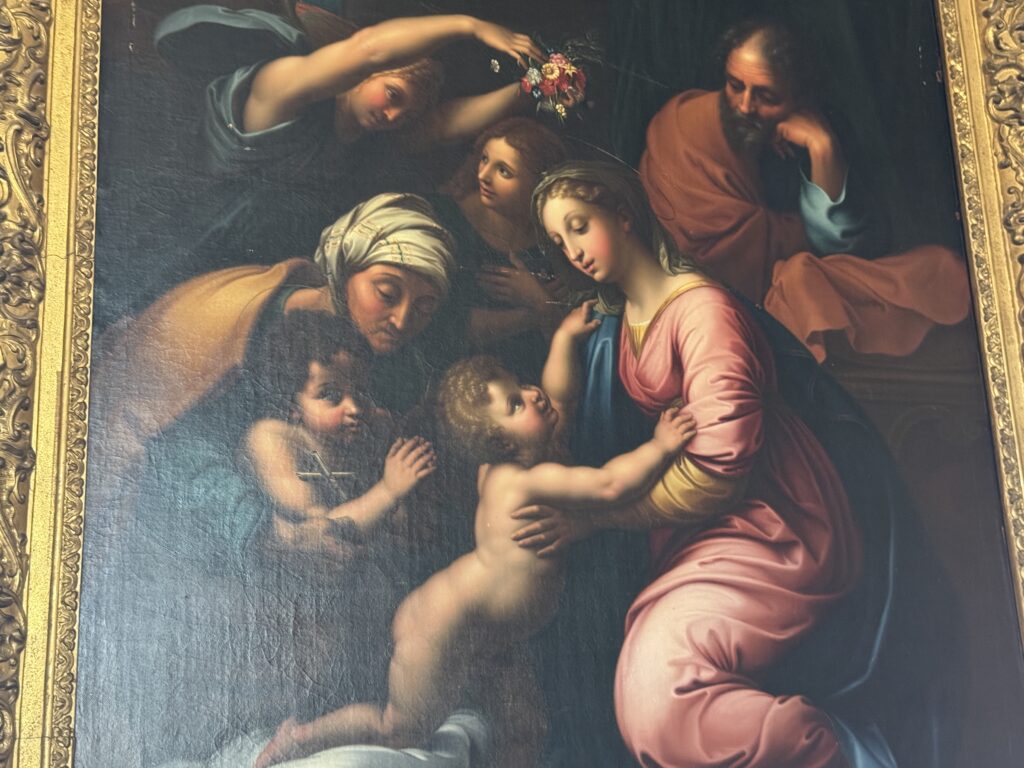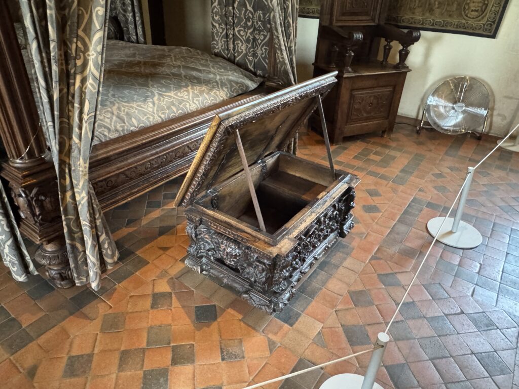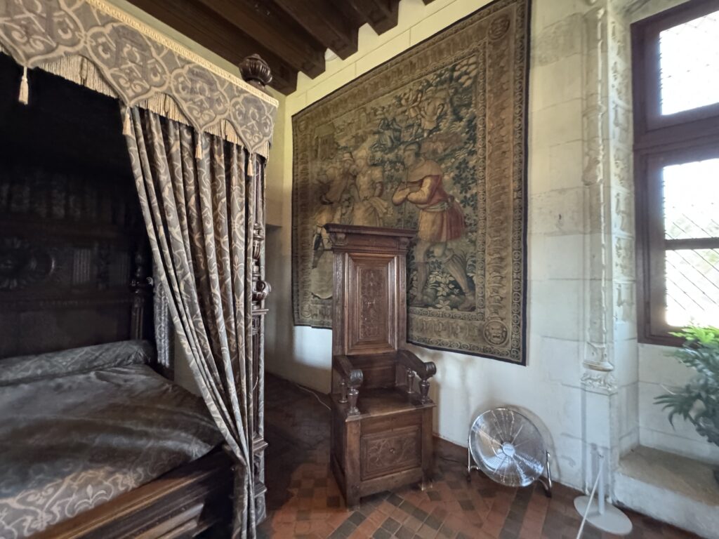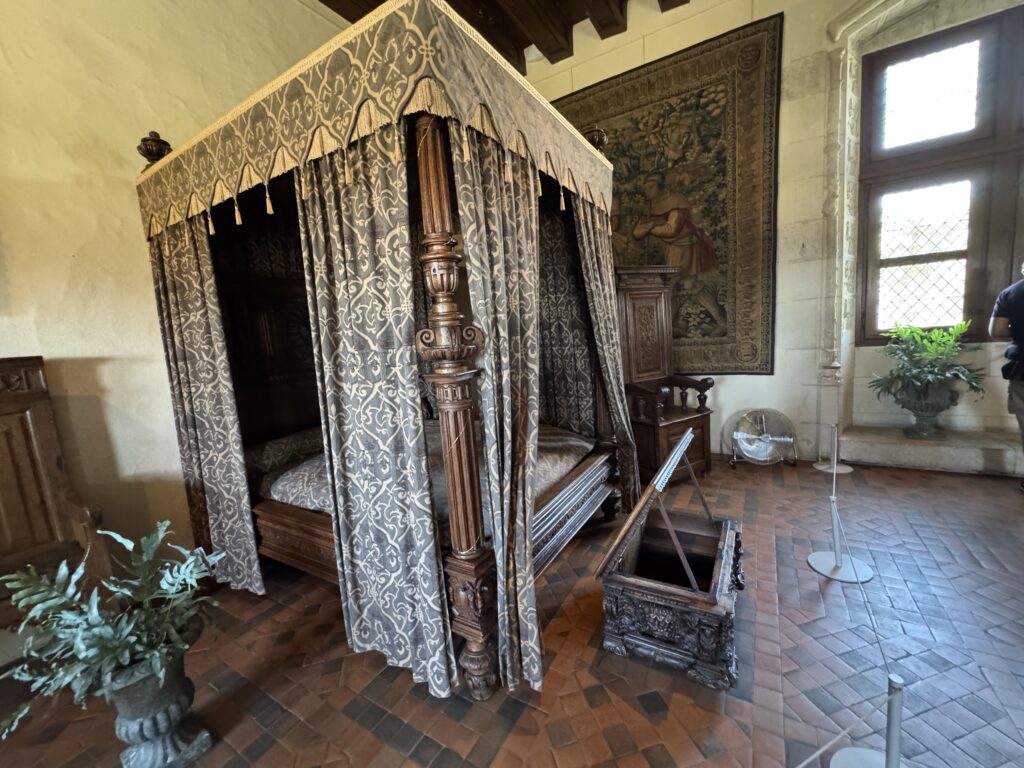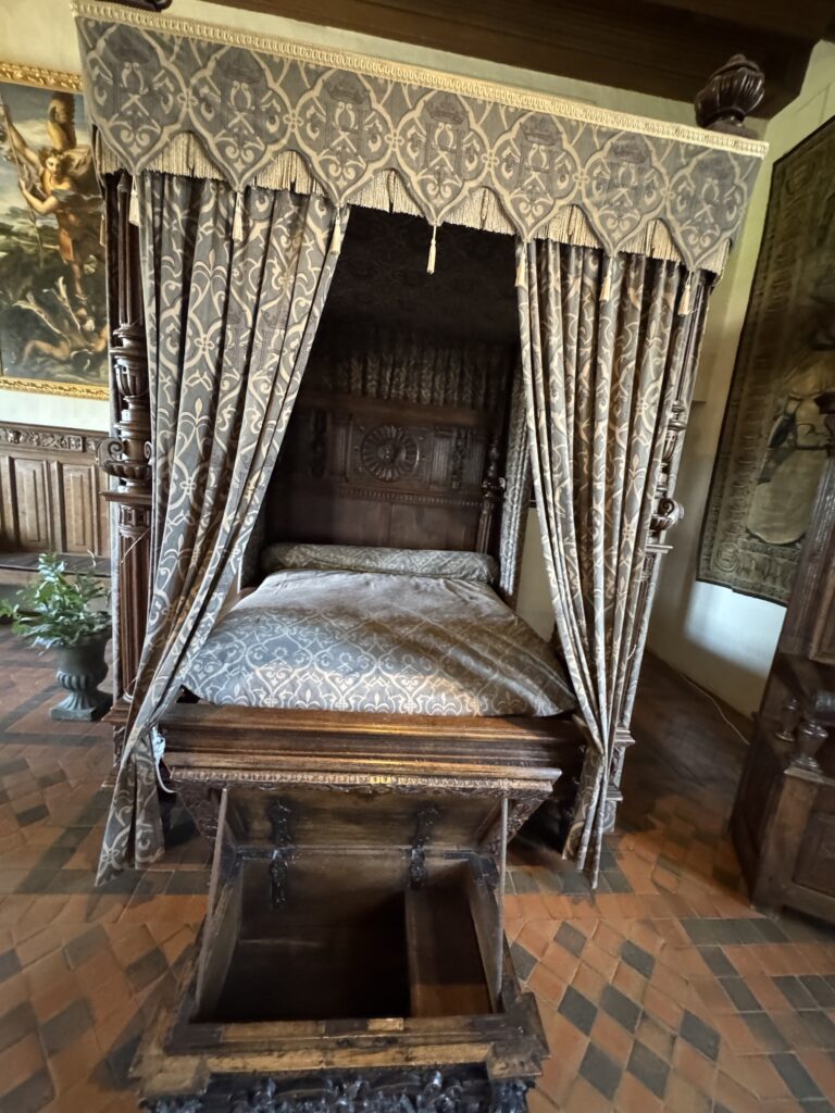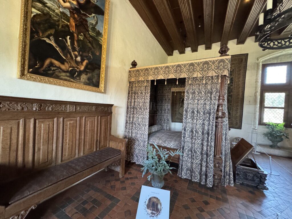 «Опочивальня Генриха II. Эта комната была смежной с пристройкой, которая не сохранилась, и была построена по распоряжению Екатерины Медичи (1519-+1589), супруги короля Генриха II (1519, корон. 1547, +1559), которая, после смерти мужа, приняла активное участие в делах королевства в качестве регентши. Убранство этой комнаты прекрасно иллюстрирует использование перспективы в декоративном искусстве XVI века»
