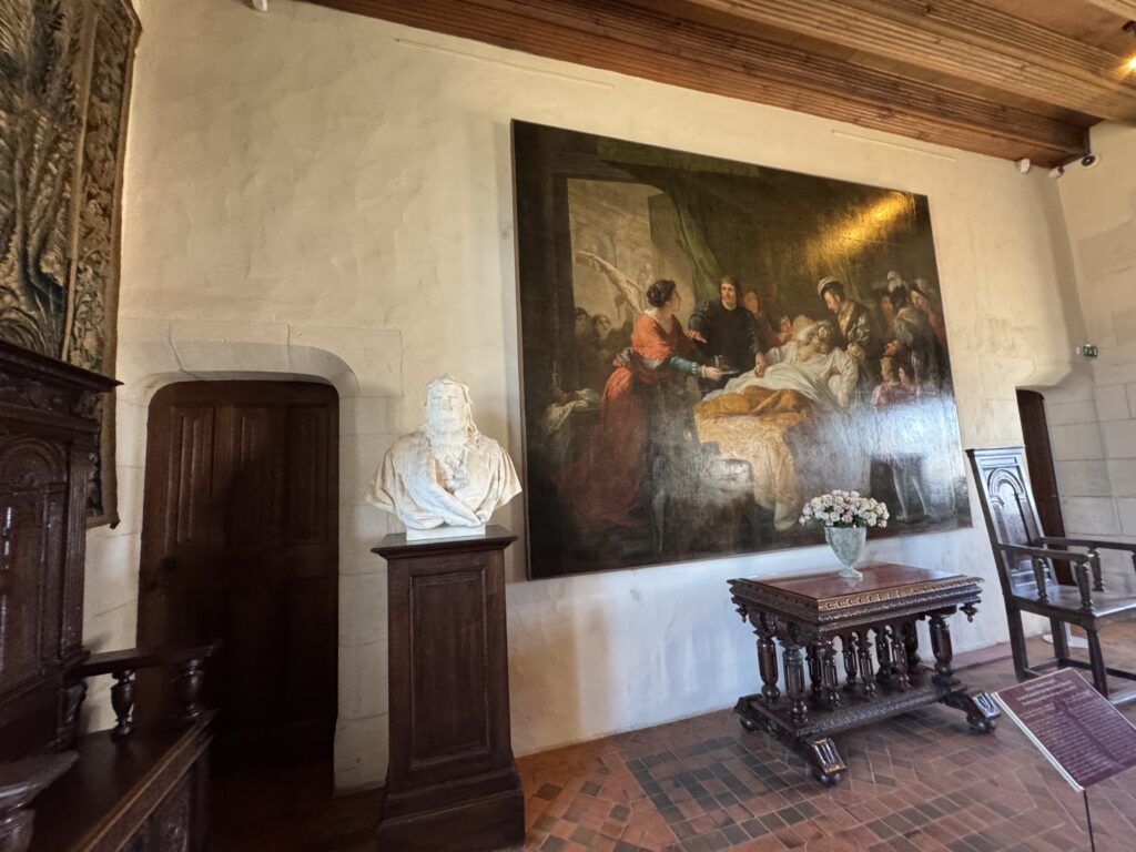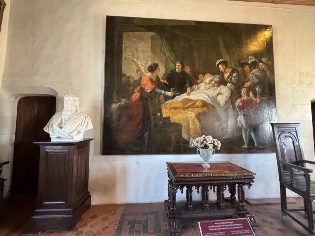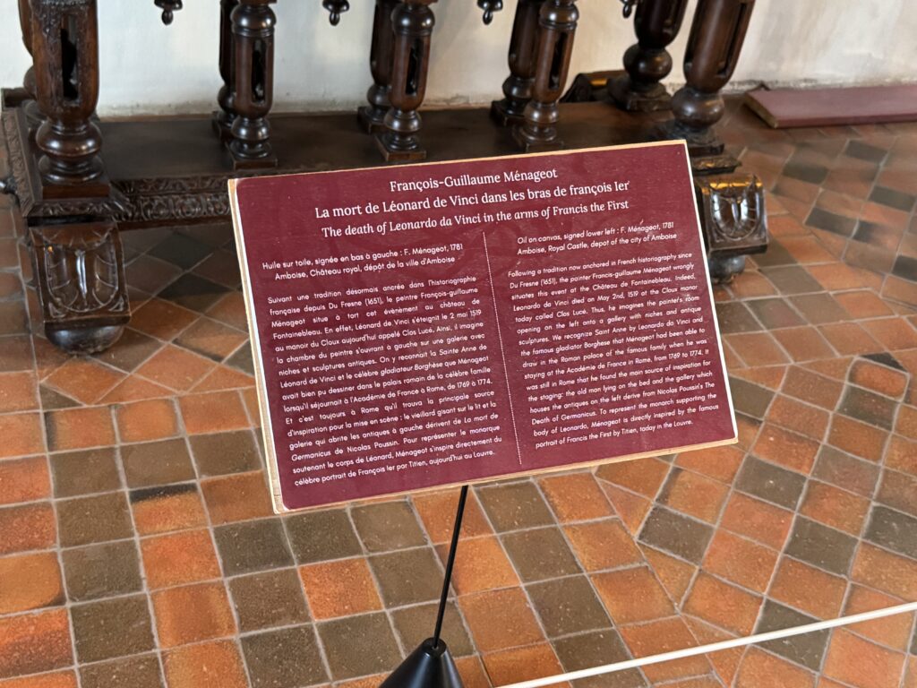 «Франсуа-Гийом Менажо. Смерть Леонардо да Винчи на руках Франциска I. Холст, масло, 1781. Следуя традиции, закрепившейся во французской историографии со времён Дю Френа (1651), художник Франсуа-Гийом Менажо помещает это событие в замок Фонтенбло. В действительности Леонардо да Винчи умер 2 мая 1519 года в поместье Клу, ныне известном как Кло-Люсе. Художник представляет спальню художника, выходящую слева в галерею с нишами и античными скульптурами. Мы узнаём Святую Анну Леонардо да Винчи и знаменитого гладиатора Боргезе, которого Менажо, возможно, написал в римском дворце этой знаменитой семьи, когда жил во Французской академии в Риме с 1769 по 1774 год. И именно в Риме он нашёл главный источник вдохновения для постановки: старик, лежащий на кровати, и галерея с антиквариатом слева восходят к картине Никола Пуссена «Смерть Германика». Чтобы изобразить монарха, поддерживающего тело Леонардо, Менажо вдохновлялся знаменитым портретом Франциска I кисти Тициана, который сейчас находится в Лувре.»