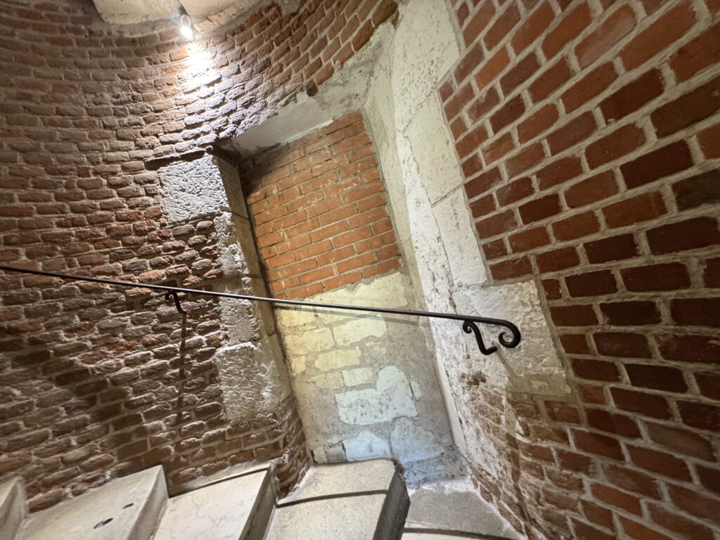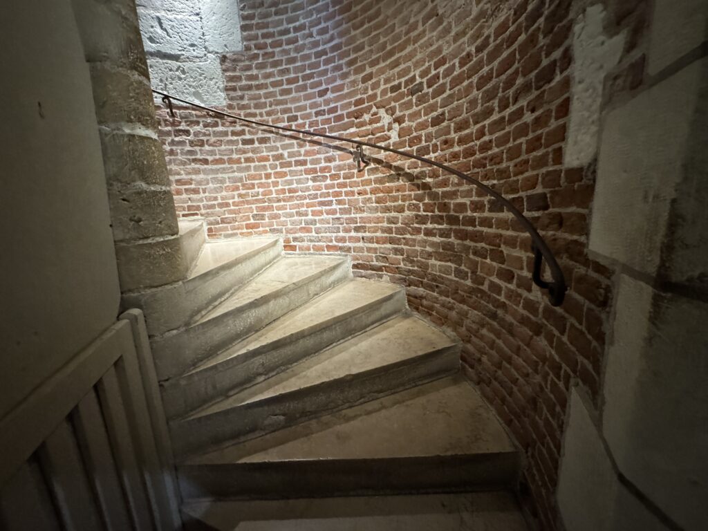 «По лестнице можно спуститься до рампы башни для проезда всадников, построенной в правление Карла VIII. Эта хитроумная винтообразная рампа позволяла лошадям и повозкам попадать на террасы замка Амбуаз из города. Император Карл V, прибывший в замок Амбуаз в декабре 1539 г. по приглашению короля Франциска I, въехал сюда именно таким образом, через другую башню — башню Эрто.