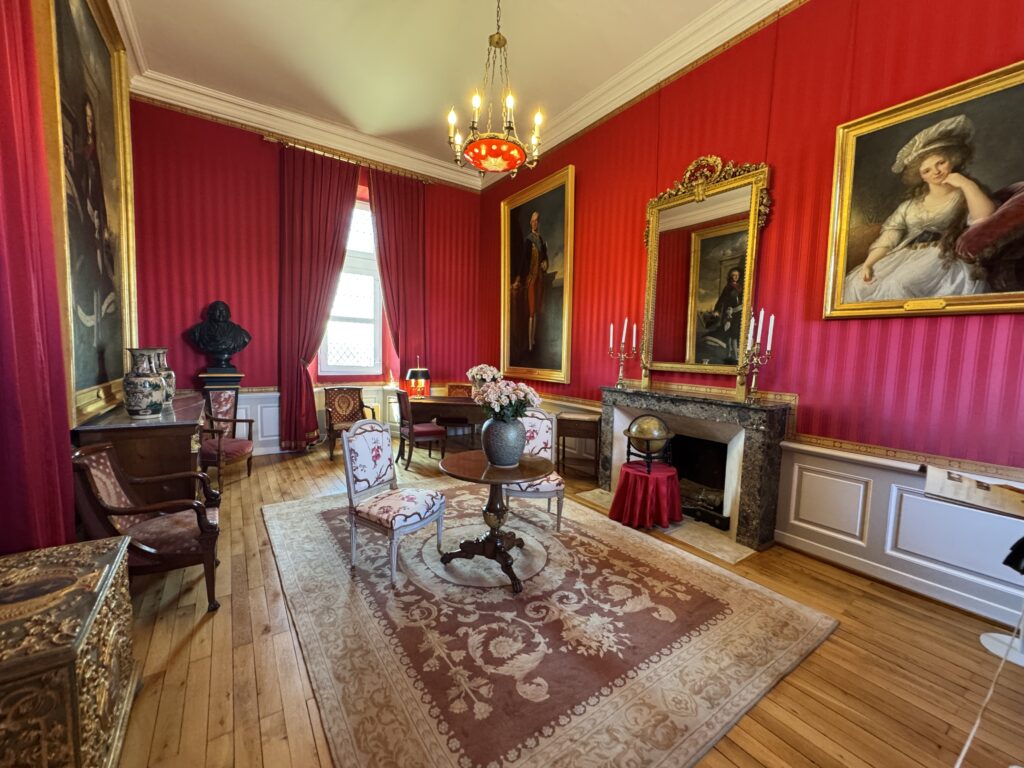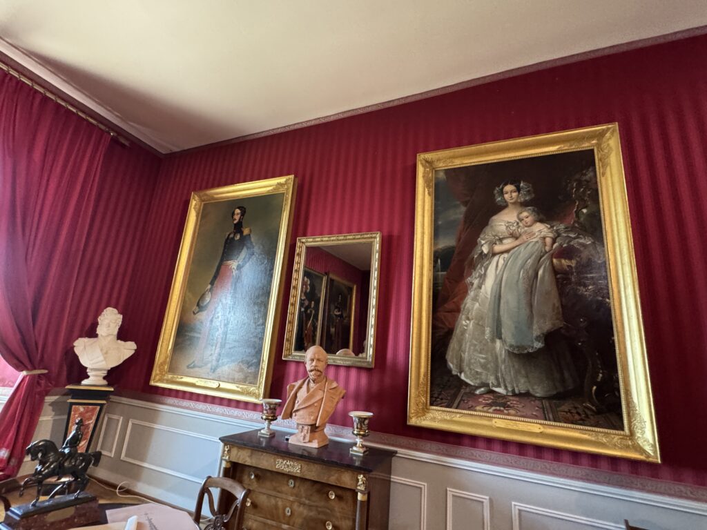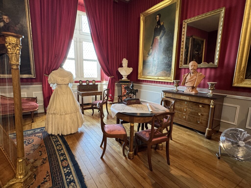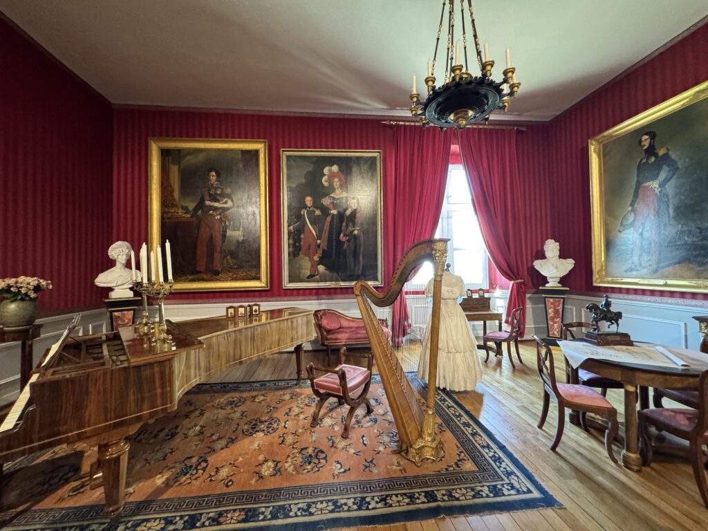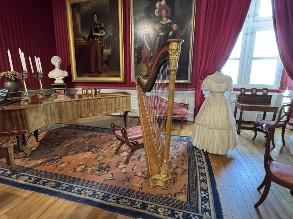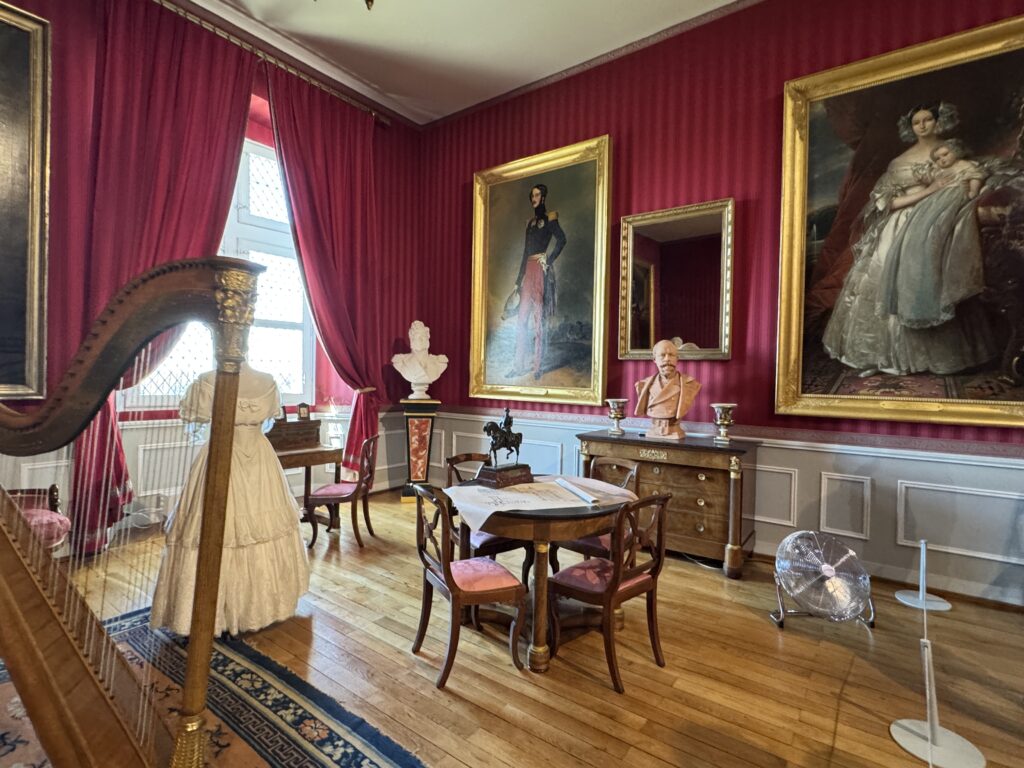 Портрет Франсуа Орлеанского, принца де Жуанвиль, 3-его сына Людовика — Филиппа I и Марии Амалии Неаполитанской. Портрет Франциски Браганса, принцессы де Жуанвиль, дочери императора Бразилии Педру I (короля Португалии Педру IV). Секретер эпохи Реставрации. Рояль «Эрар», отделанный фанеровкой из палисандра Рио (XIX век), Арфа «Эрар» (XIX век).