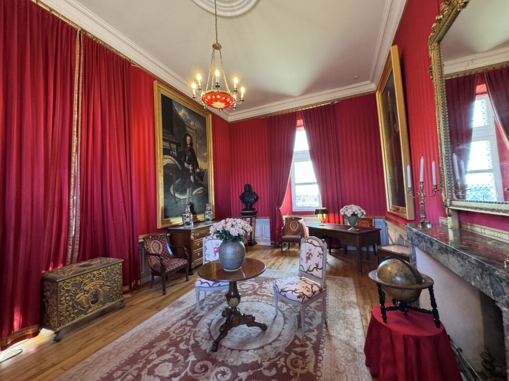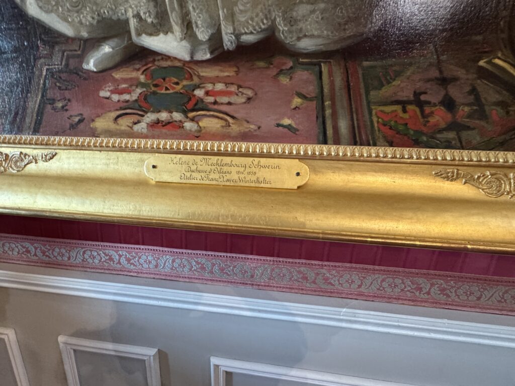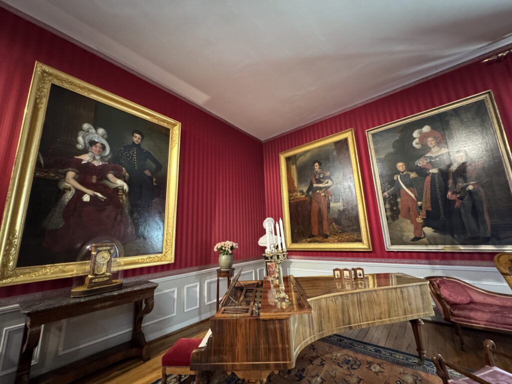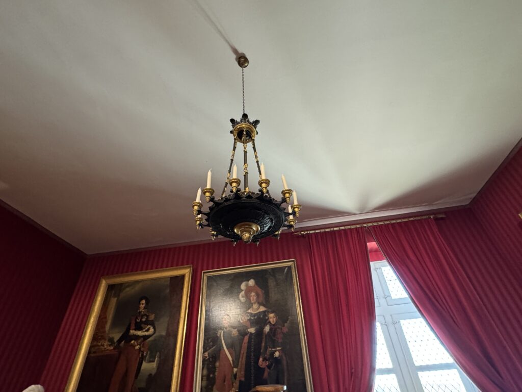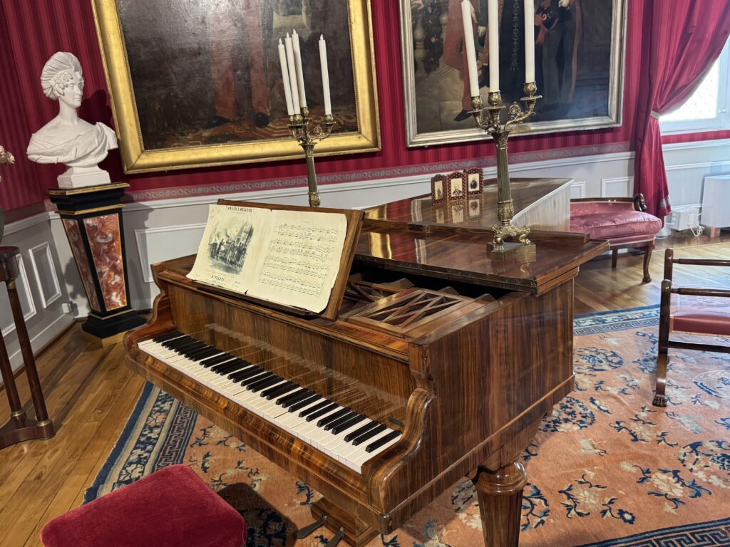 Портрет Франсуа Орлеанского, принца де Жуанвиль, 3-его сына Людовика — Филиппа I и Марии Амалии Неаполитанской. Портрет Франциски Браганса, принцессы де Жуанвиль, дочери императора Бразилии Педру I (короля Португалии Педру IV). Секретер эпохи Реставрации. Рояль «Эрар», отделанный фанеровкой из палисандра Рио (XIX век), Арфа «Эрар» (XIX век).