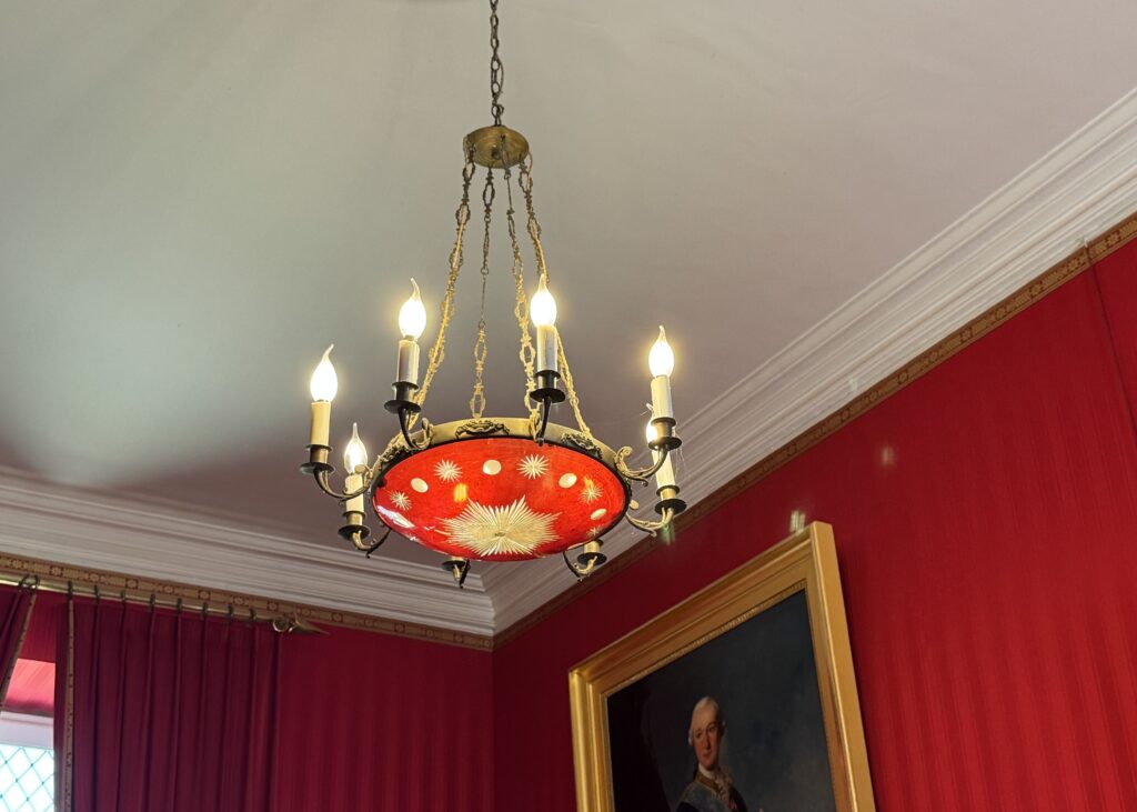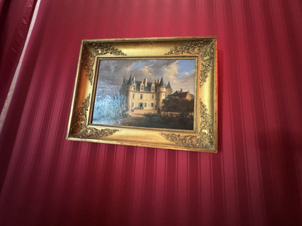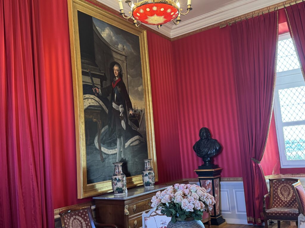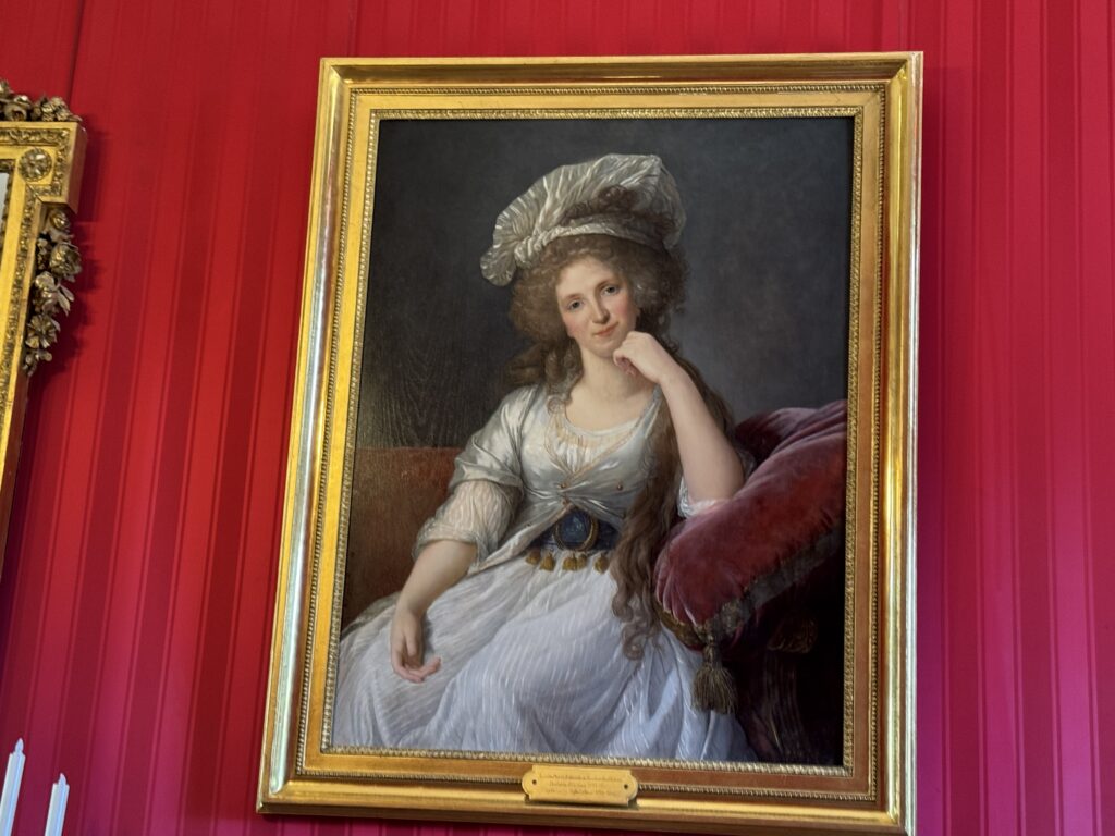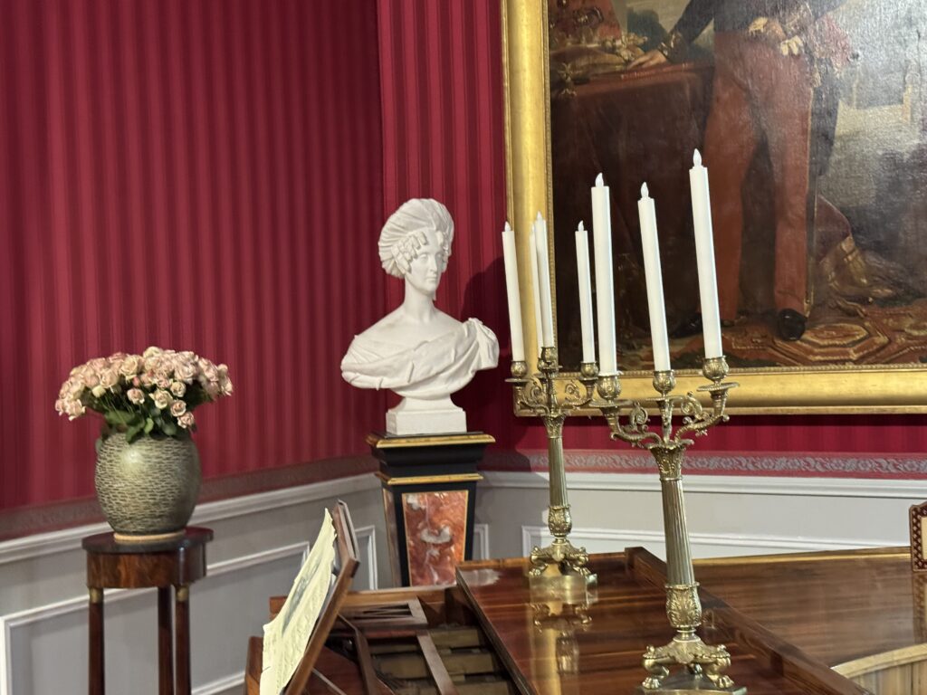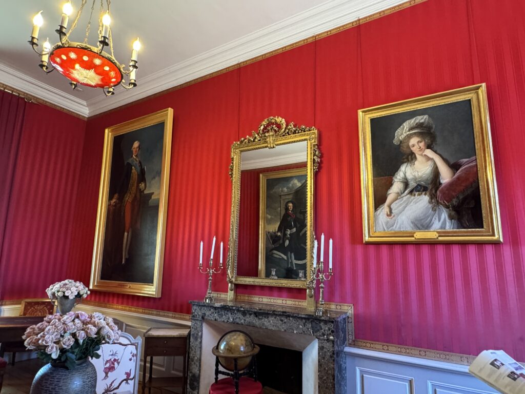 Портрет Франсуа Орлеанского, принца де Жуанвиль, 3-его сына Людовика — Филиппа I и Марии Амалии Неаполитанской. Портрет Франциски Браганса, принцессы де Жуанвиль, дочери императора Бразилии Педру I (короля Португалии Педру IV). Секретер эпохи Реставрации. Рояль «Эрар», отделанный фанеровкой из палисандра Рио (XIX век), Арфа «Эрар» (XIX век).