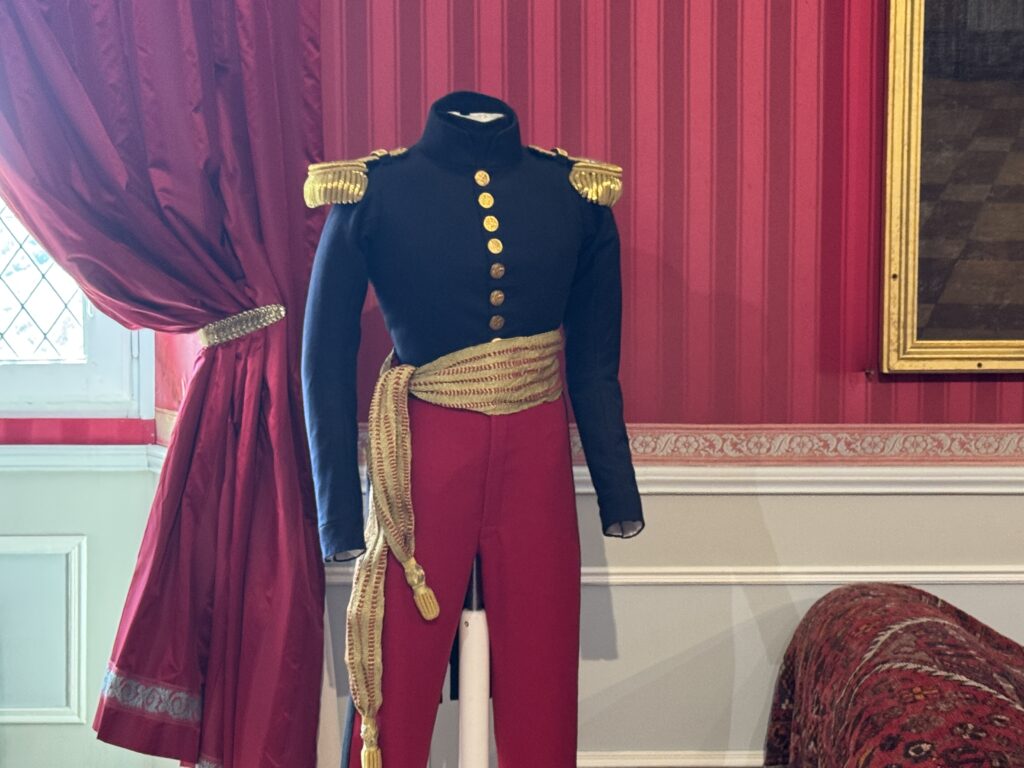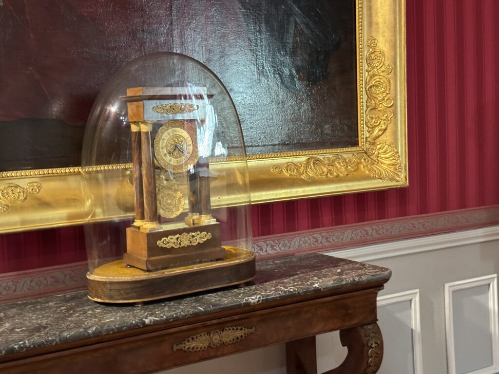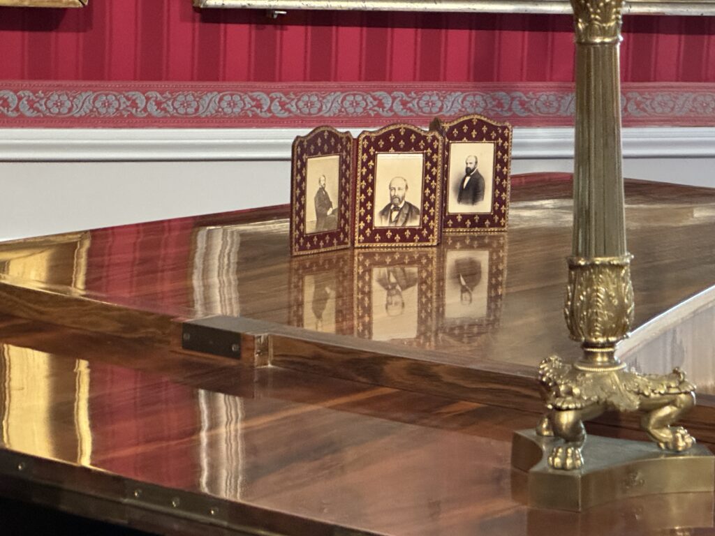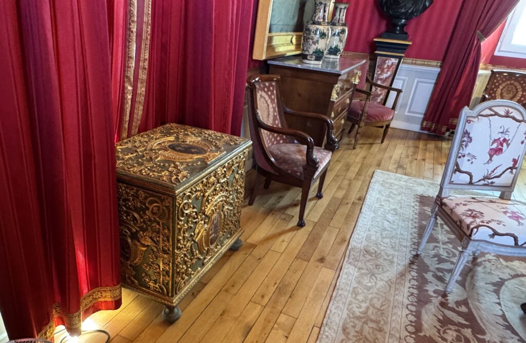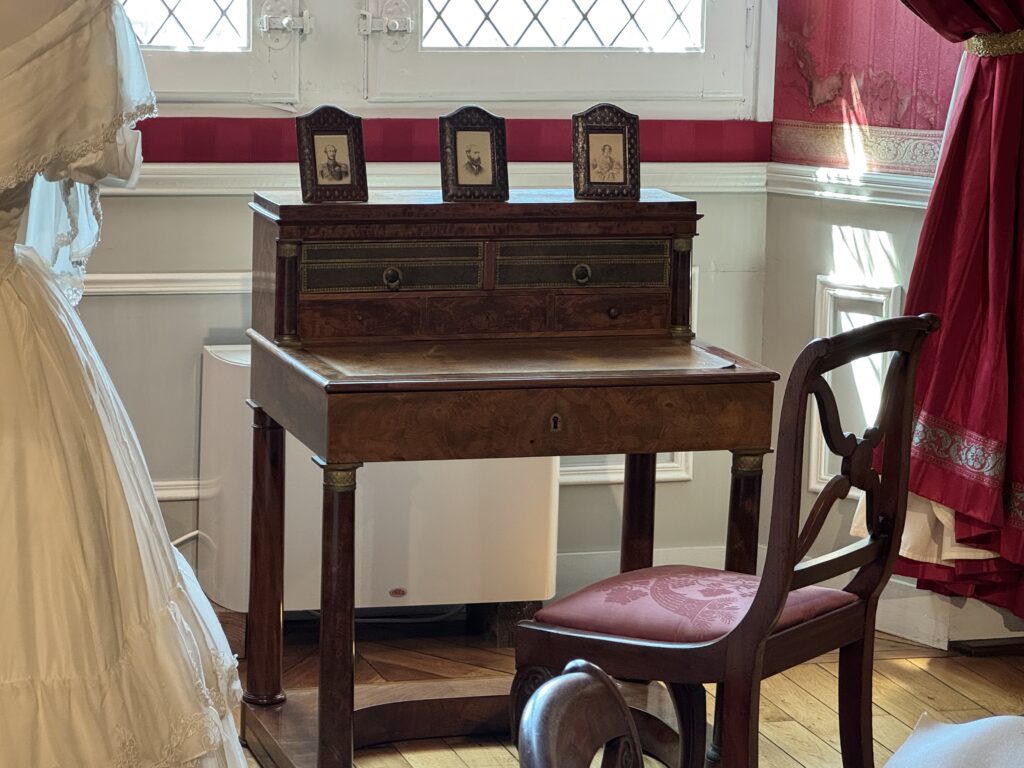 Парадный портрет Луи-Филиппа I (на верхнем фото слева), мебель в стиле «Louis-Philippe»: шкафчик красного дерева, стулья с решетчатыми крестовидными спинками. Мебель в стиле Ампир: кровать с изогнутыми боковинами в форме лодки («рекамье»); секретер; столик на основании с четырьмя массивными ножками; деревянный комод с накладками из красного дерева; дамский секретер.