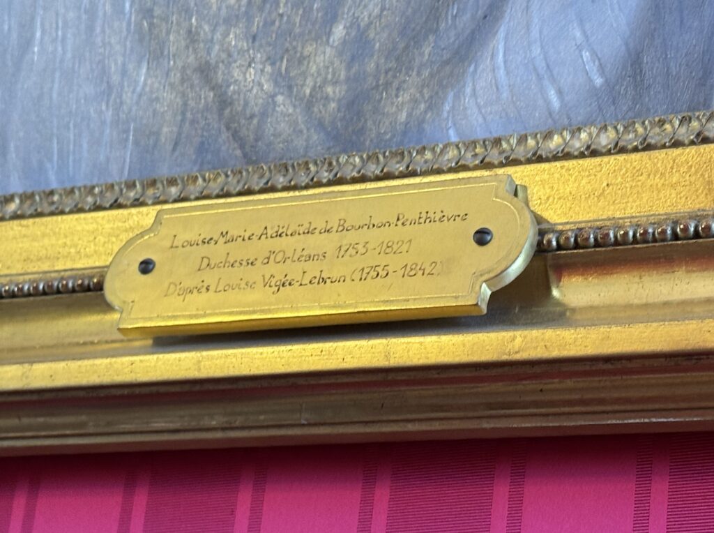 Портрет Людовика — Филиппа-Иозефа Орлеанского, именуемого «Филипп Эгалите», отца Louis-Philippe I. Портрет (справа от камина) Аделаиды де Бурбон-Пентьеврской, герцогини Орлеанской, вдовы, унаследовавшей замок Амбуаз в 1793 году. Копия портрета кисти Луизы Виже-Лебрен. Кресла в стиле Ампир. Гравюры Риго, изображающие замок Амбуаз примерно в 1740 г., из книги «Королевские дома Франции». Стулья с китайским рисунком XVIII в. мастерской Буляр по сторонам камина. Они были изготовлены для замка Амбуаз (около 1787-89 гг.) по заказу герцога Пентьеврского.»