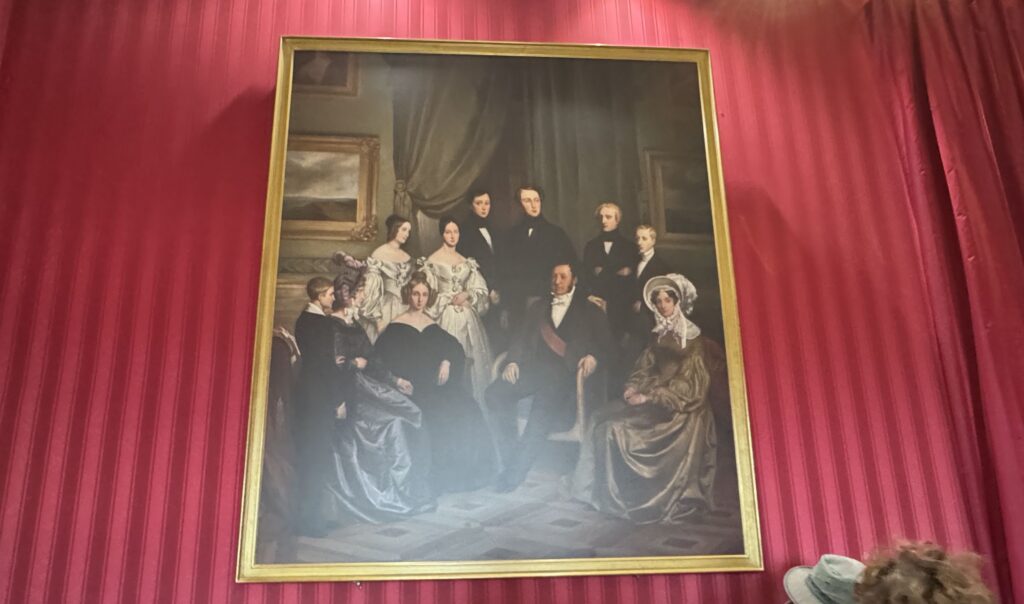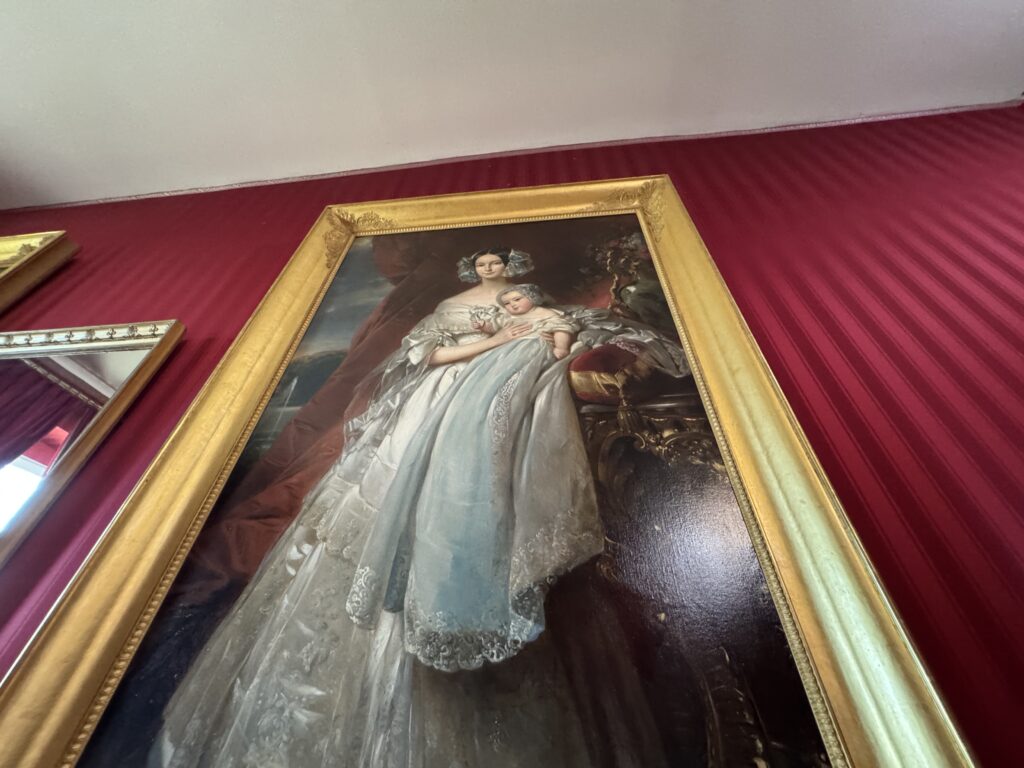 Портрет королевы Марии-Амалии (1782-1866), супруги Луи-Филиппа, с двумя сыновьями — герцогом Омальским и герцогом Монпансье. Бюсты королевы Марии-Амалии (1782-1866) и Аделаиды (1777-1847), сестры короля. Канапе в стиле Ампир, стулья красного дерева с перекладиной на спинке, помеченные клеймом мастерской Жакоба. Картина с изображением дворца замка, вид из сада в XIX веке, работы Гюстава Ноэля»
