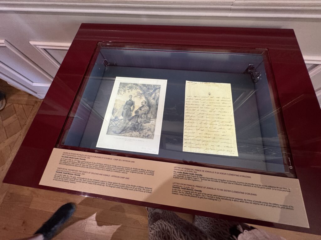 «Сверху рампы для проезда всадников расположена Омальская галерея. Она носит имя 5-го сына короля Луи-Филиппа герцога Омальского (1822-1897), владельца замка с 1895 г. Будучи военным и политическим деятелем, он был еще и крупным меценатом, положившим начало самой крупной во Франции частной коллекции древних книг и искусства, сегодня собранной в замке Шантийи и курируемой Институтом Франции.