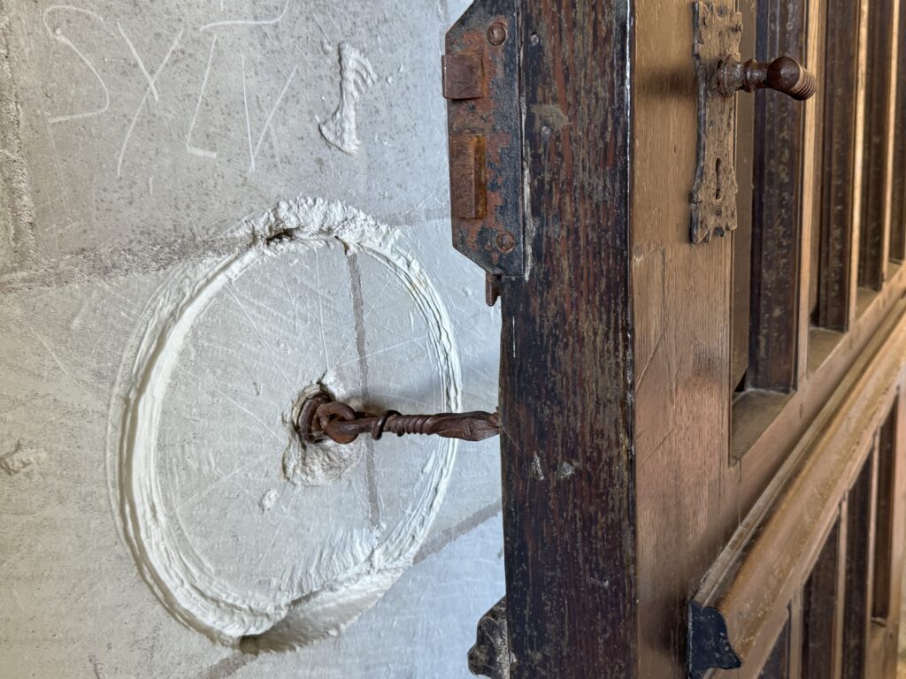 — Деревянная дверь со стороны двора, выходящая на внешнюю навесную галерею (не сохранилась), которая обслуживала прилегающие помещения и внешнюю винтовую лестницу.
