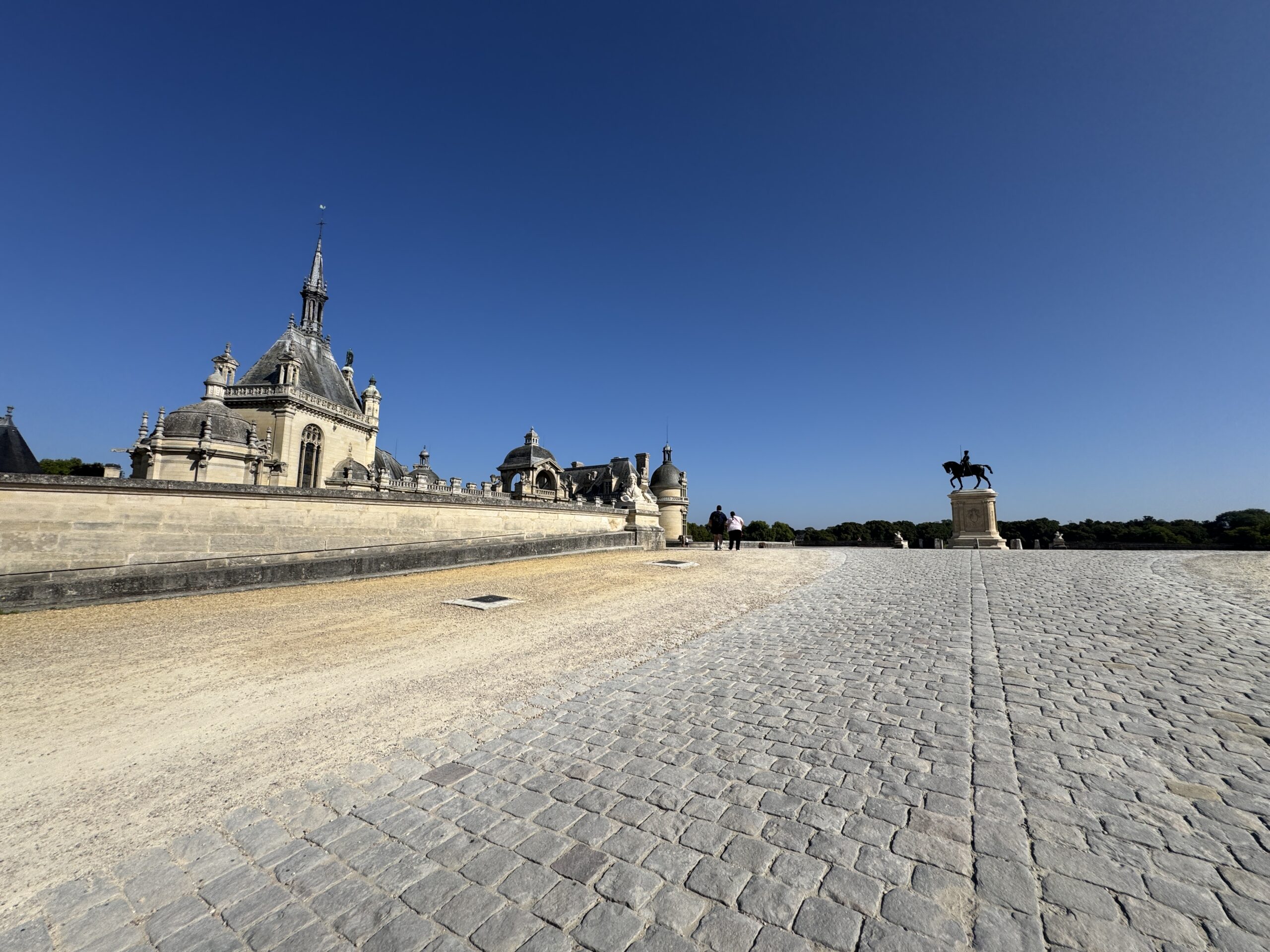 Вид на королевские конюшни с большой парковки Шантийи. Несомненное достоинство парковки — непосредственное и необязательное во Франции существование — несколько омрачается, если у вас на машине есть устройство для того, чтобы платить автоматически. Для нашей машины шлагбаум открылся самостоятельно, вернее — он не закрылся после предыдущей машины, владелец которой платил картой. В итоге билета мы не получили, а поменять полосу было невозможно, сзади стояла очередь. Предупреждений про такую ситуацию не было даже на французском. Так что до конца дня мы не знали, как же мы будем выезжать обратно, если оплата не прошла. Ведь, в отличие от Испании, во Франции каждый терминал, парковка, шлагбаум не оснащены живым человеком, объясняющим, как это работает. И примерно вот столько от парковки до первого музейного человека: