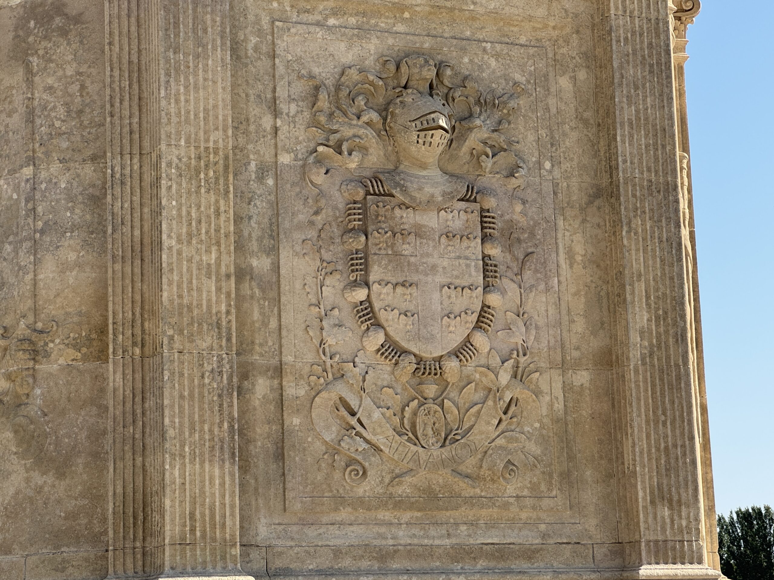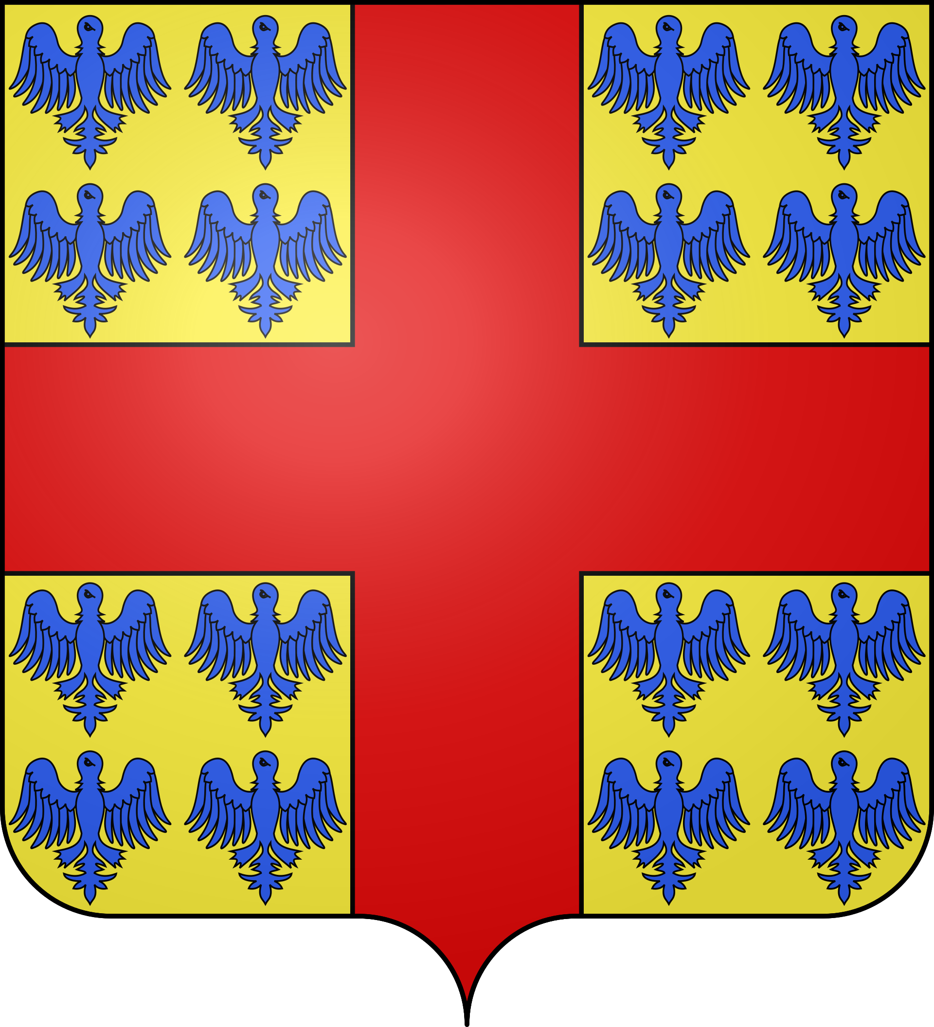 Герб Анна Монморенси. Гербы рода отличаются во времени, изменяются некоторые детали. Здесь мы видим щит с (геральдическими мистическими птицами, появившимися во времена крестовых походов) 16 синими малыми алерионами и красным крестом (крест святого Георгия, символ христианского рыцарства), а также цепь ордена св. Михаила (ордена, созданного из соображений романтики и политики, о возникновении и бытовании котором рассказывалось в тексте про замок Амбуаз). Золотой фон щита — символ дворянства. ΑΠΛΑΗΟΣ — безупречный. Дубовые листья — вечность и стойкость. Голова собаки — верность. Шлем-армэ — высокий социальный статус, древность и знатность рода.