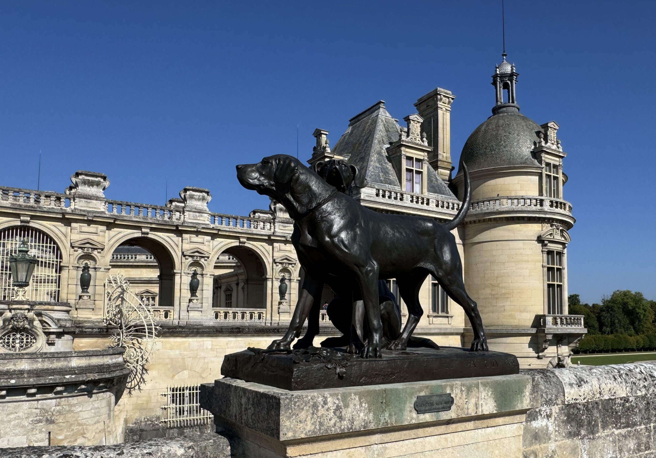 «Нас приветствуют памятники 4 охотничьим собакам, заказанные герцогом Омальским у Огюста Каэна, одного из лучших скульпторов-анималистов XIX века. Гипсовая модель этих гончих была представлена на Салоне 1881 года. На боках у собак — знак стаи Конде: прямоугольный треугольник, символизирующий королевскую геральдическую лилию Бурбонов, с полосатым посохом в центре, характерным для младшей ветви рода Конде. На постаменте есть имена гончих: FANFARAUT и BRILLADOR, LUMINEAU и SEDUISANT. (В начале августа 2025 года) они были отреставрированы»…