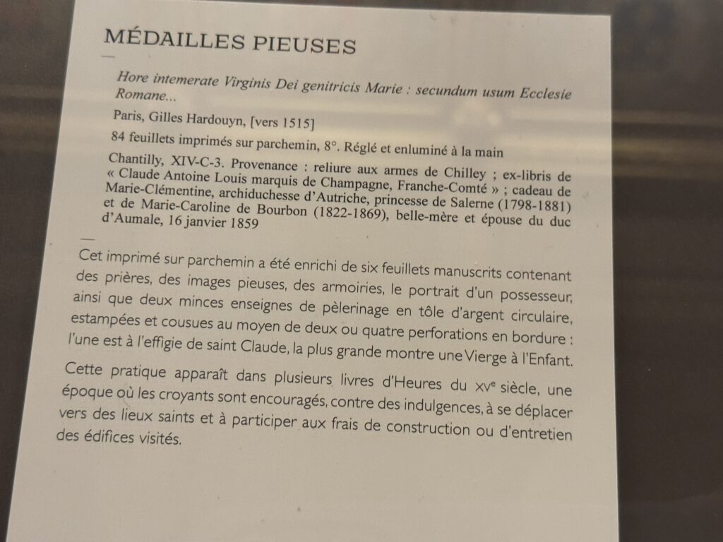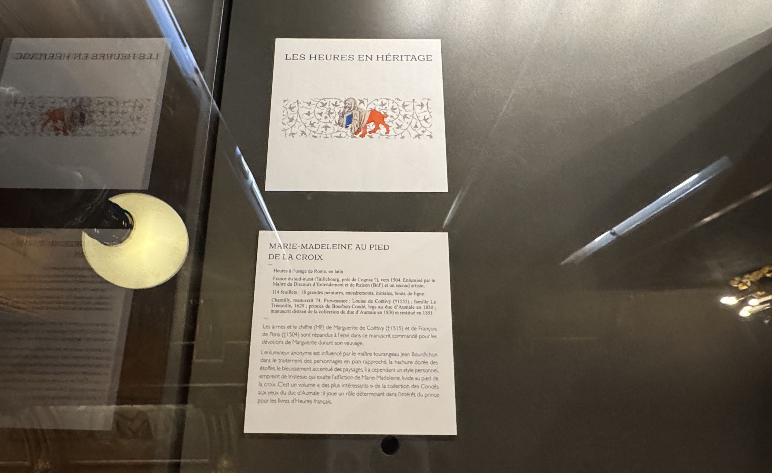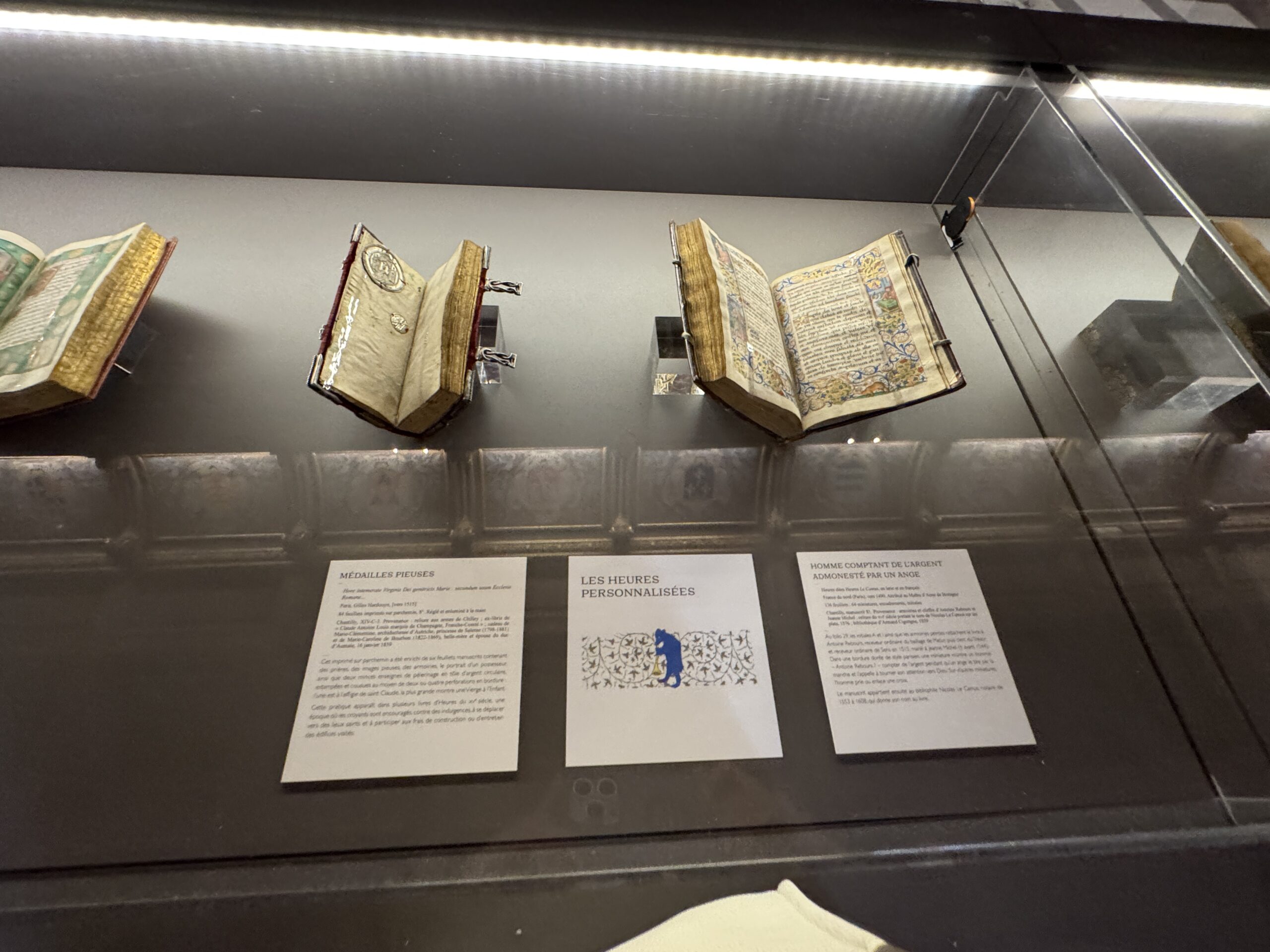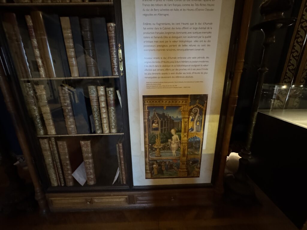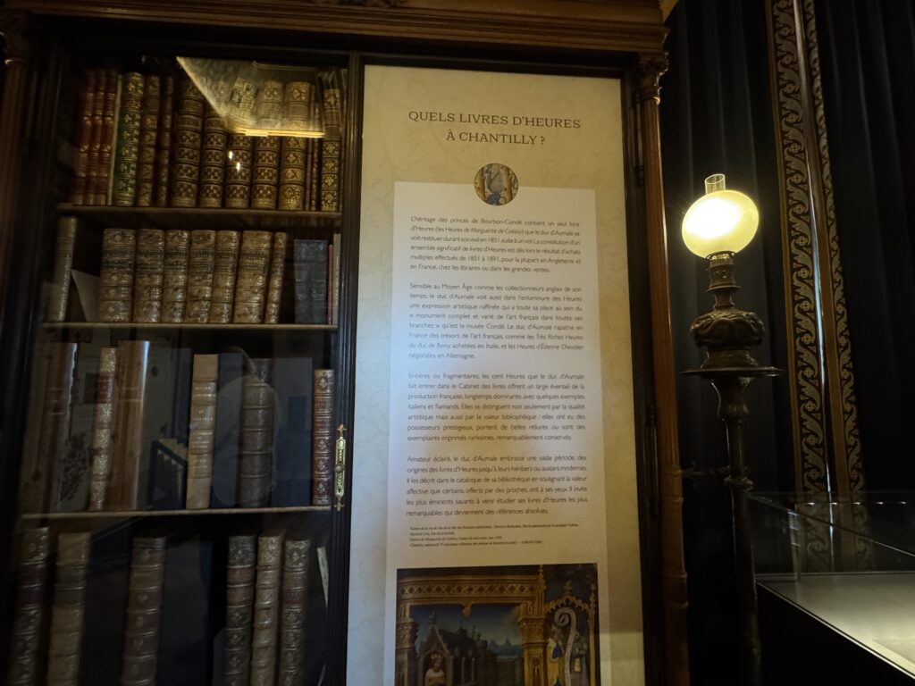 «Временная выставка книг, которая закончится 5 октября 2025 года «Une autre histoire de livres d’heures» («Другая история часослова»). Сопровождая выставку в зале для игры в мяч («Jeu de Paume»), посвящённую знаменитому «Великолепному часослову» герцога Беррийского, Кабинет книг представляет значительную коллекцию из сорока рукописных и печатных часослов, охватывающих период с XII века до конца XIX века. Коллекция герцога Омальского позволяет посетителям открыть для себя другую историю часослова – историю первого бестселлера в истории книг, верно отражающего глубокие духовные, художественные и технологические революции прошлых веков»…