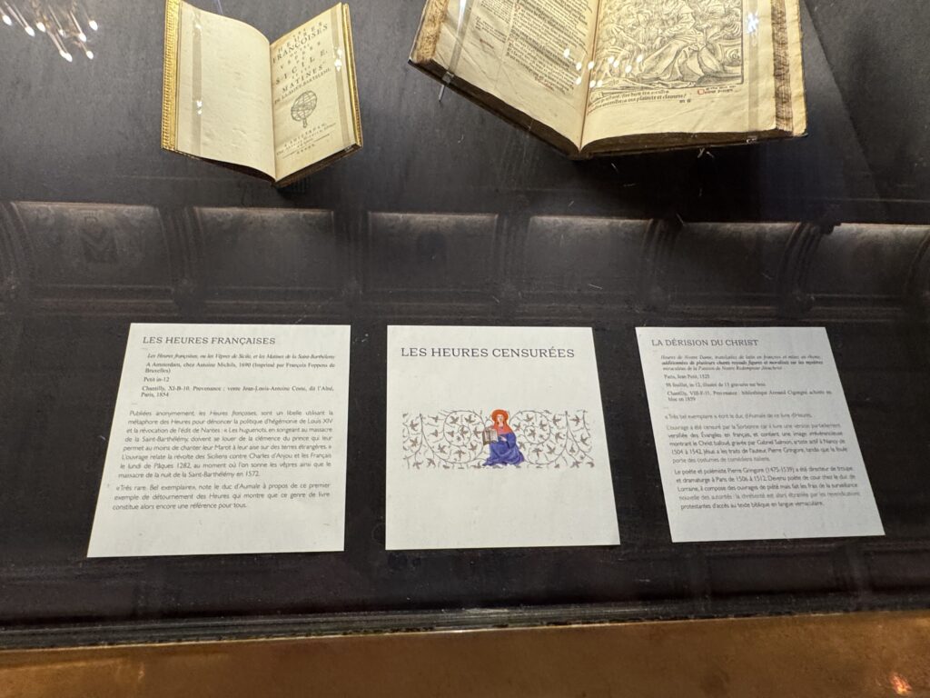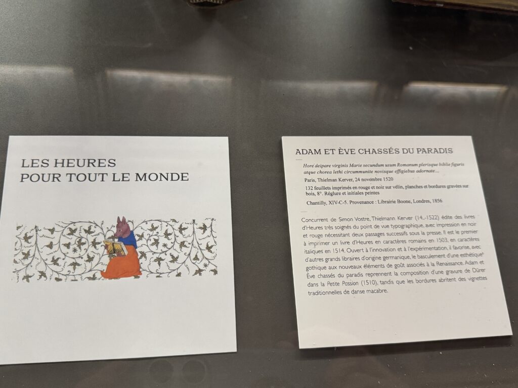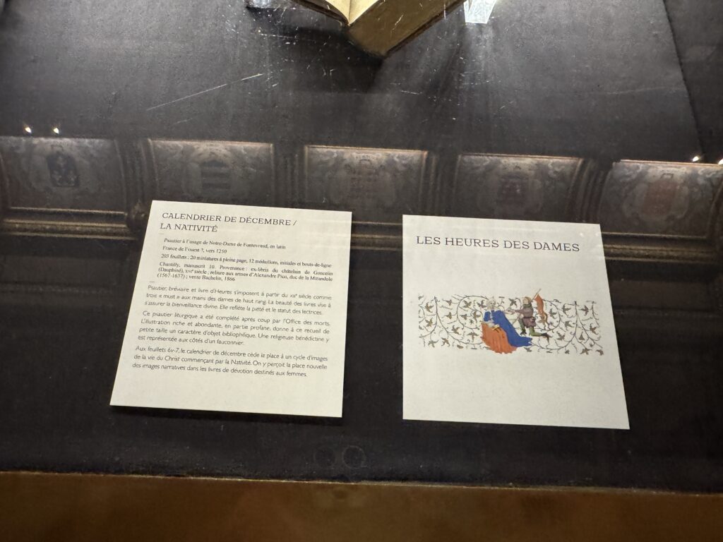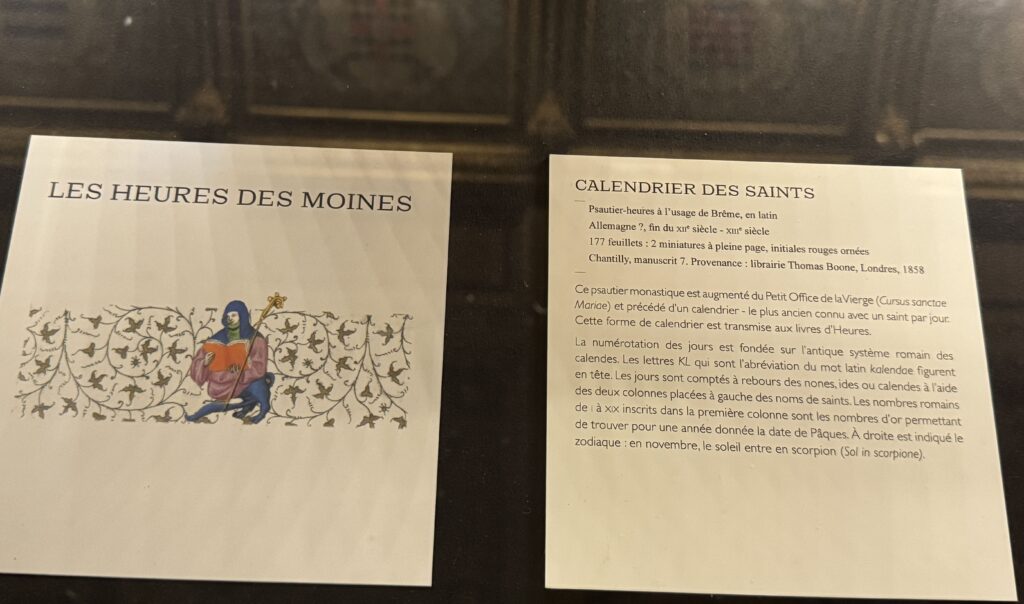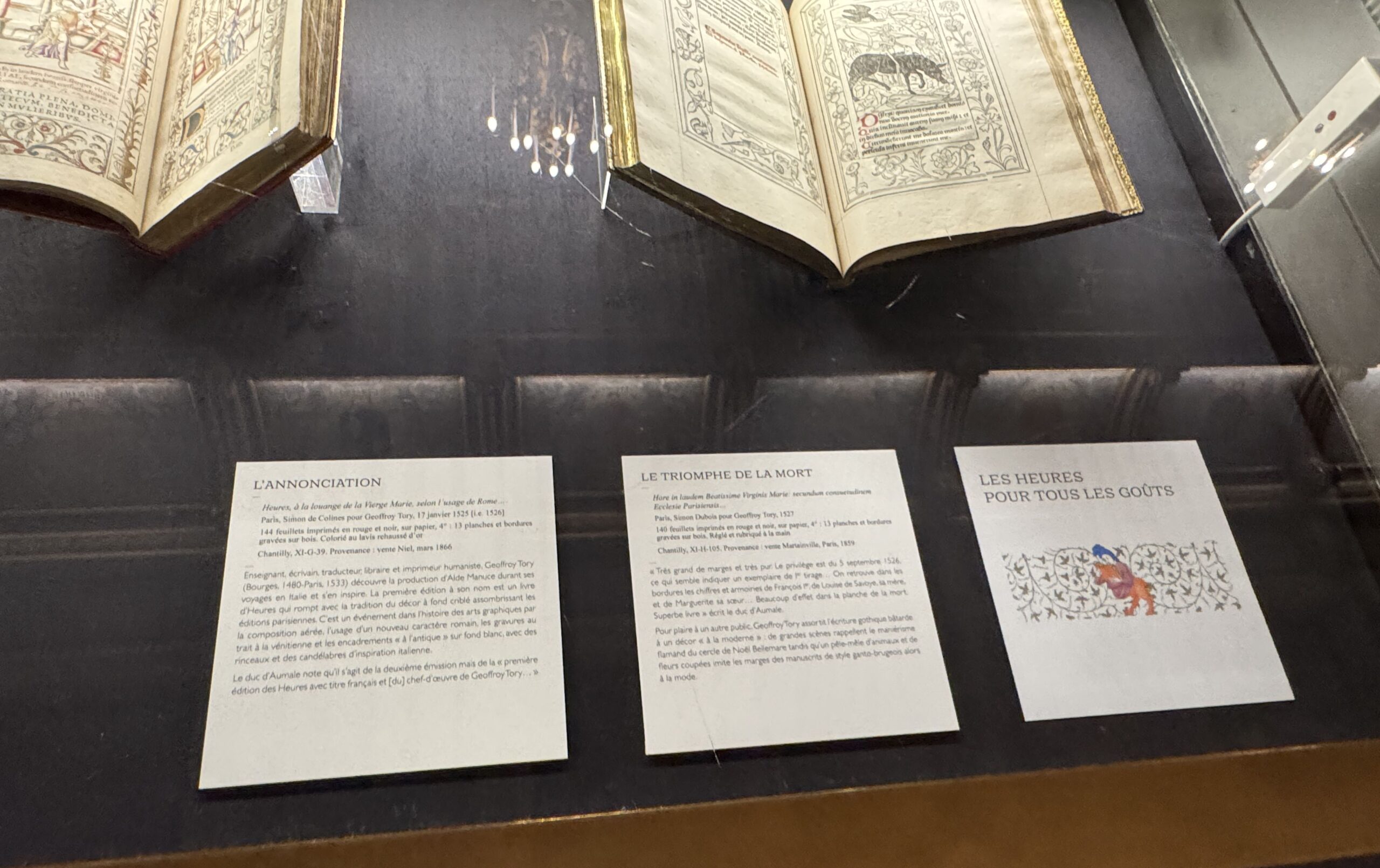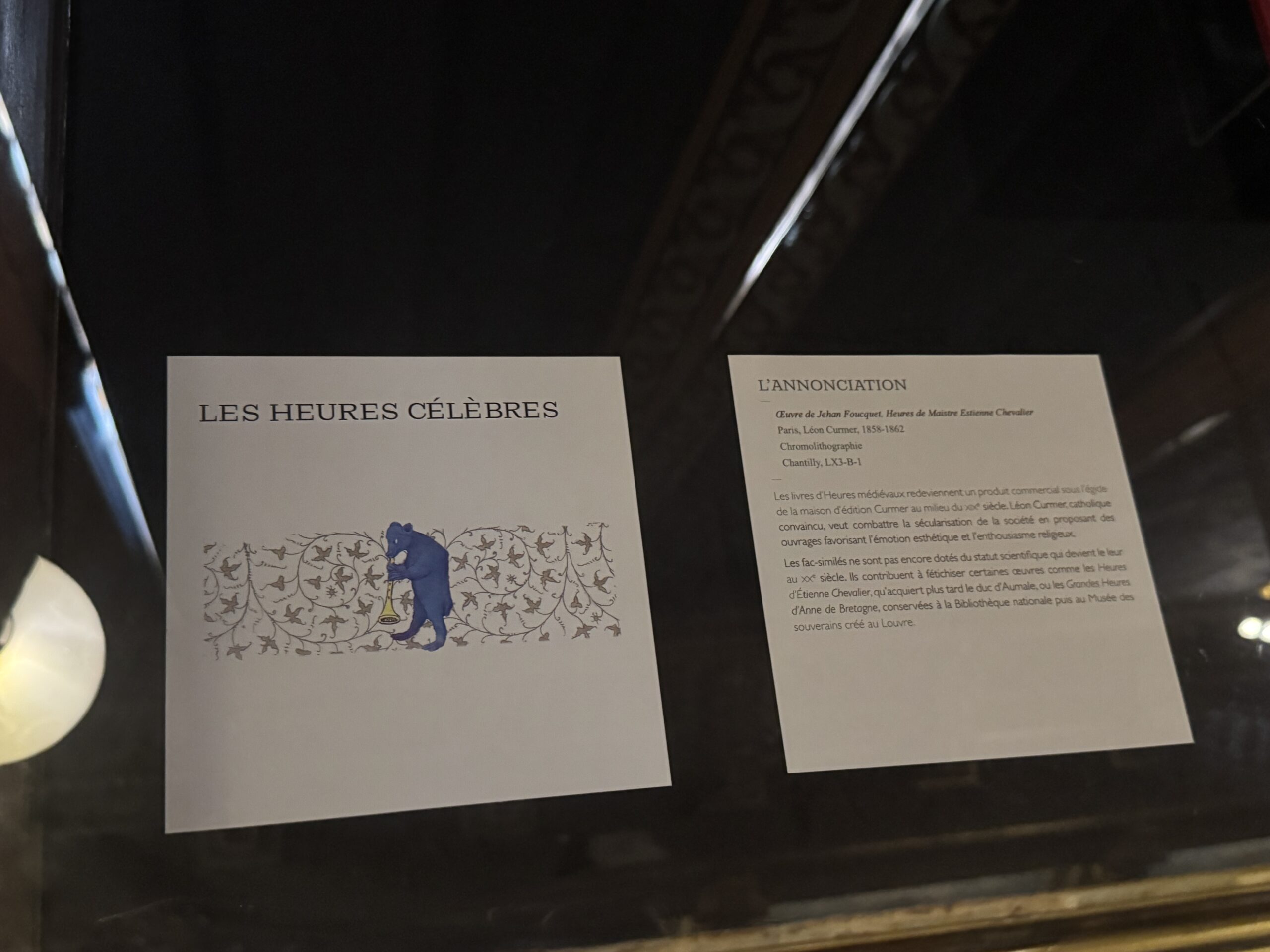 «Временная выставка книг, которая закончится 5 октября 2025 года «Une autre histoire de livres d’heures» («Другая история часослова»). Сопровождая выставку в зале для игры в мяч («Jeu de Paume»), посвящённую знаменитому «Великолепному часослову» герцога Беррийского, Кабинет книг представляет значительную коллекцию из сорока рукописных и печатных часослов, охватывающих период с XII века до конца XIX века. Коллекция герцога Омальского позволяет посетителям открыть для себя другую историю часослова – историю первого бестселлера в истории книг, верно отражающего глубокие духовные, художественные и технологические революции прошлых веков»…