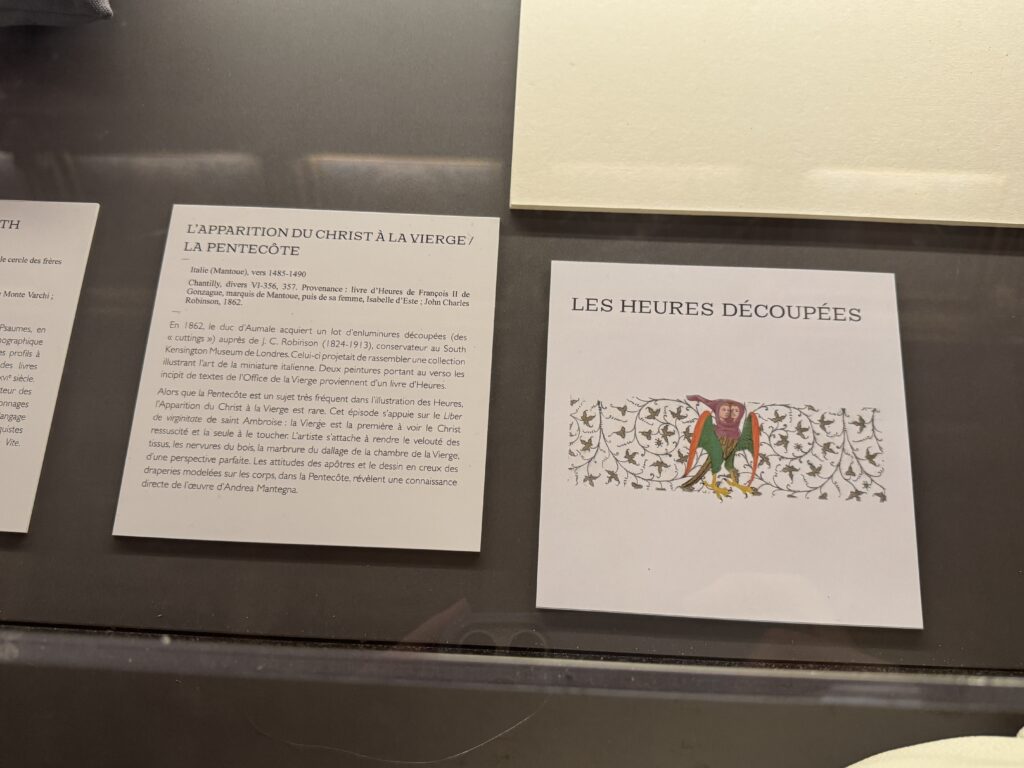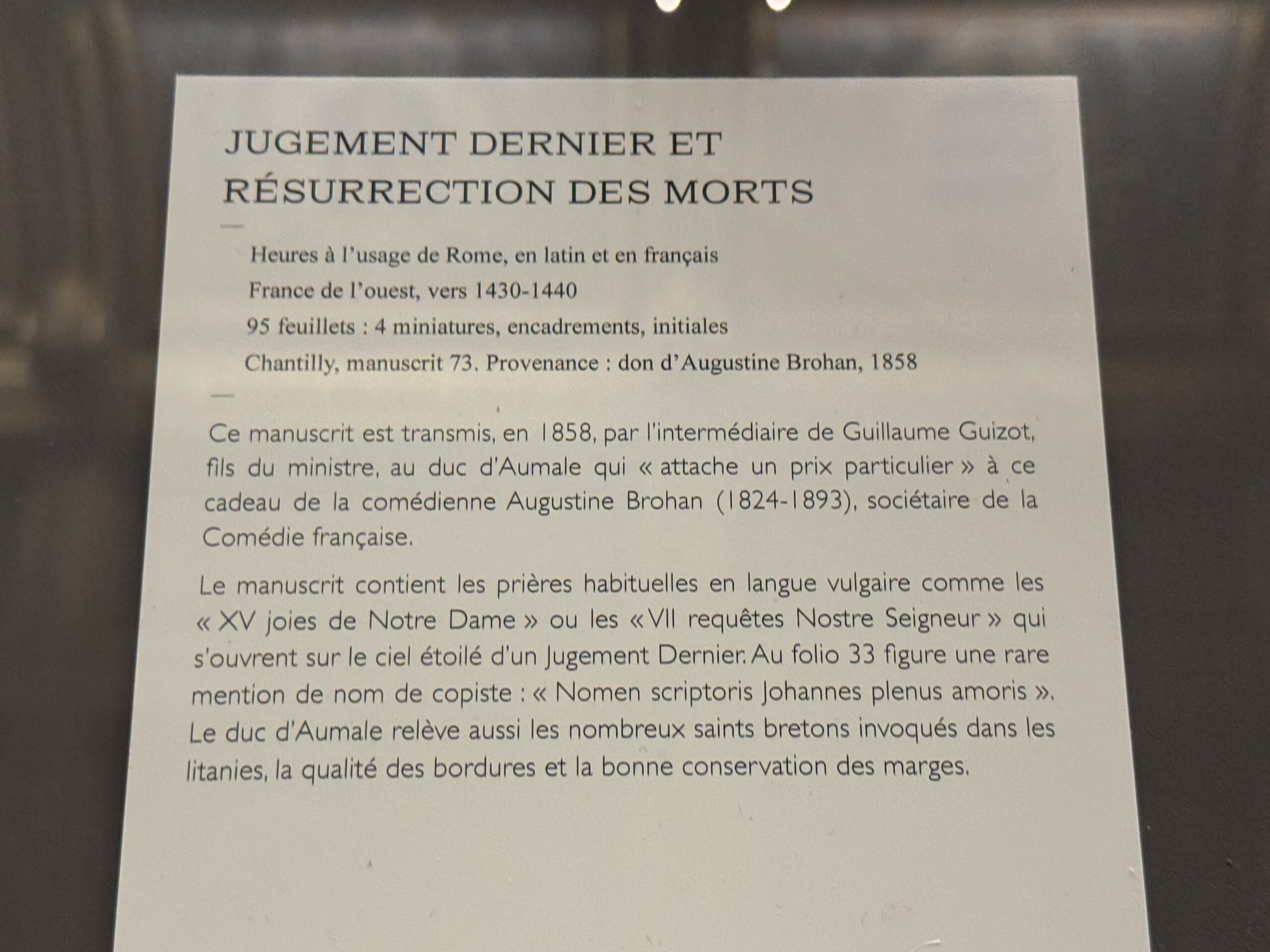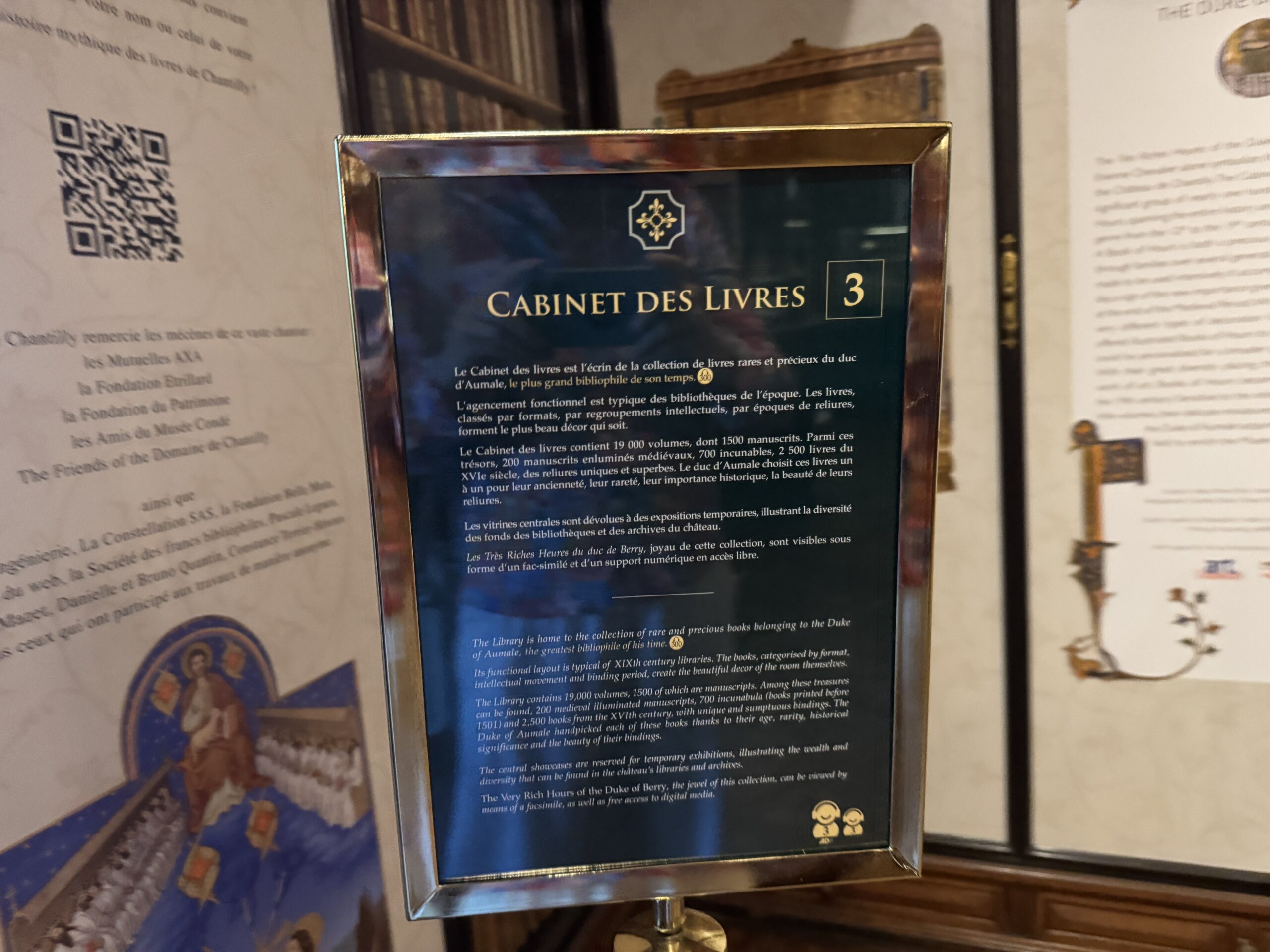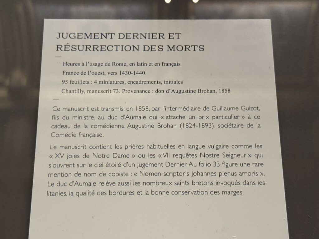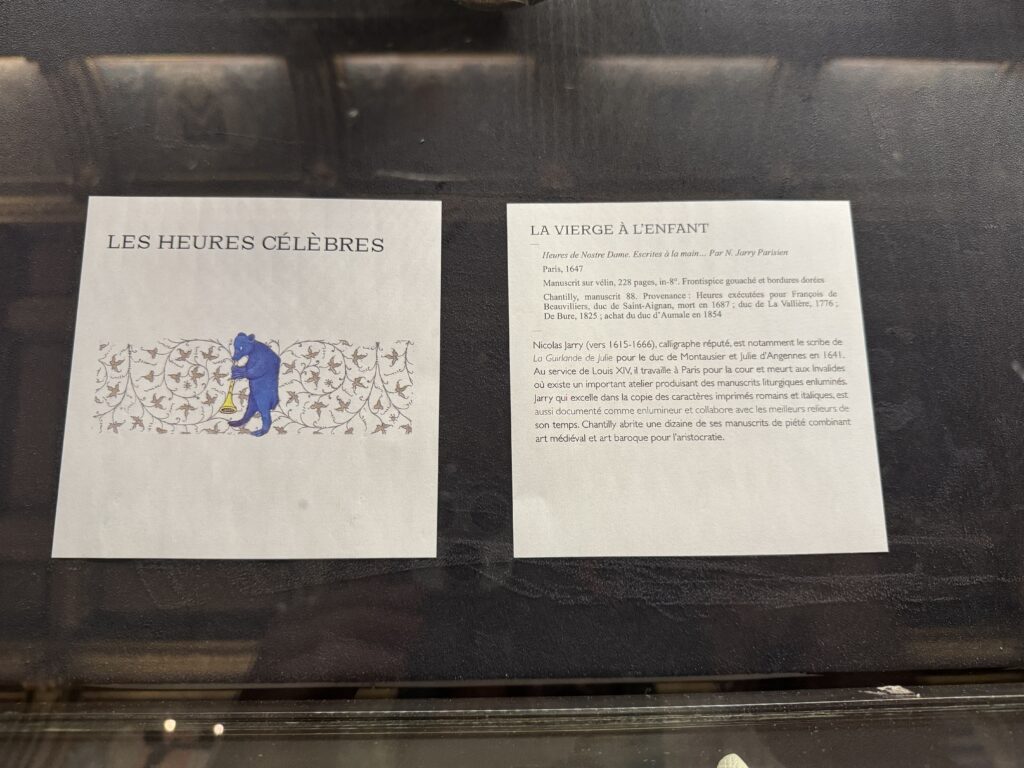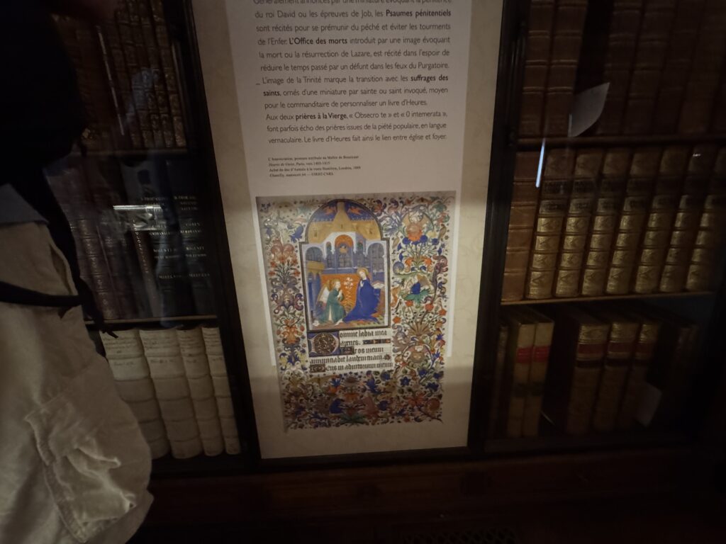 «Временная выставка книг, которая закончится 5 октября 2025 года «Une autre histoire de livres d’heures» («Другая история часослова»). Сопровождая выставку в зале для игры в мяч («Jeu de Paume»), посвящённую знаменитому «Великолепному часослову» герцога Беррийского, Кабинет книг представляет значительную коллекцию из сорока рукописных и печатных часослов, охватывающих период с XII века до конца XIX века. Коллекция герцога Омальского позволяет посетителям открыть для себя другую историю часослова – историю первого бестселлера в истории книг, верно отражающего глубокие духовные, художественные и технологические революции прошлых веков»…