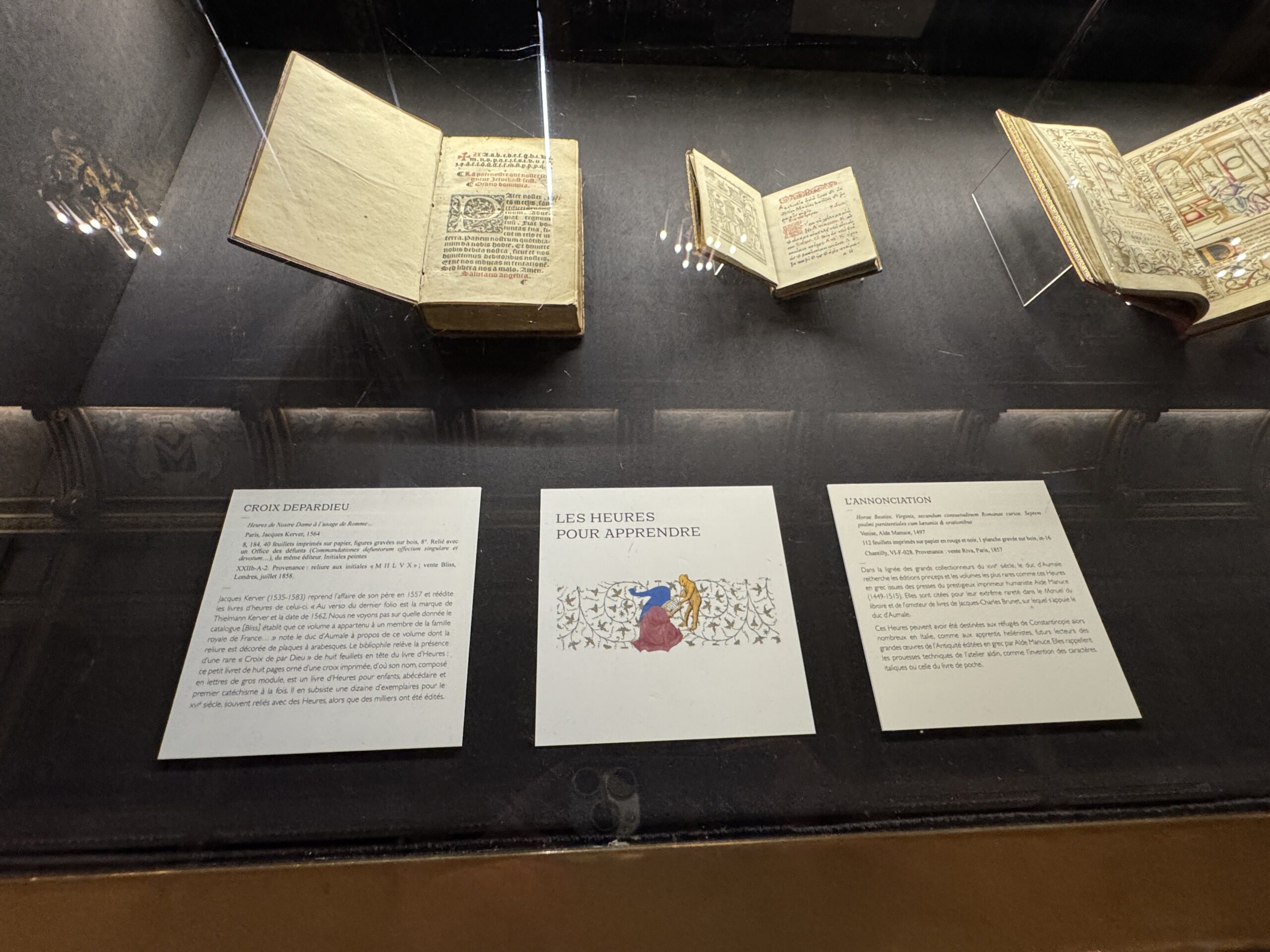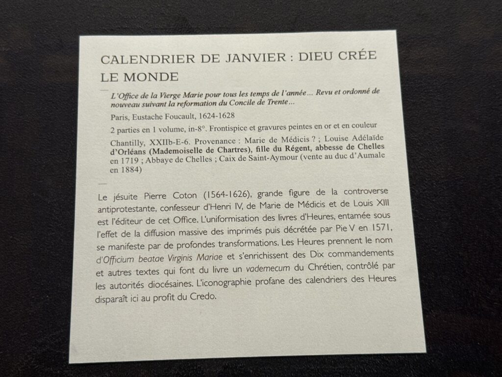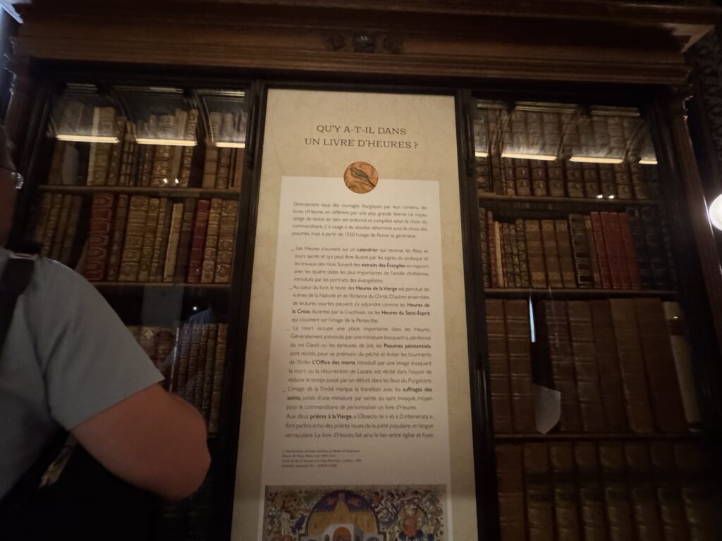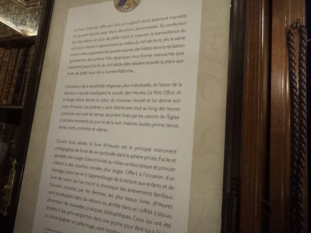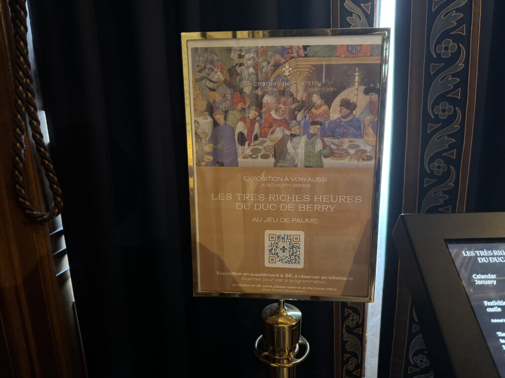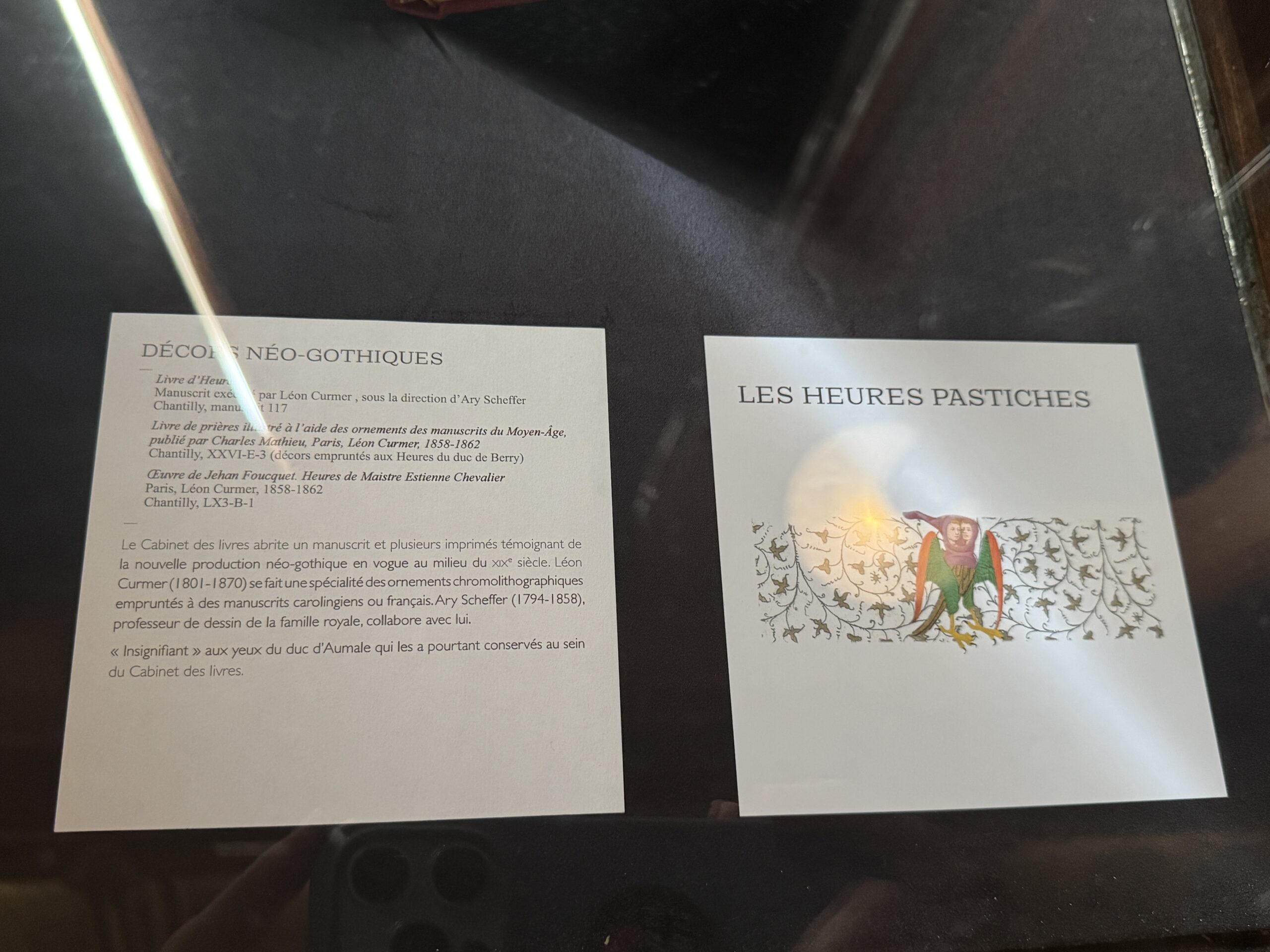 «Временная выставка книг, которая закончится 5 октября 2025 года «Une autre histoire de livres d’heures» («Другая история часослова»). Сопровождая выставку в зале для игры в мяч («Jeu de Paume»), посвящённую знаменитому «Великолепному часослову» герцога Беррийского, Кабинет книг представляет значительную коллекцию из сорока рукописных и печатных часослов, охватывающих период с XII века до конца XIX века. Коллекция герцога Омальского позволяет посетителям открыть для себя другую историю часослова – историю первого бестселлера в истории книг, верно отражающего глубокие духовные, художественные и технологические революции прошлых веков»…