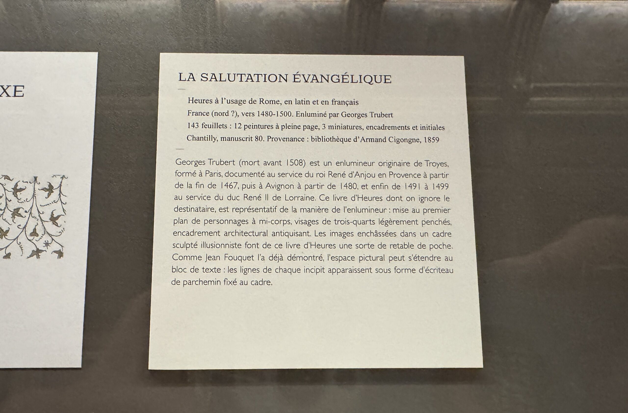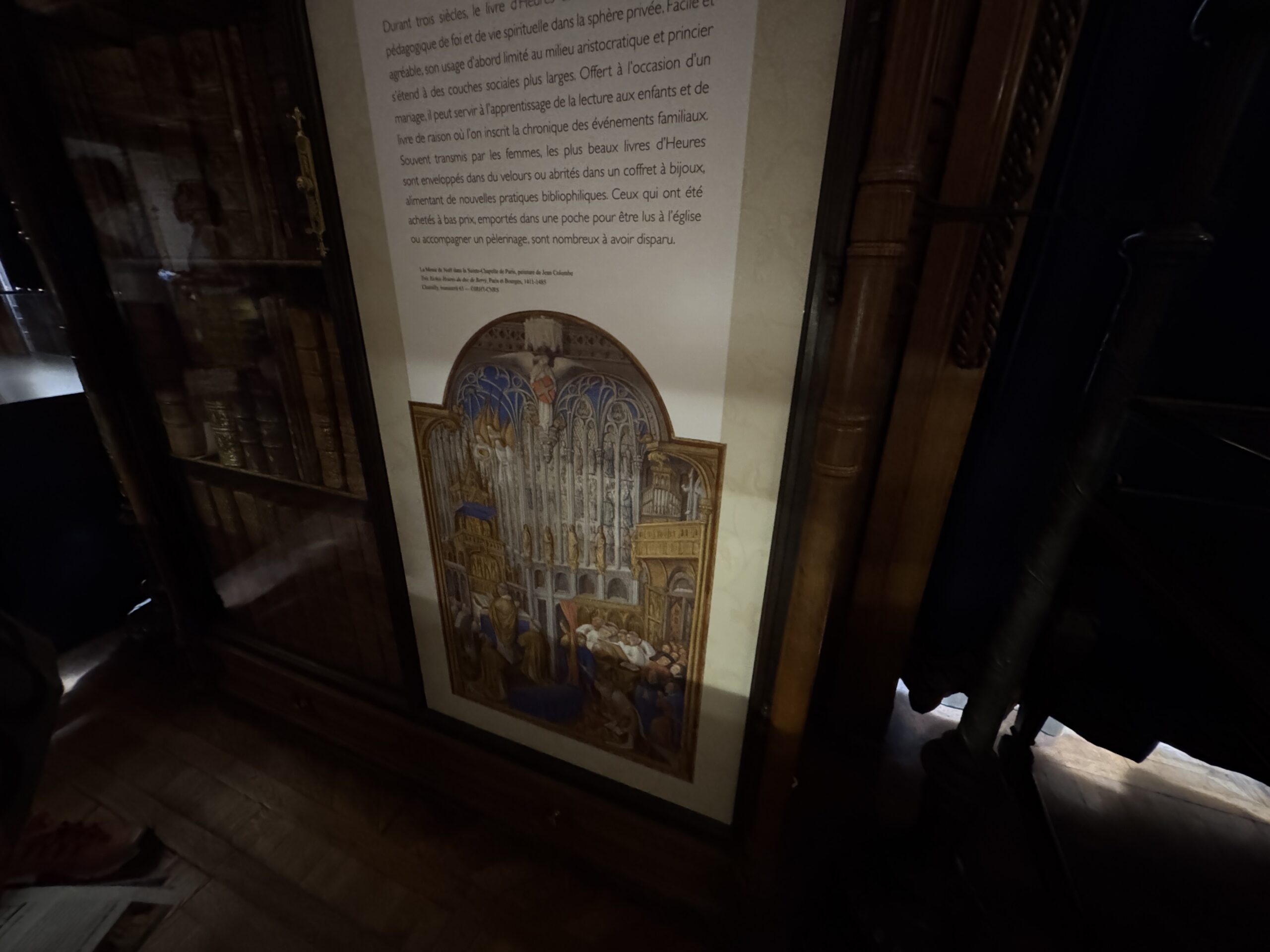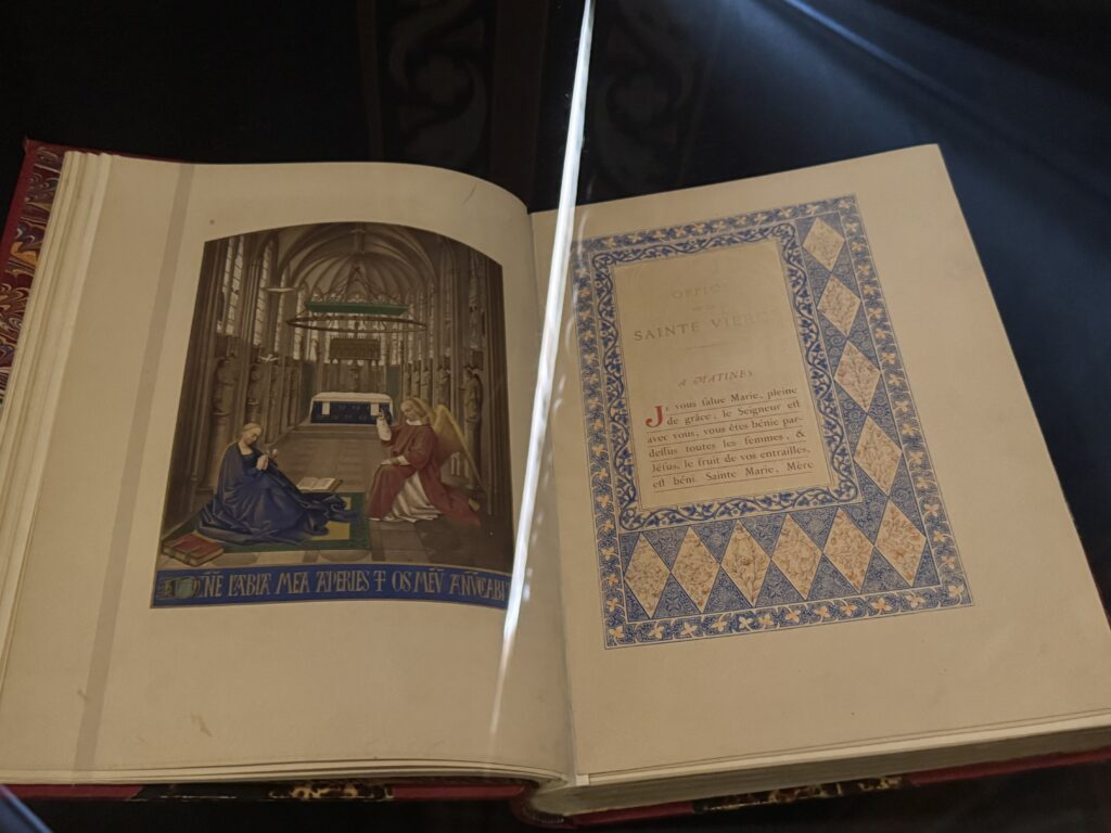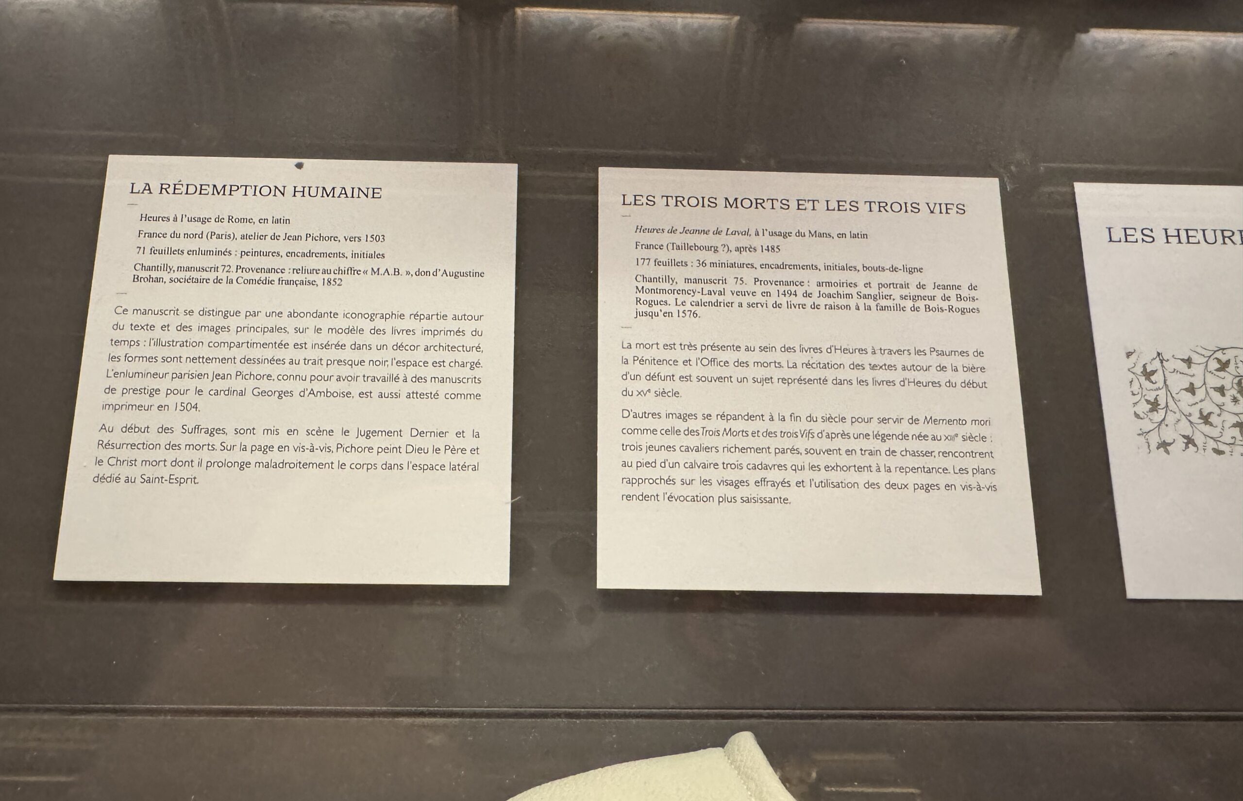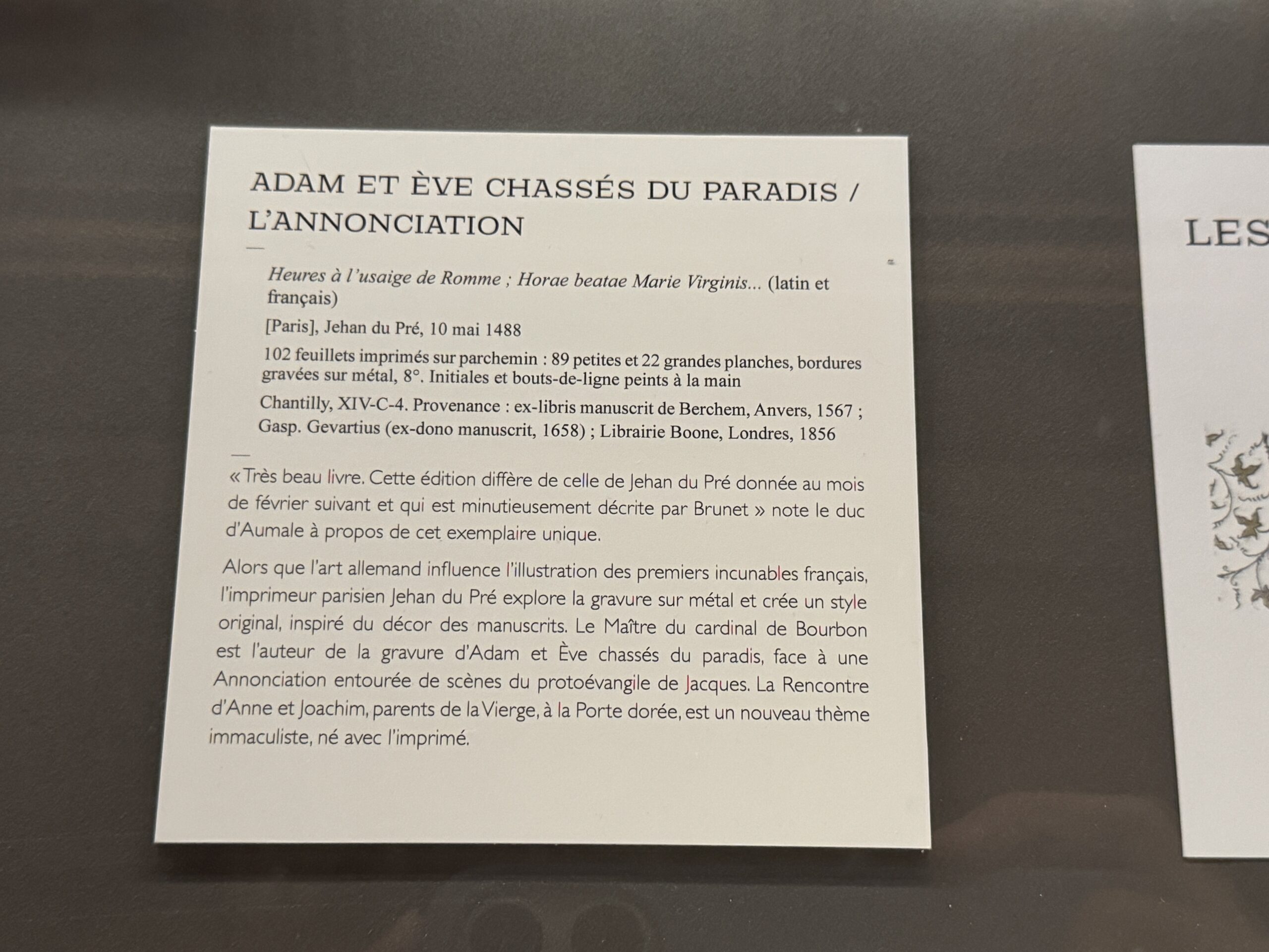 «Временная выставка книг, которая закончится 5 октября 2025 года «Une autre histoire de livres d’heures» («Другая история часослова»). Сопровождая выставку в зале для игры в мяч («Jeu de Paume»), посвящённую знаменитому «Великолепному часослову» герцога Беррийского, Кабинет книг представляет значительную коллекцию из сорока рукописных и печатных часослов, охватывающих период с XII века до конца XIX века. Коллекция герцога Омальского позволяет посетителям открыть для себя другую историю часослова – историю первого бестселлера в истории книг, верно отражающего глубокие духовные, художественные и технологические революции прошлых веков»…