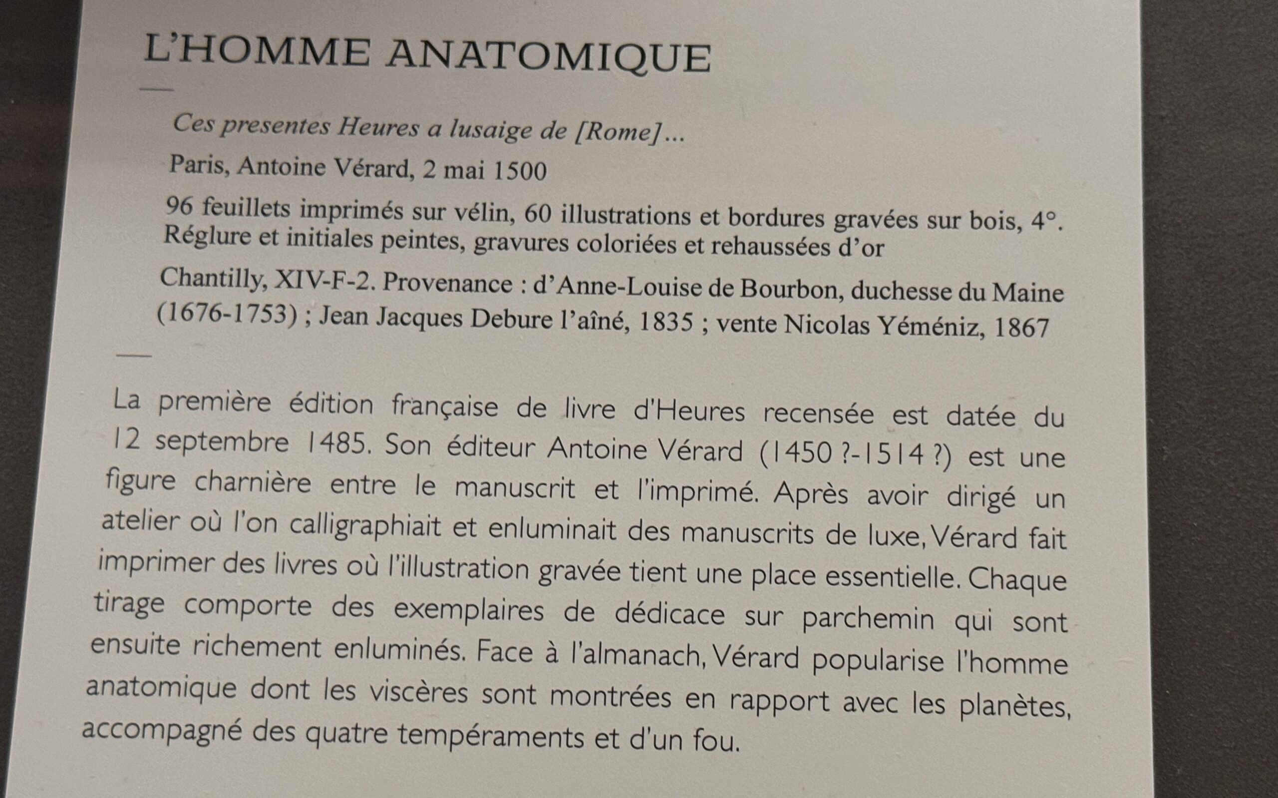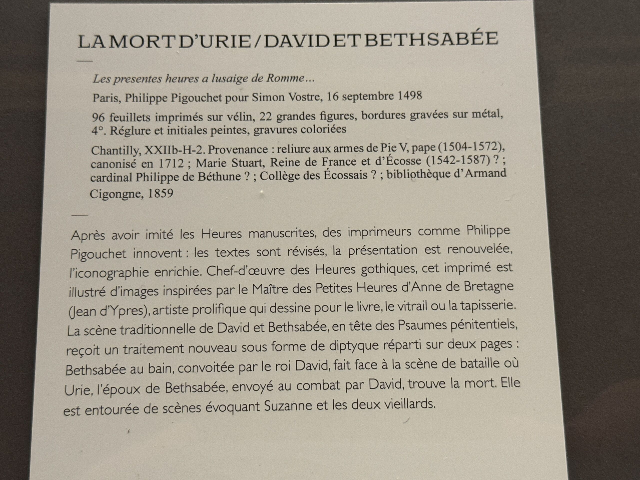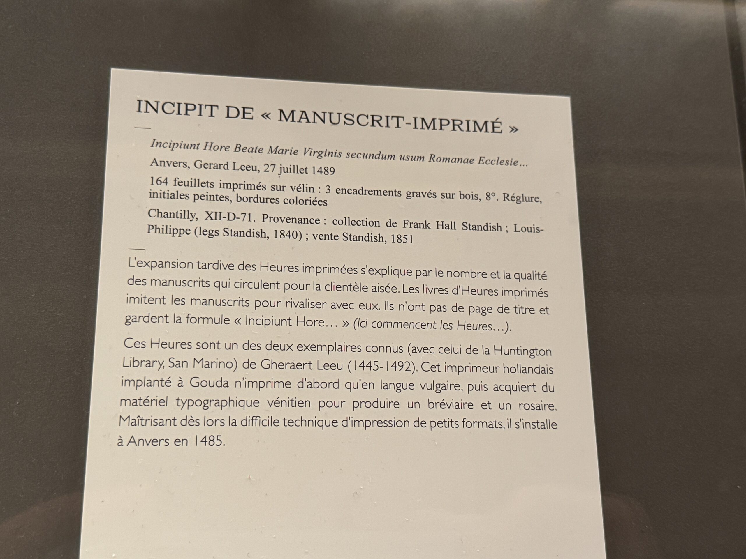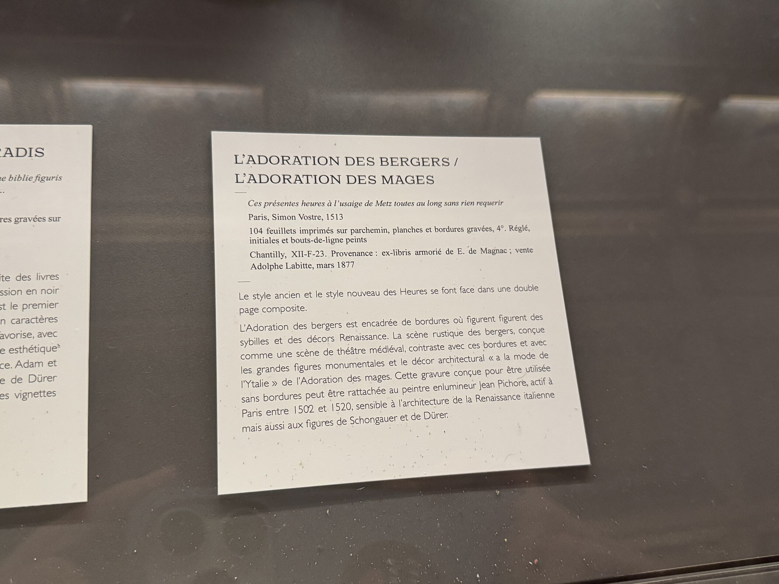 «Временная выставка книг, которая закончится 5 октября 2025 года «Une autre histoire de livres d’heures» («Другая история часослова»). Сопровождая выставку в зале для игры в мяч («Jeu de Paume»), посвящённую знаменитому «Великолепному часослову» герцога Беррийского, Кабинет книг представляет значительную коллекцию из сорока рукописных и печатных часослов, охватывающих период с XII века до конца XIX века. Коллекция герцога Омальского позволяет посетителям открыть для себя другую историю часослова – историю первого бестселлера в истории книг, верно отражающего глубокие духовные, художественные и технологические революции прошлых веков»…