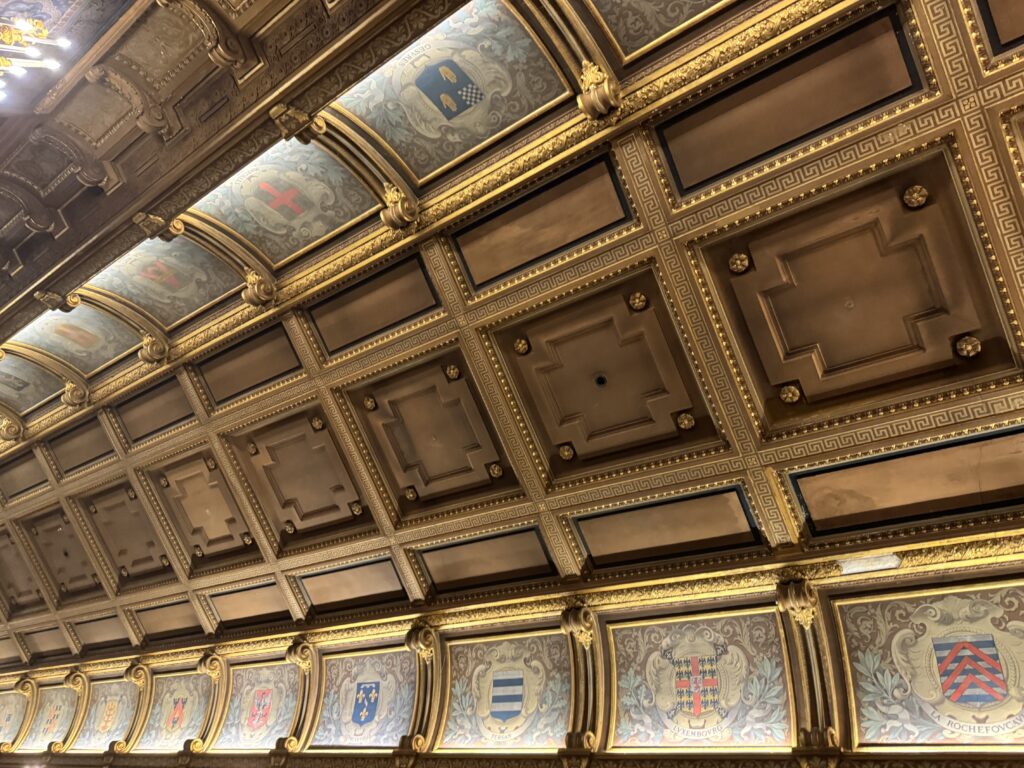 Потолок украшен гербом соратника Великого Конде, оригинальный глиняный бюст которого работы Куасевокса находится на камине.