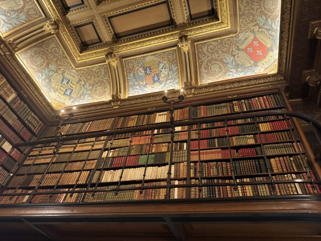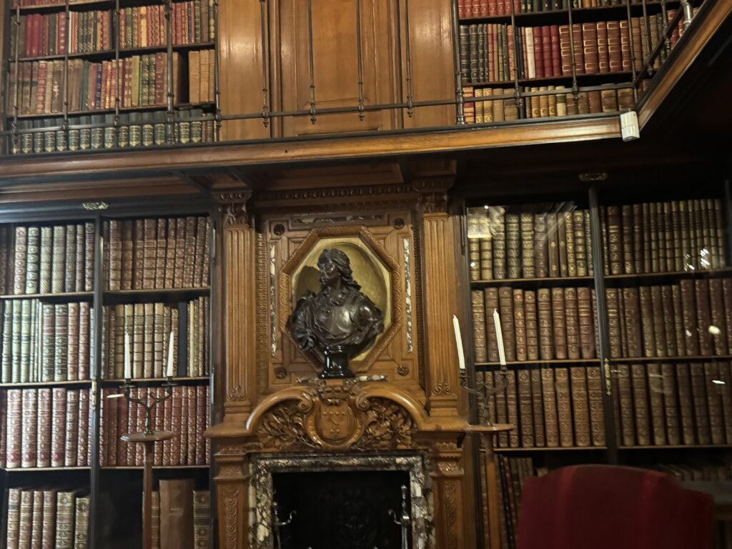 «Библиотека, или Кабинет книг, была основана в 1877 году архитектором Оноре Доме, ответственным за проект. Она была спроектирована для хранения книжной коллекции герцога Омальского, а также для чтения и работы.