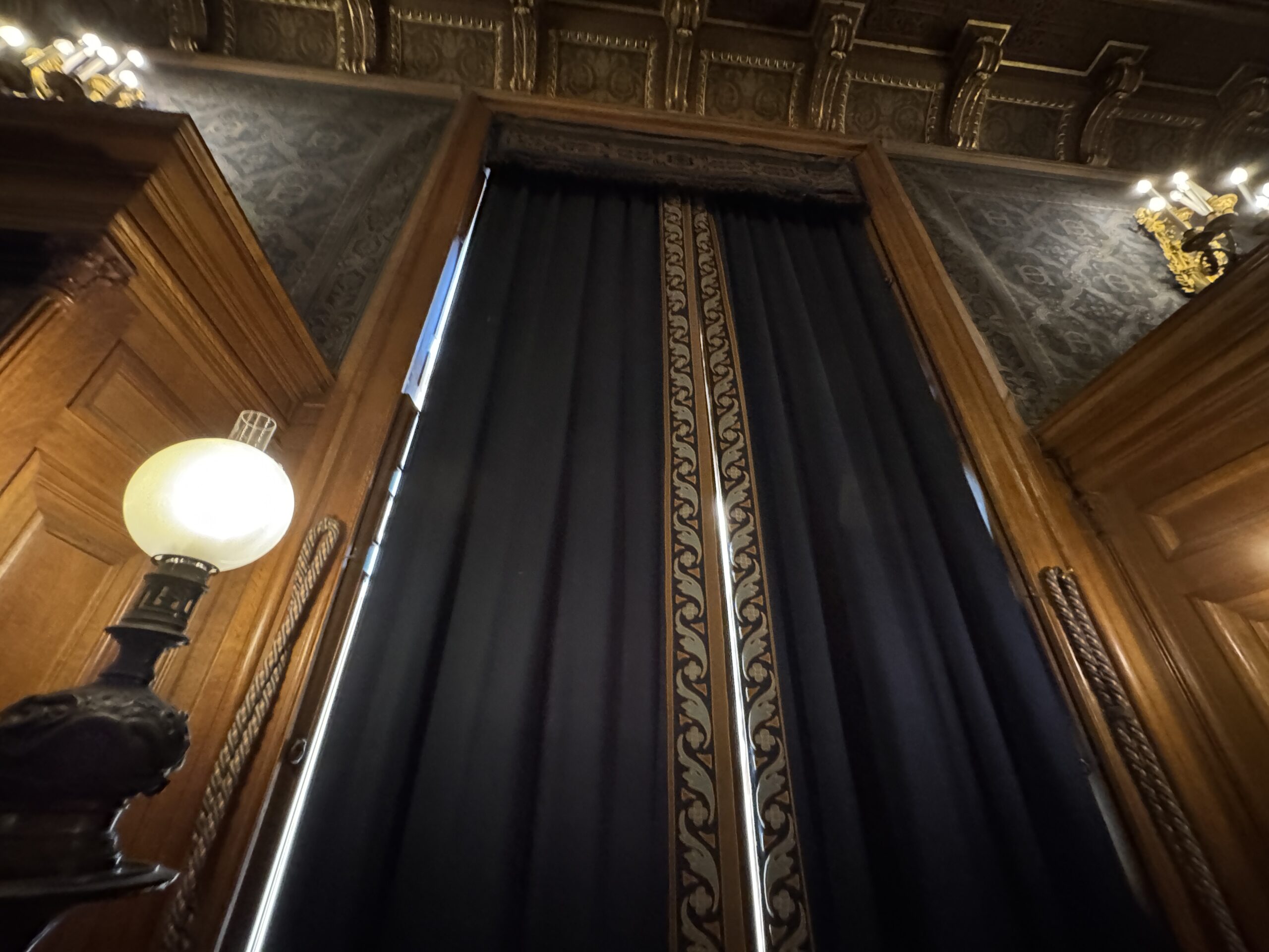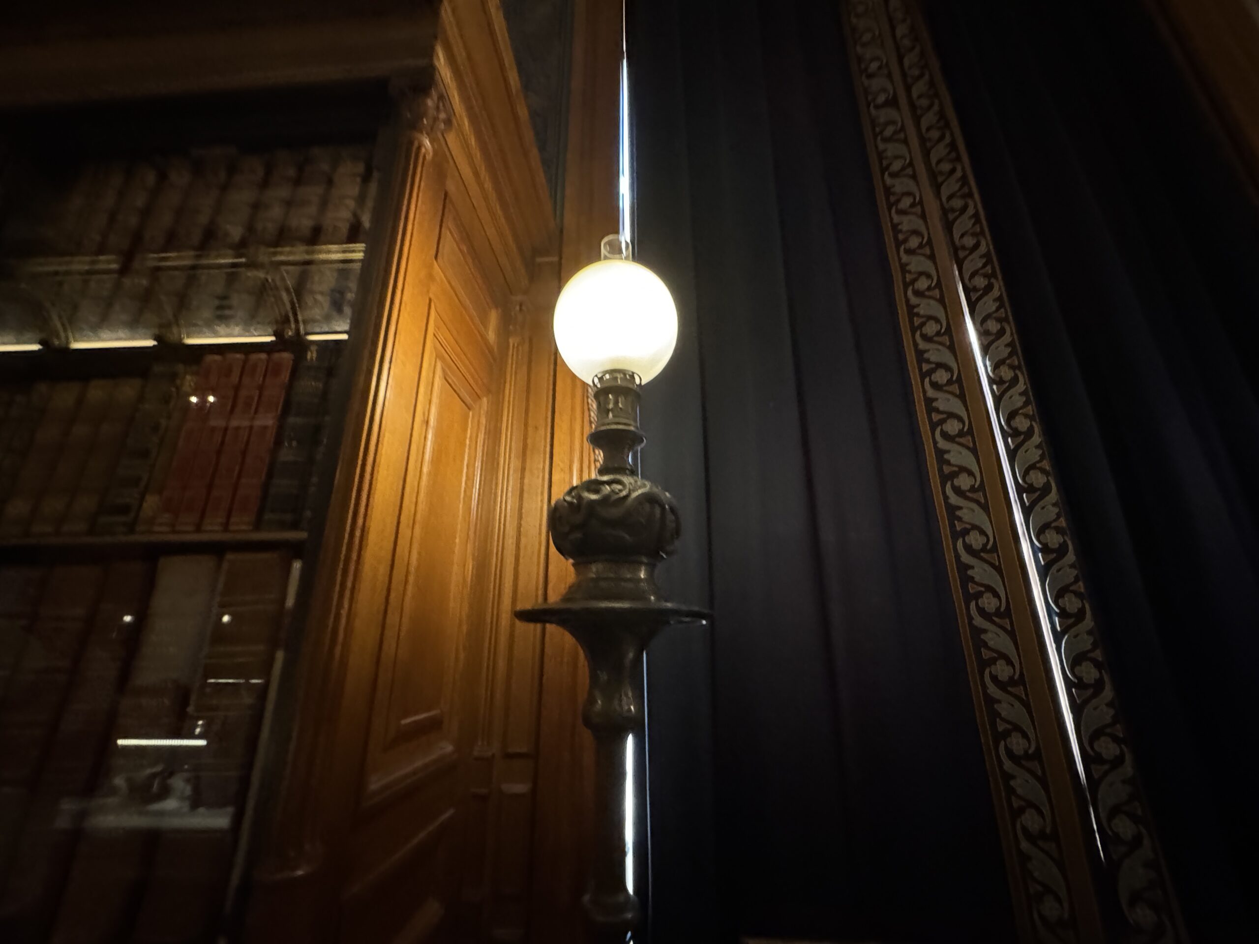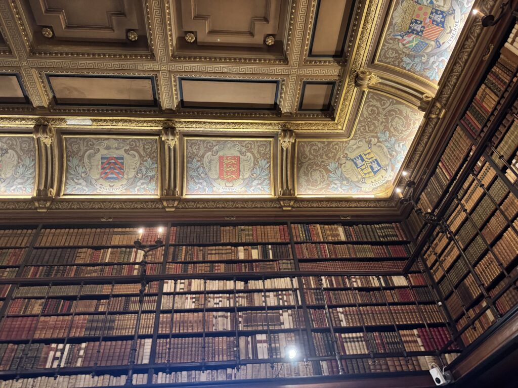 Двухуровневая металлическая конструкция с галереей является типичным примером библиотечной архитектуры второй половины XIX века. Железные полки обтянуты кожей. Географические карты (в настоящее время не используемые) размещались вдоль стеклянных шкафов, чтобы защитить книги от света. На галерею можно попасть по лестнице за дверью слева от камина.