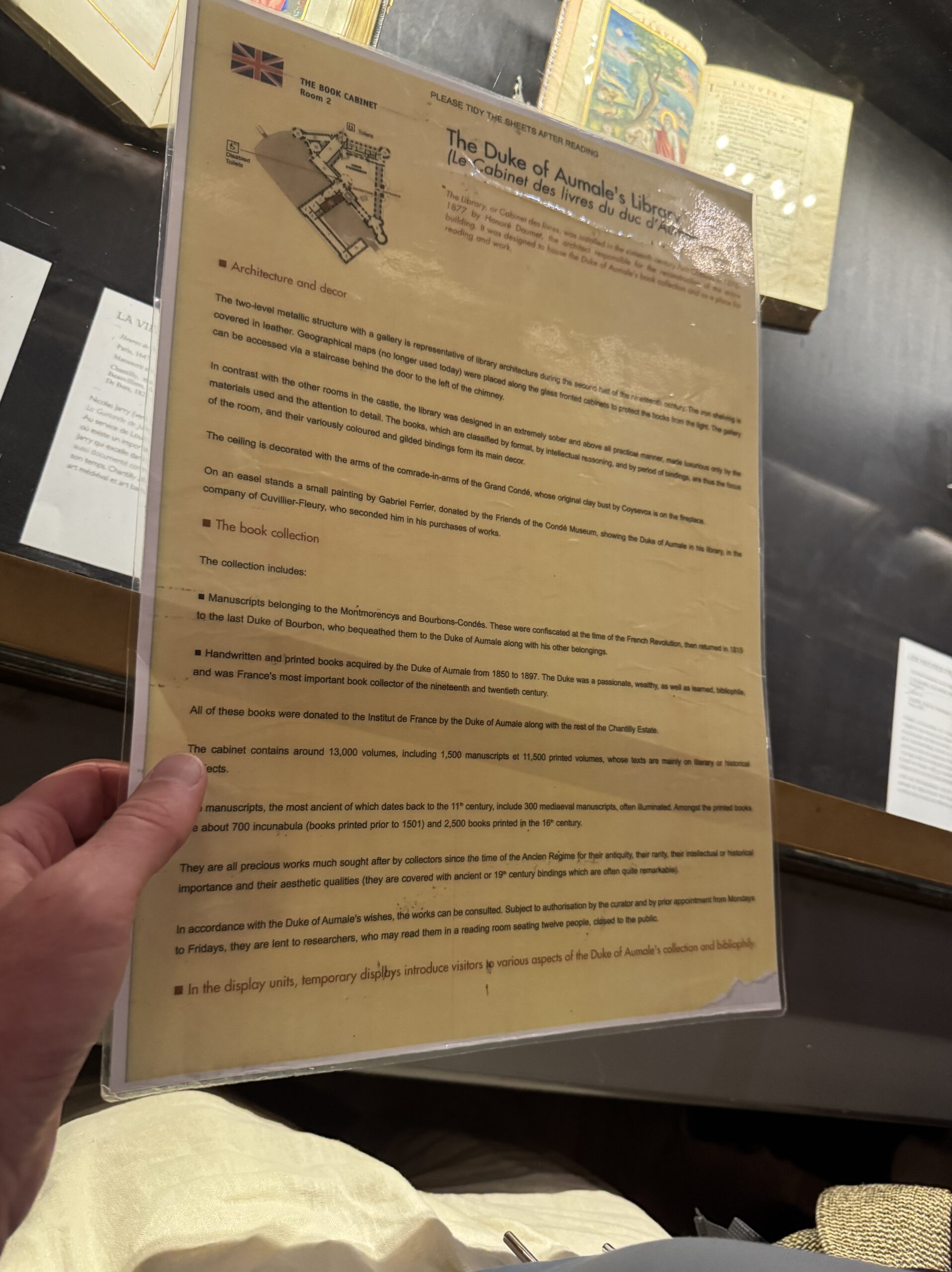В выставочных залах временные экспозиции знакомят посетителей с различными аспектами коллекции и библиофилии герцога Омальского.»