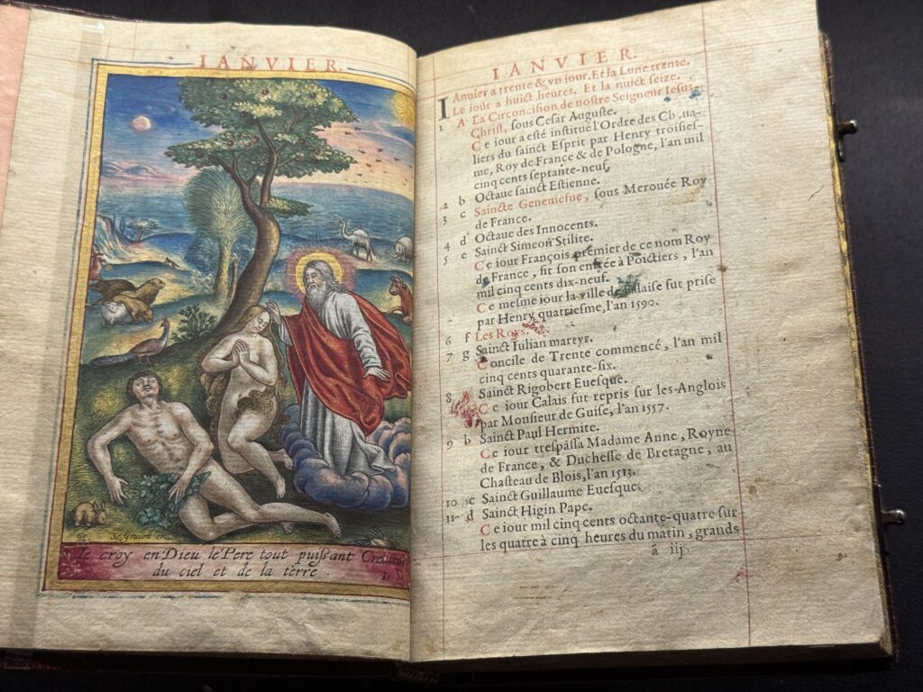 На правой странице: «Январь… события, случившиеся в этот день в разные времена, например: «В этот день Франциск Первый, носящий это имя, король Франции, въехал в Пуатье в год 1519. В этот же день город Фалез был взят Генрихом IV, в 1590 году».