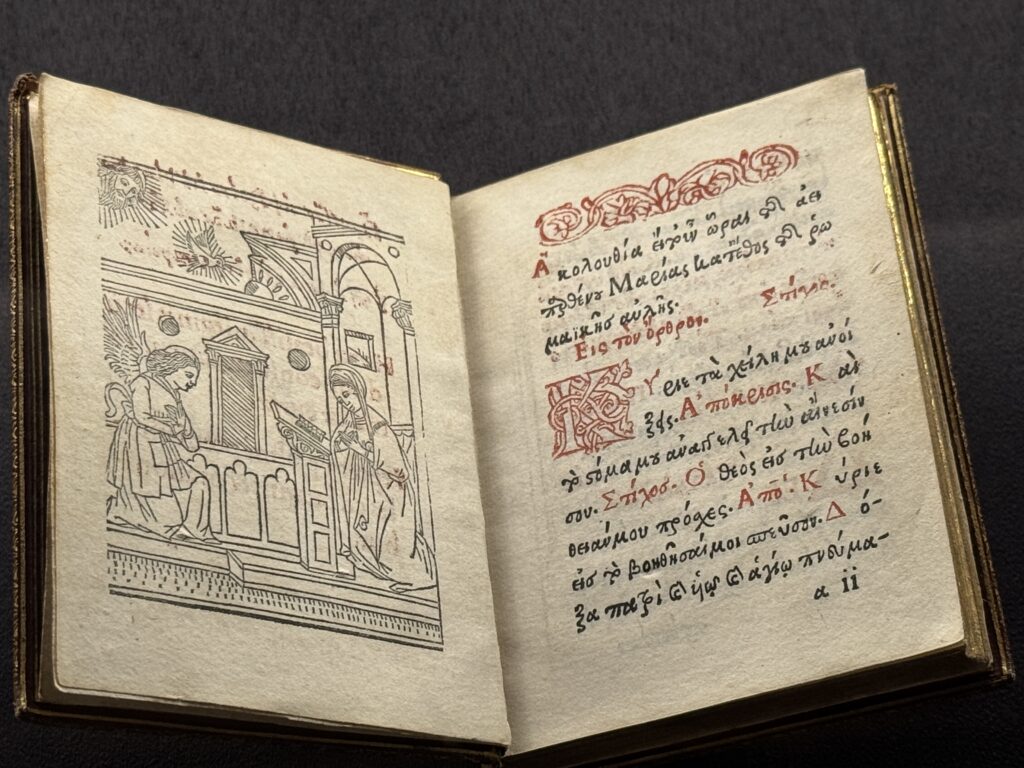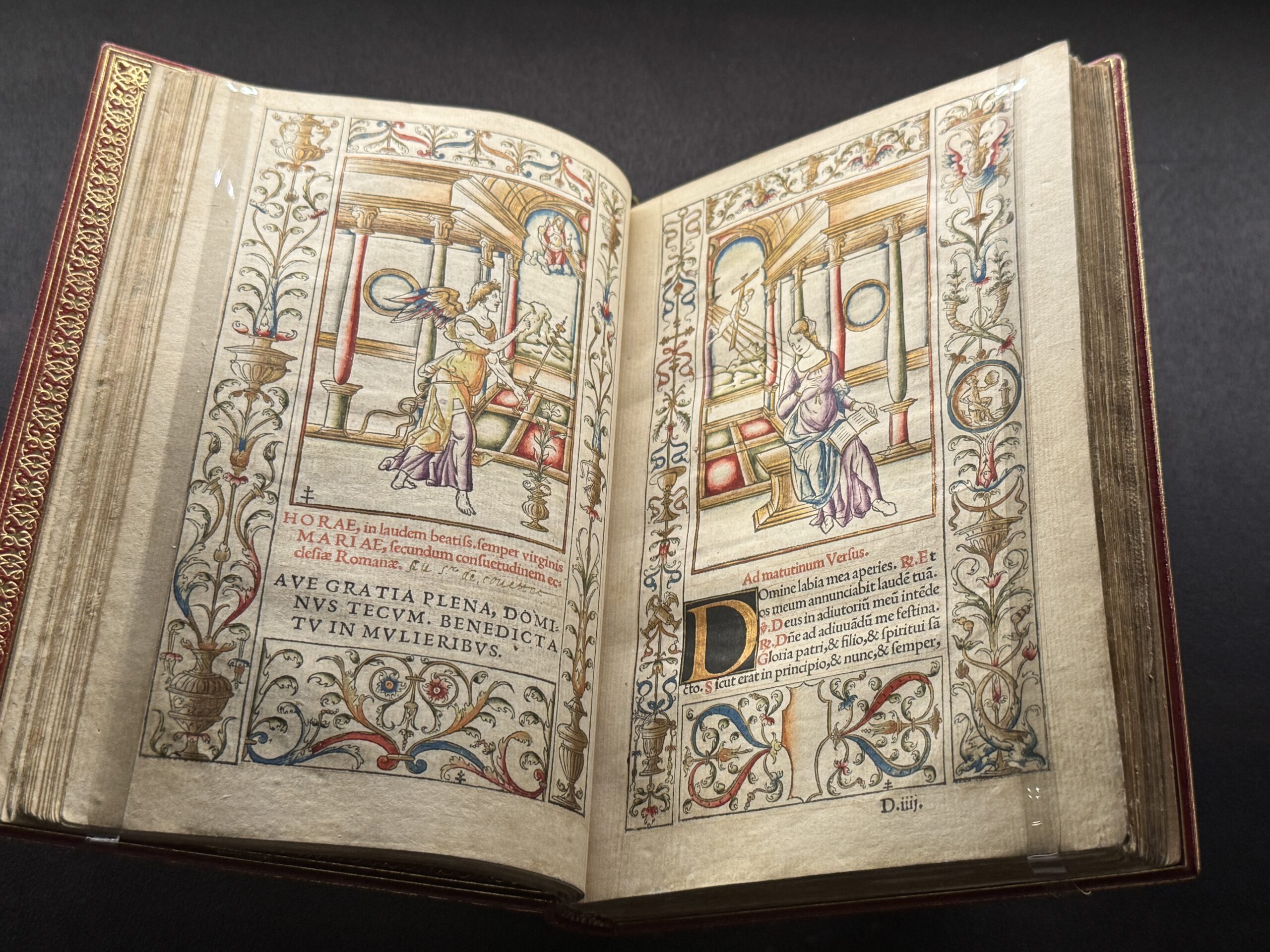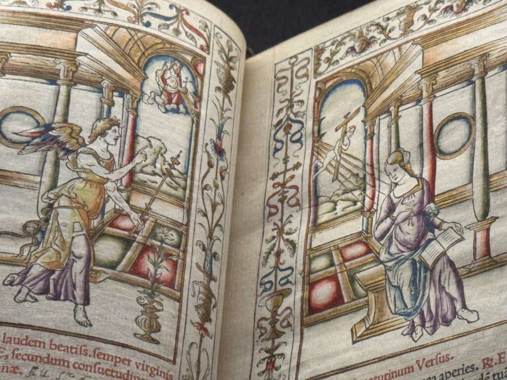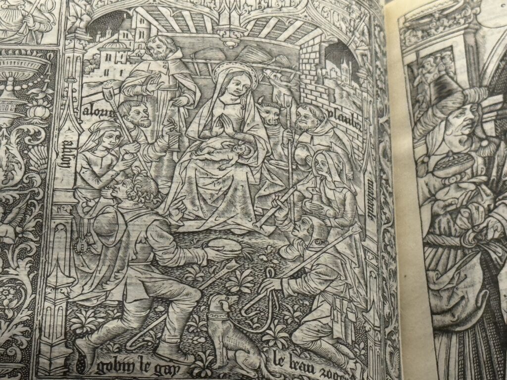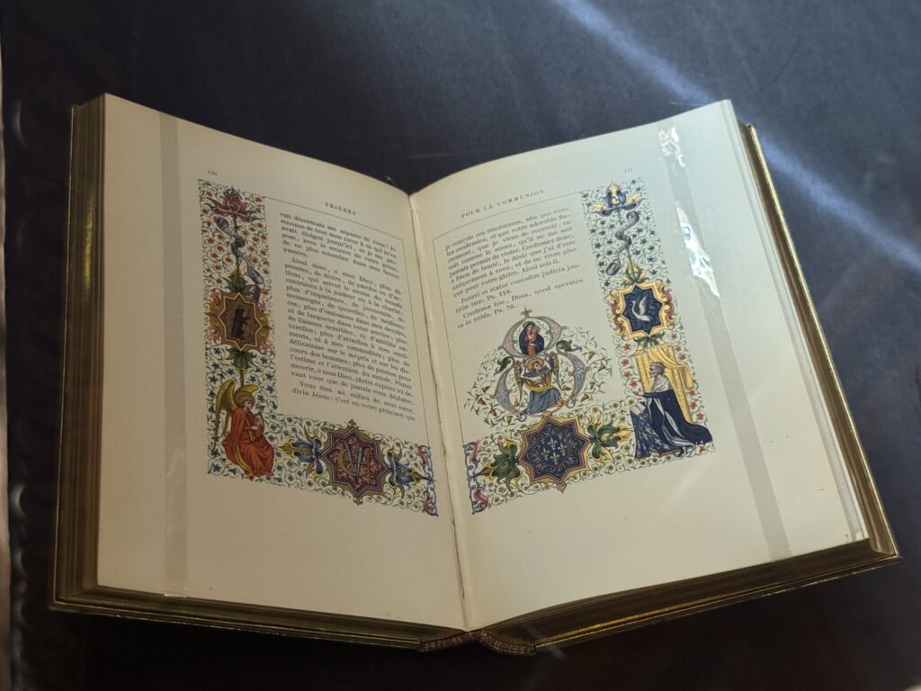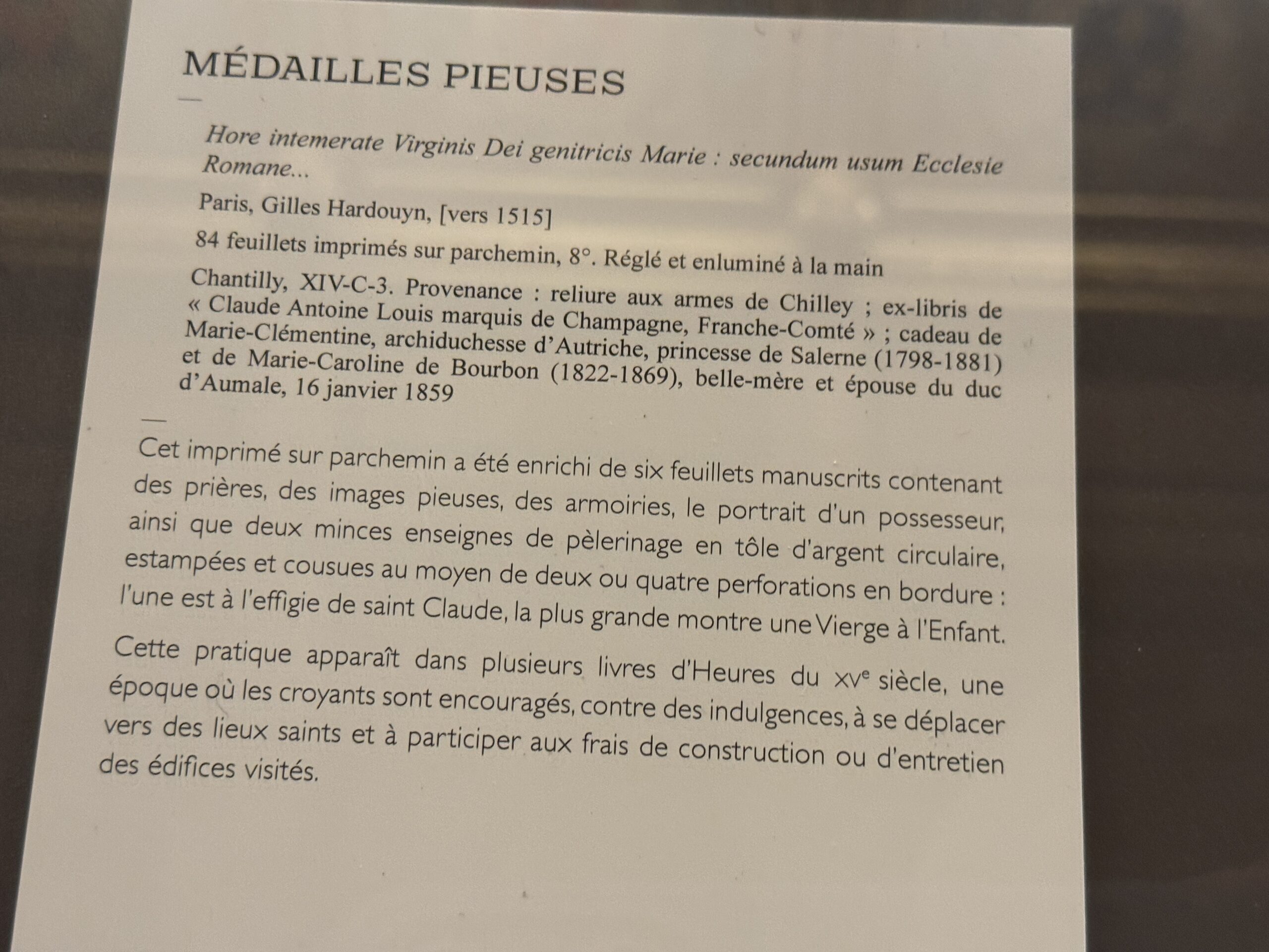 Непорочный час Девы Марии, Матери Божией: согласно обычаю Римско-католической церкви… Париж, Жиль Ардуэн, [около 1515 г.] 84 листа, отпечатанные на пергаменте, 8°. Линейка и иллюминация от руки. Шантийи, XIV-C-3. Происхождение: переплёт с гербом Шийе; экслибрис «Клод Антуан Луи, маркиз Шампани, Франш-Конте»; дар Марии-Клементины, эрцгерцогини Австрийской, принцессы Салернской (1798–1881), и Марии-Каролины Бурбонской (1822–1869), тёщи и жены герцога Омальского, 16 января 1859 г.