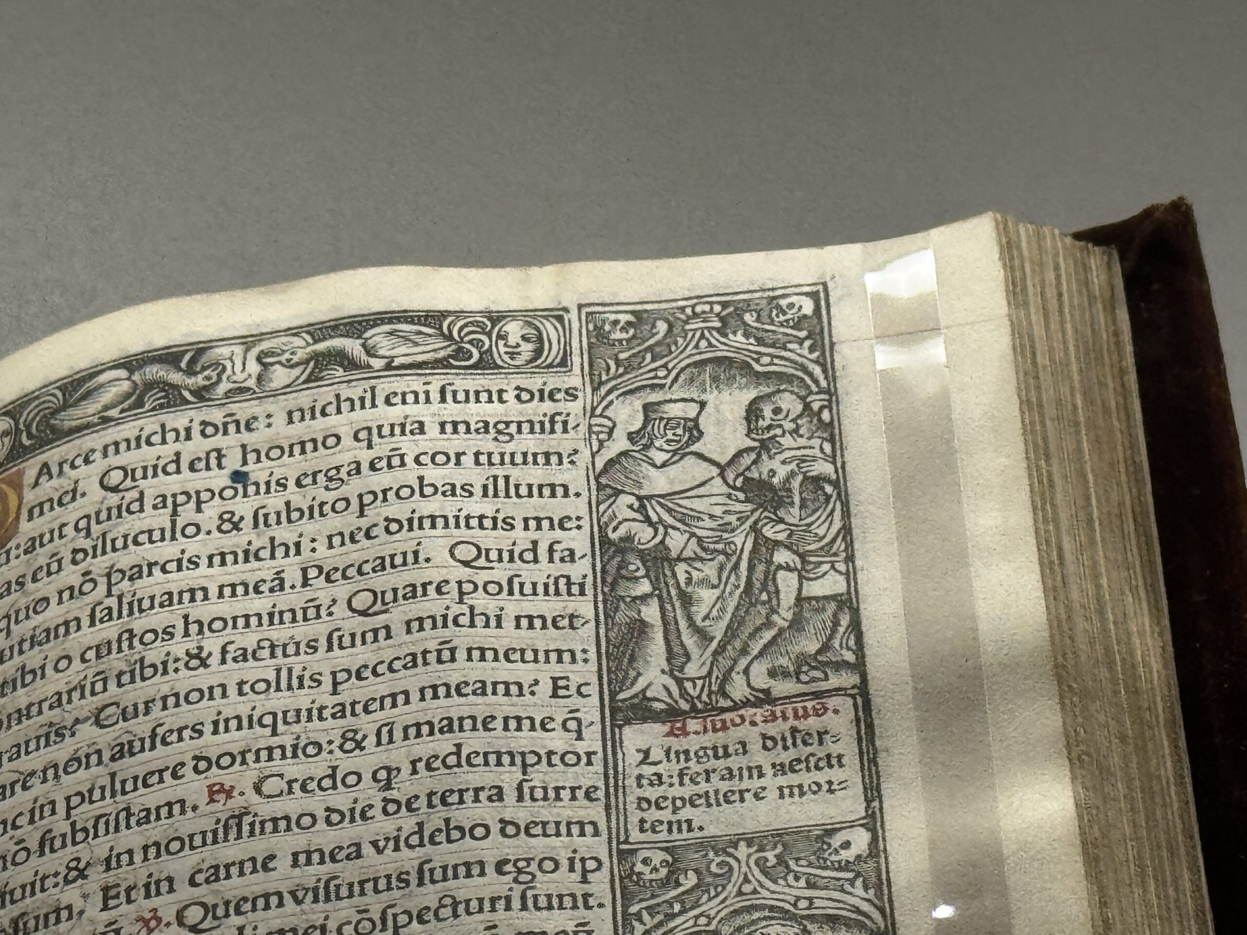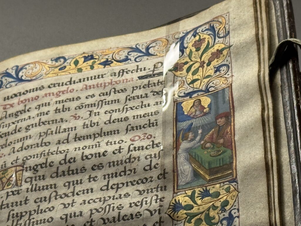 Этот пергаментный оттиск был дополнен шестью рукописными листами с молитвами, благочестивыми изображениями, гербами, портретом владельца, а также двумя тонкими паломническими знаками на круглом серебряном листе, отштампованными и пришитыми с помощью двух или четырех перфораций по краю: на одном из них изображен Святой Клавдий, на другом — Богоматерь с младенцем.