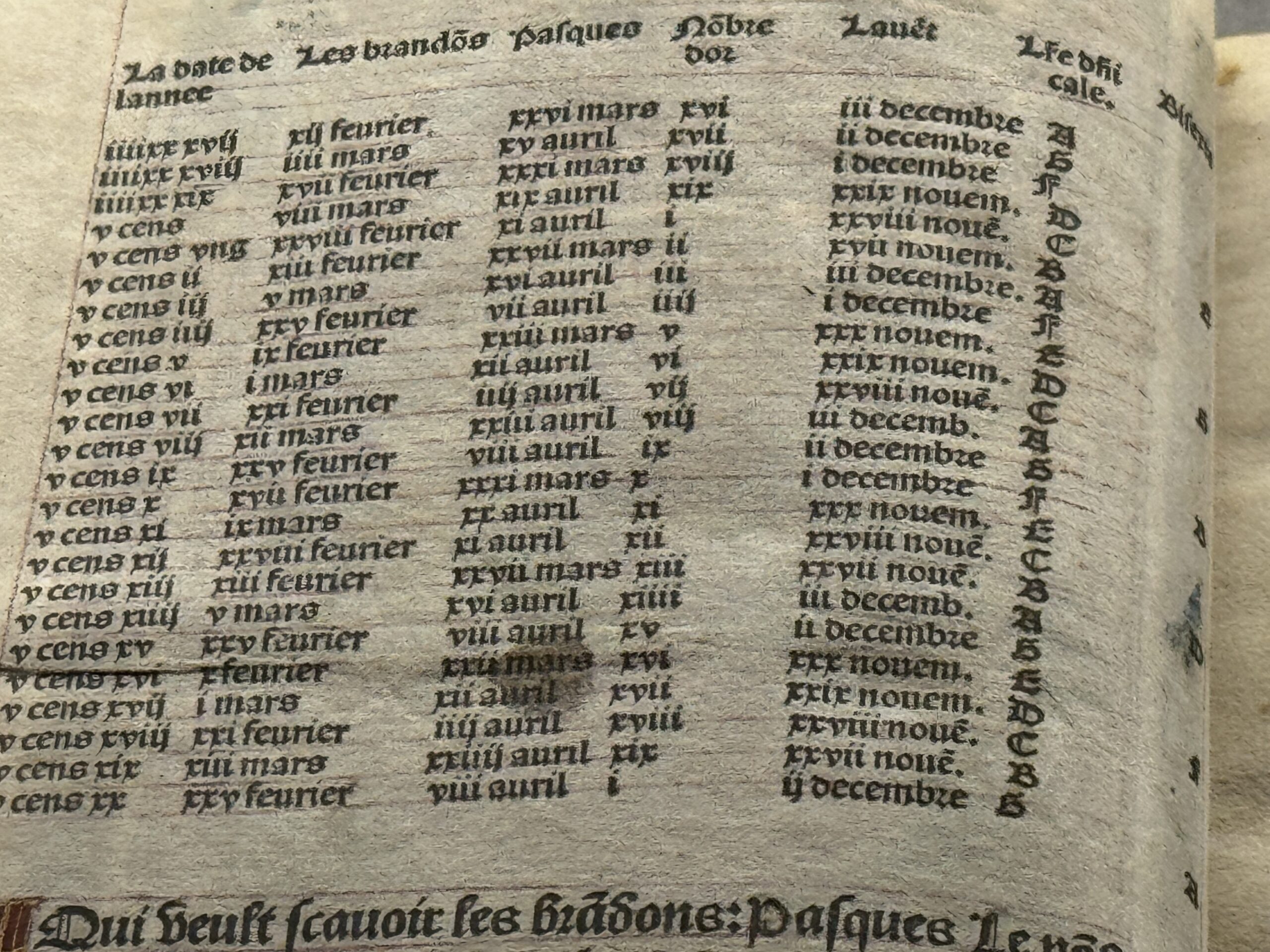 Нумерация дней основана на древнеримской системе календ. В начале стоят буквы KL, которые являются сокращением латинского слова kalendae. Отсчёт дней ведётся в обратном порядке от нон, ид или календ, используя два столбца слева от имён святых. Римские цифры от 1 до 19, вписанные в первый столбец, — это золотые числа, используемые для определения даты Пасхи в данном году. Справа указан зодиак: в ноябре Солнце входит в созвездие Скорпиона (Sol in scorpione).