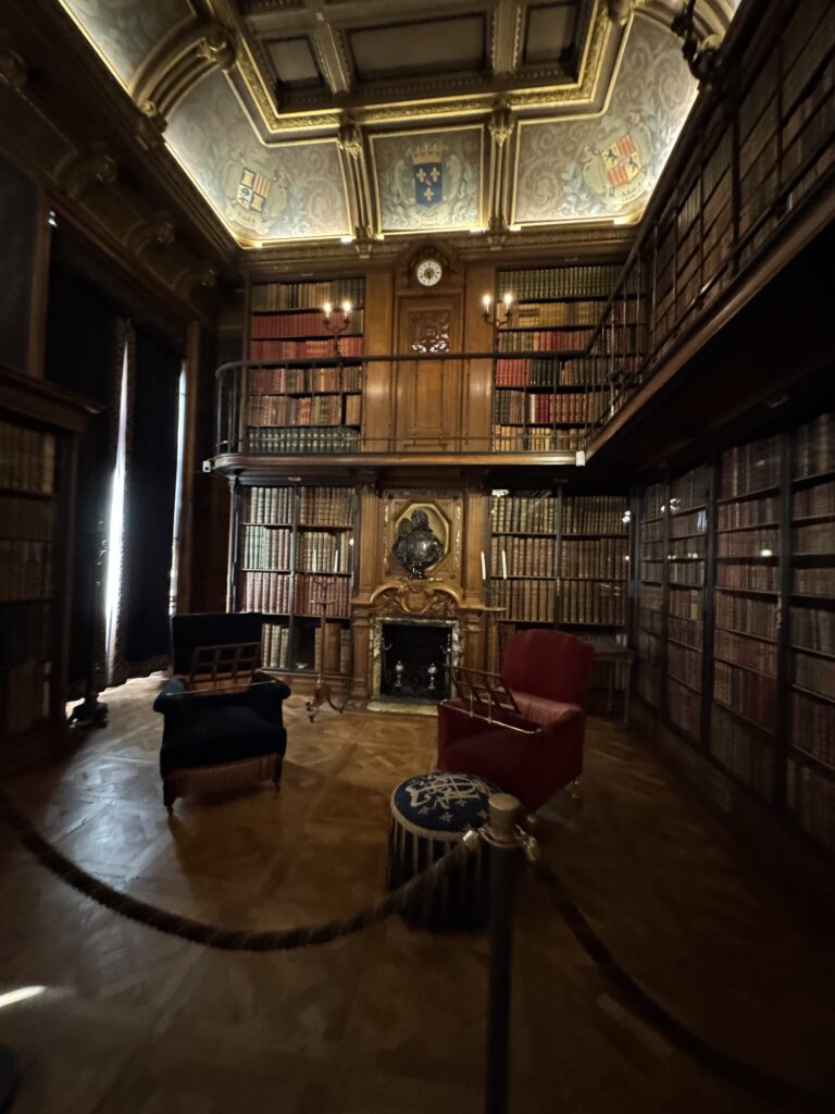 В отличие от других помещений замка, библиотека была оформлена в чрезвычайно сдержанном и, прежде всего, практичном стиле, роскошь которому придают лишь использованные материалы и внимание к деталям. Книги, сгруппированные по формату, интеллектуальной составляющей и периоду переплётов, являются украшением комнаты, а их разноцветные и позолоченные переплёты образуют её главное украшение.