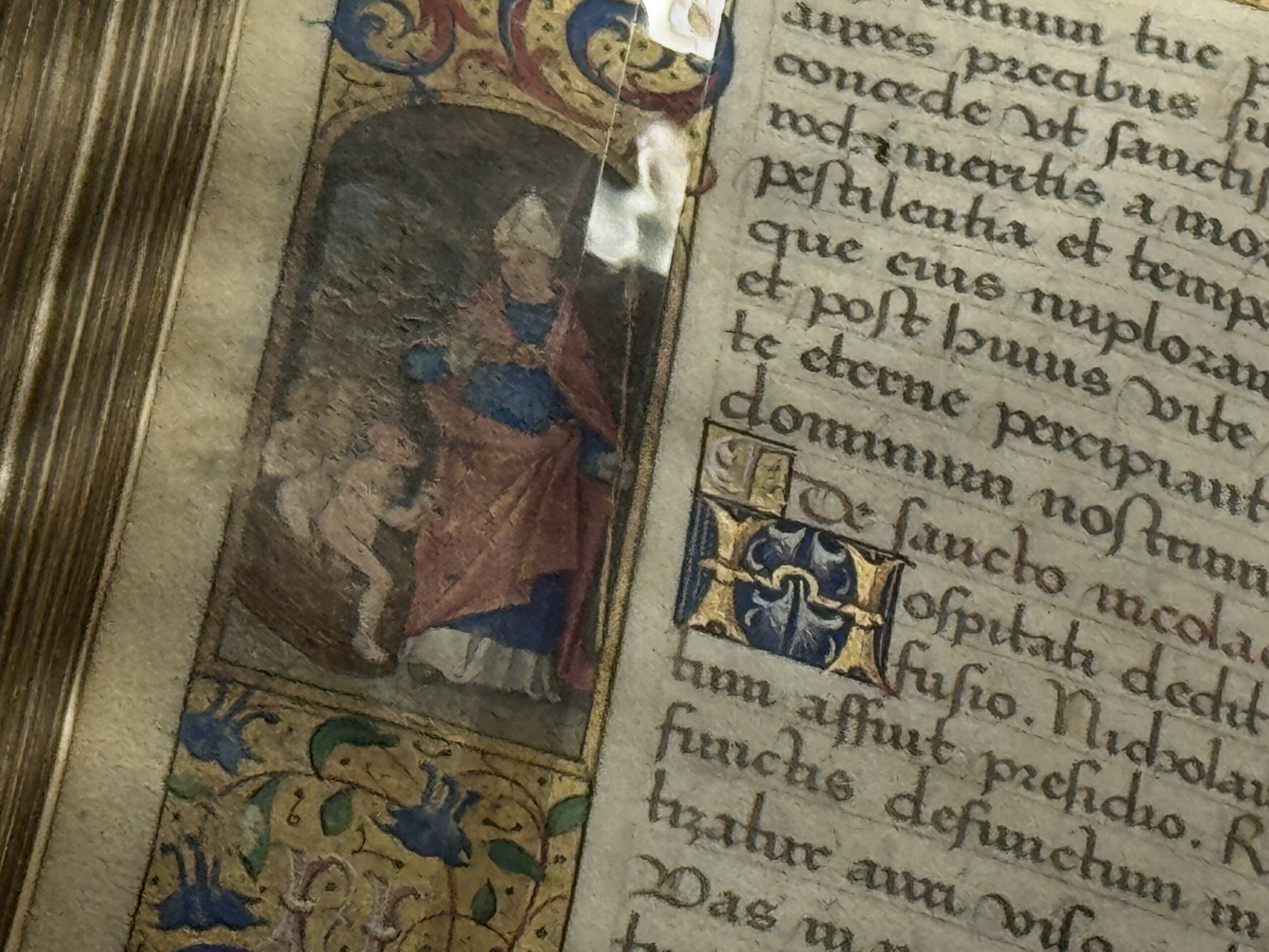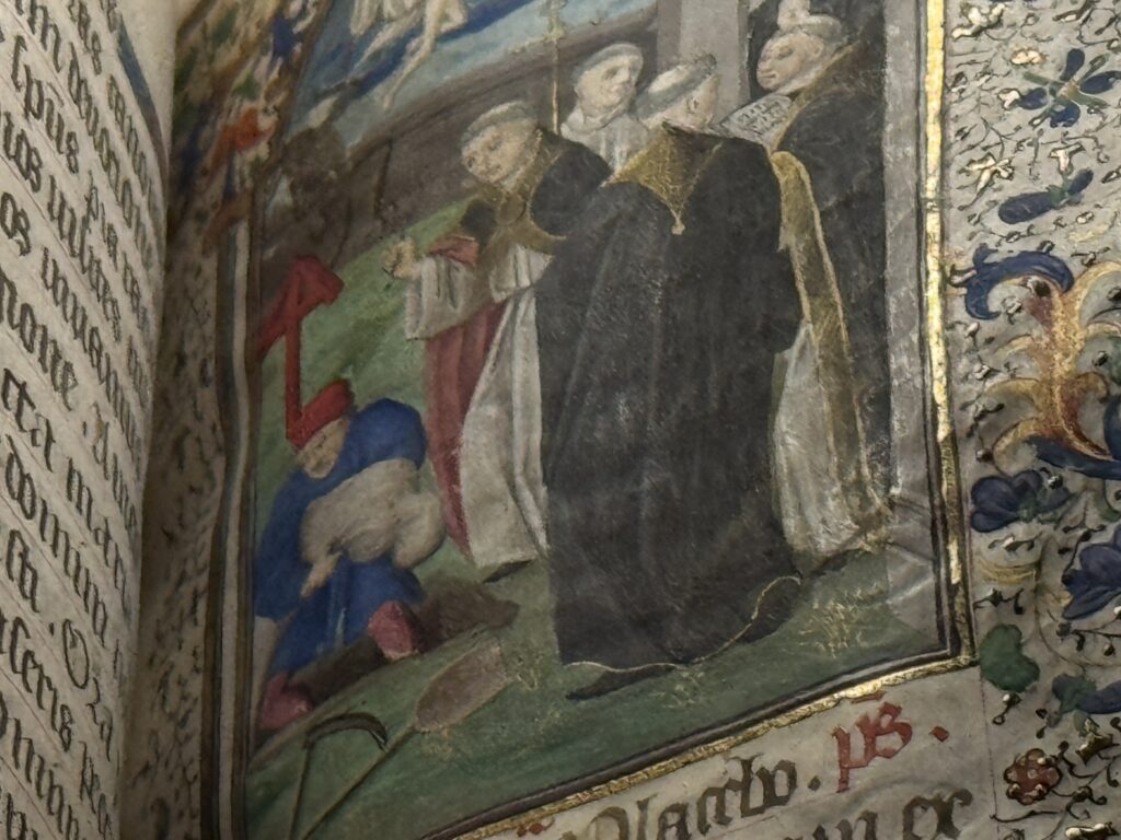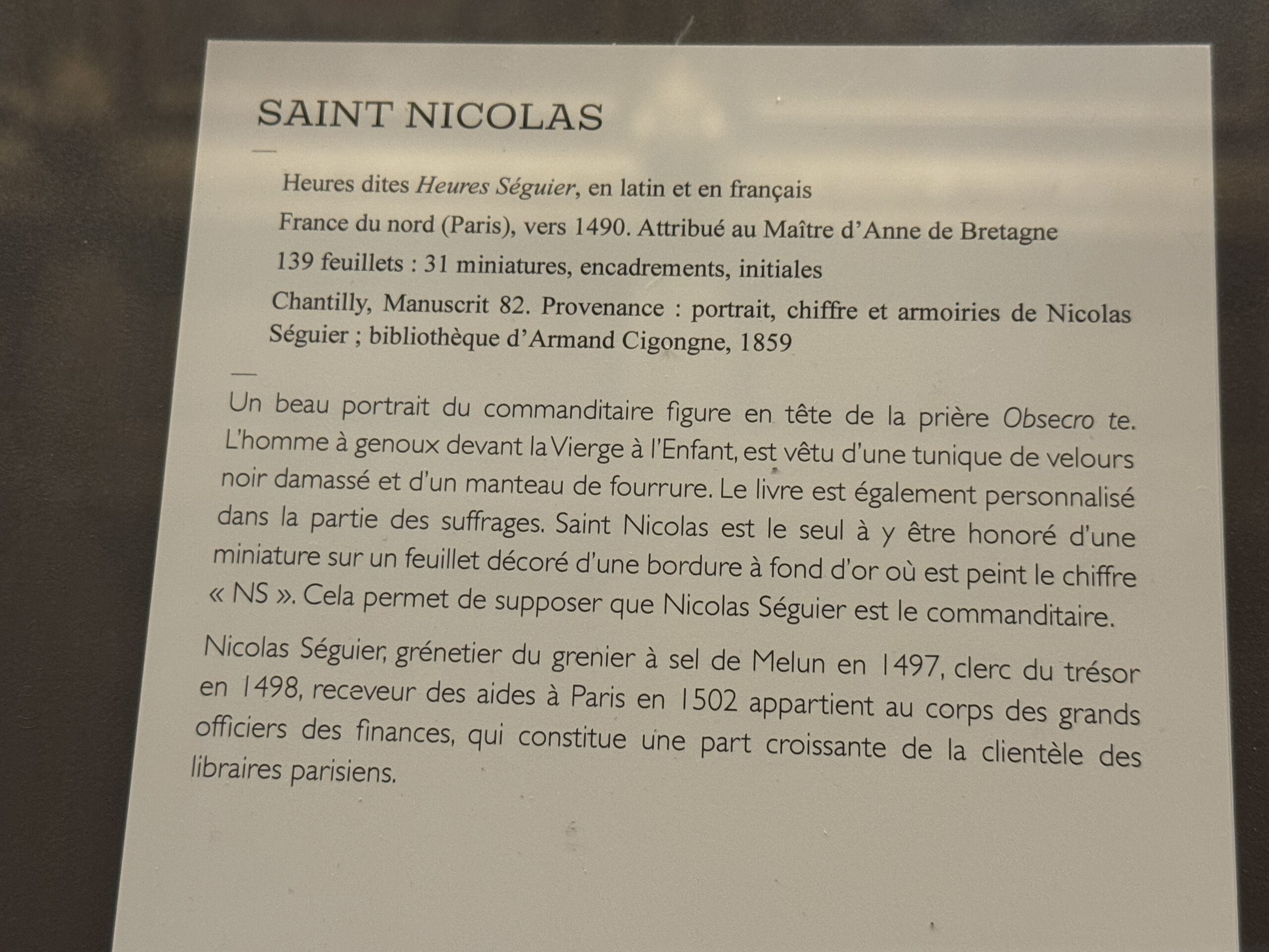 В начале молитвы Obsecro te помещён прекрасный портрет покровителя. Мужчина, преклонивший колени перед Богоматерью с Младенцем, одет в чёрную бархатную дамасскую тунику и шубу. Книга также персонализирована. Святой Николай — единственный, кто удостоился миниатюры на листе, украшенном золотой каймой, на которой изображена цифра «NS». Это позволяет предположить, что покровителем был Николя Сегье.