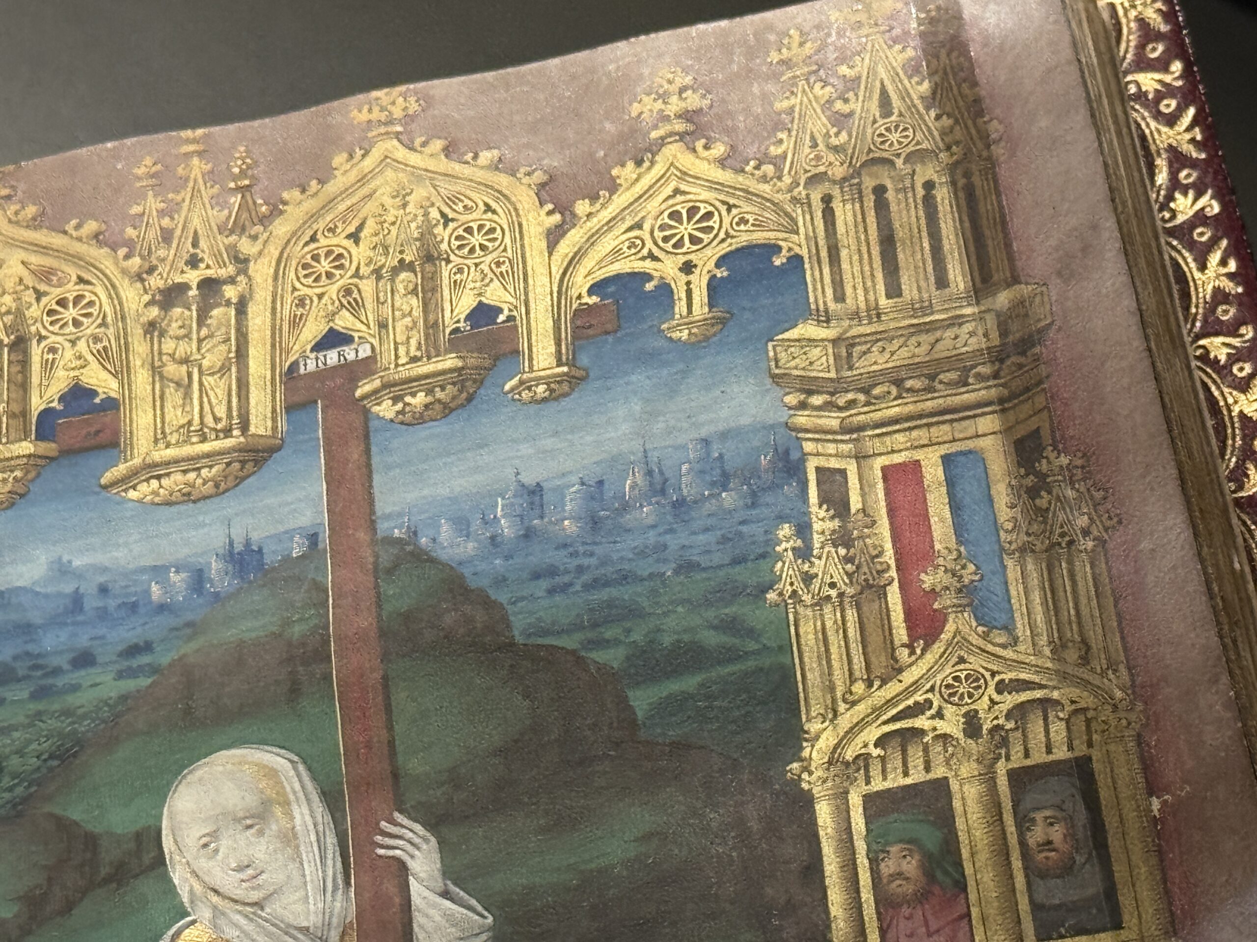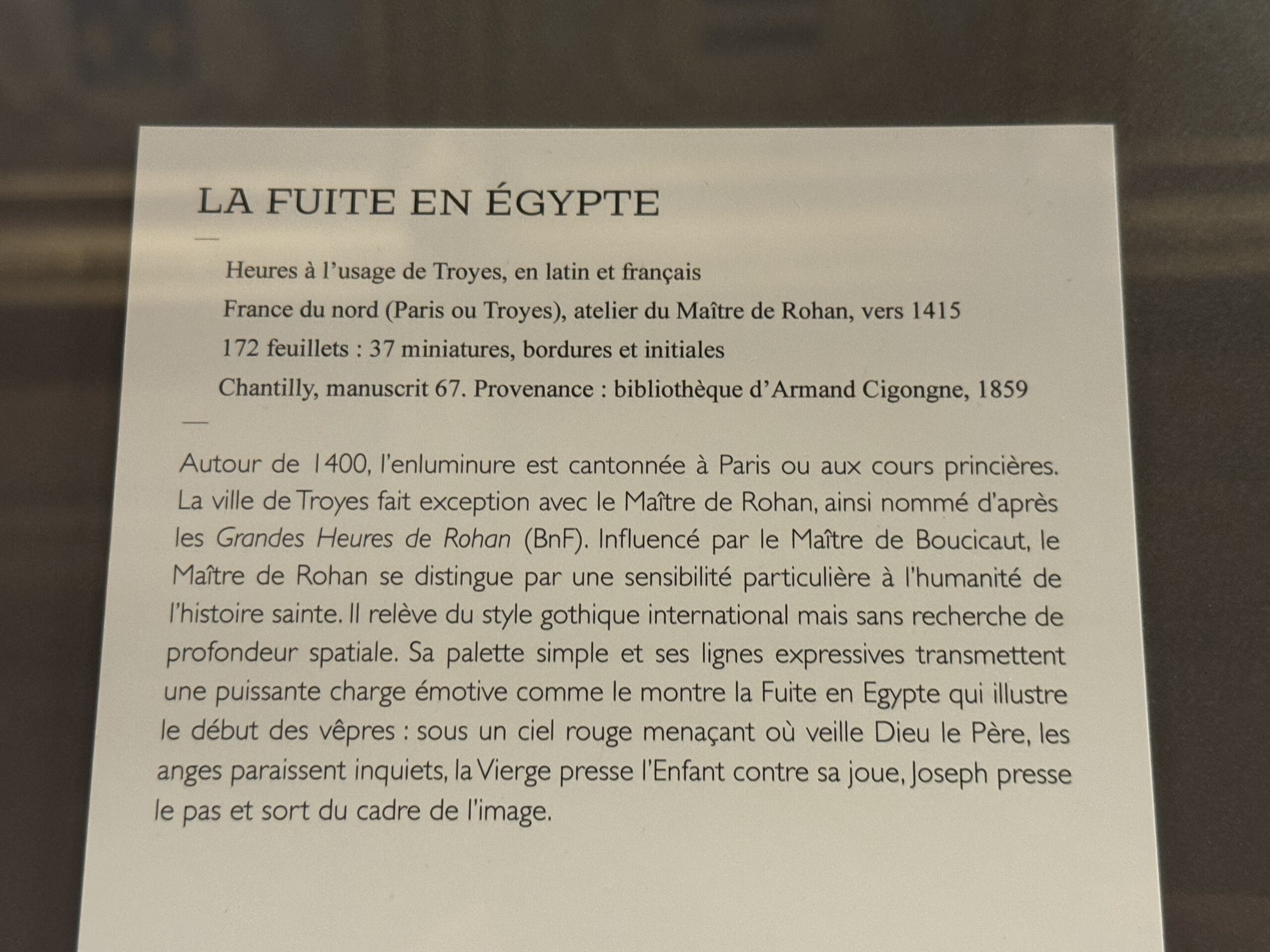 Около 1400 года иллюминация ограничивалась Парижем и княжескими дворами. (тут пробел, пробуйте переводить сами, ии не справляется с переводом этих двух строк) отличается особой чуткостью к человечности священной истории. Он принадлежит к интернациональной готике, но не стремится к пространственной глубине. Его простая палитра и выразительные линии передают мощный эмоциональный заряд, как это показано в картине «Бегство в Египет», иллюстрирующей начало вечерни: под угрожающим красным небом, где за ними наблюдает Бог-Отец, ангелы выглядят обеспокоенными, Дева Мария прижимает Младенца к своей щеке, Иосиф ускоряет шаг и покидает раму картины.