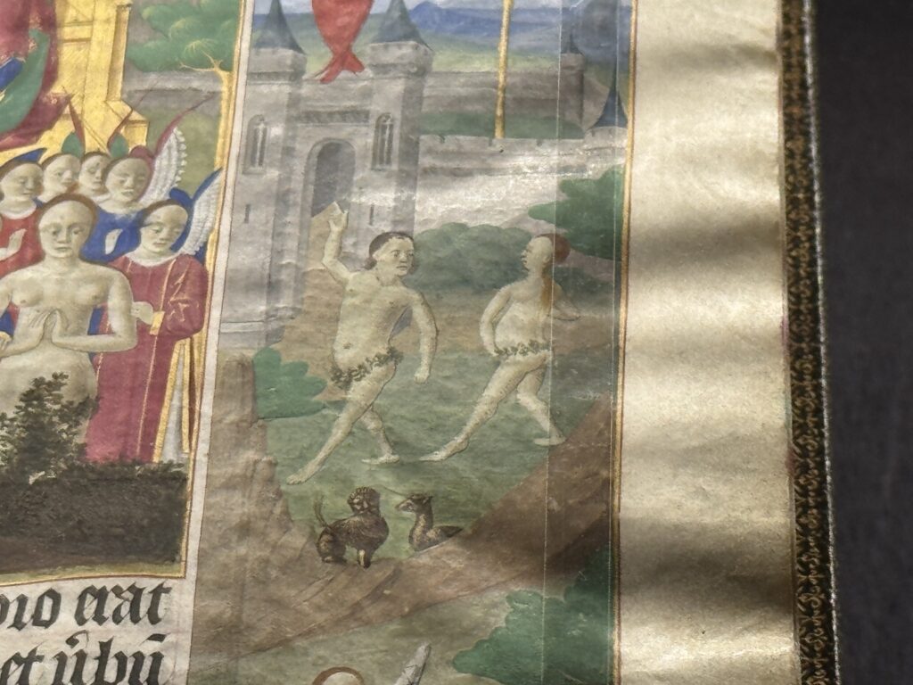 Этот Часослов, вторая часть которого хранится в Художественной галерее Уолтерса в Балтиморе, был предназначен для неизвестной женщины, изображённой в молитве. Художник, обучавшийся в долине Луары, использует (чистые тона?), насыщенные цвета и композицию, вдохновлённую парижскими рукописями начала века. Панорамные виды, лишенные перспективы, раскрываются за текстом календаря … или за основными сценами. Евангелие от Иоанна, которое читается на Рождество и начинается на правой странице, перекликается с историей Сотворения мира. Ева благословляется Богом и почитается как прообраз Девы Марии.