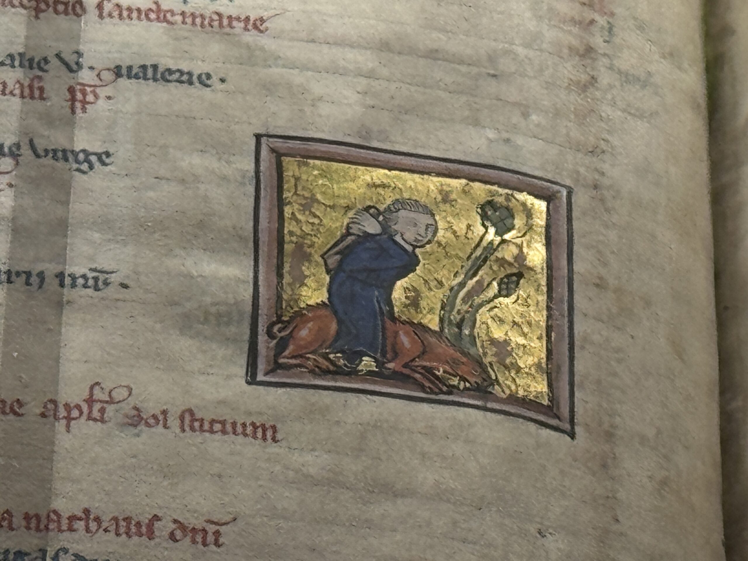 Эта литургическая псалтырь была позднее дополнена «Заупокойной службой». Богатые и многочисленные иллюстрации, частично светского содержания, придают этому небольшому собранию характер библиофильского предмета. Бенедиктинская монахиня изображена рядом с сокольничим.