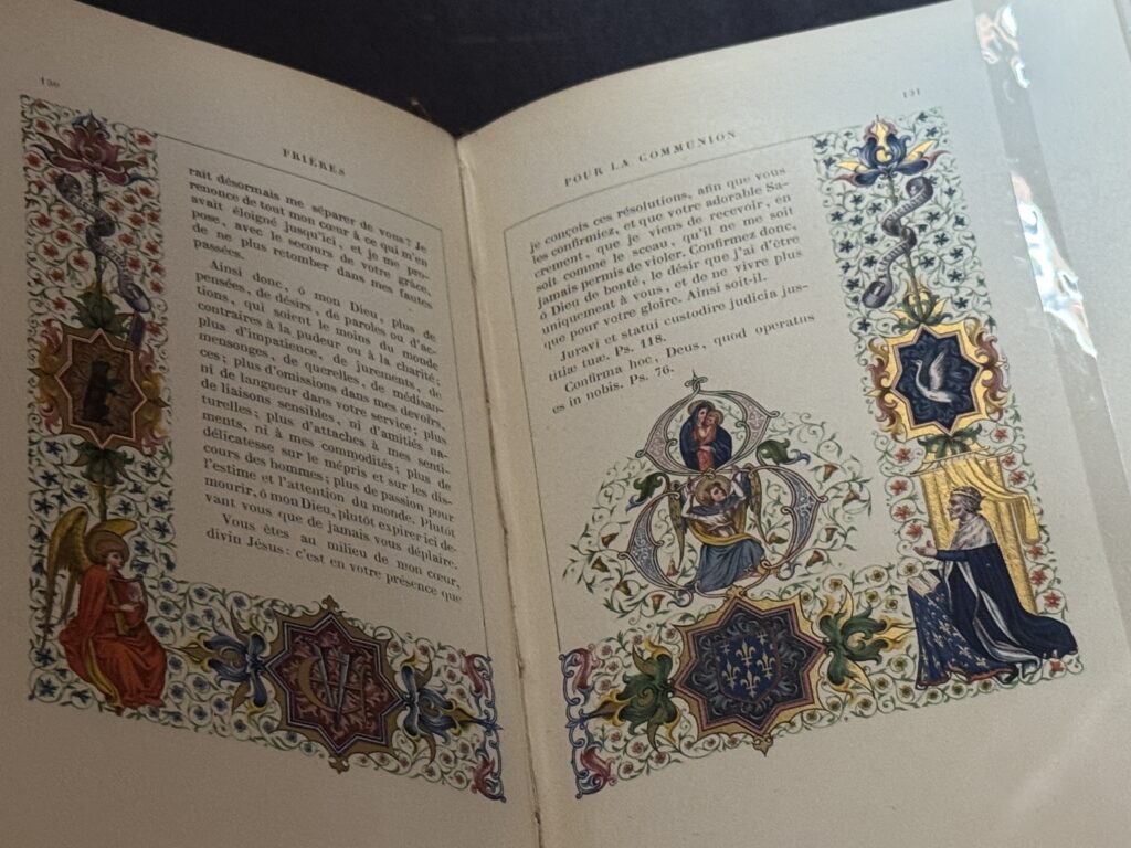 Часослов Рукопись, выполненная Леоном Кёрмером под руководством Ари Шеффера Шантильи, мануфактура t 117 Молитвенник, иллюстрированный орнаментами из средневековых рукописей, изданный Шарлем Матье, Париж, Леон Курмер, 1858–1862 гг., Шантийи, XXVI-E-3 (декорации заимствованы из Часослова герцога Беррийского) Работа Жана Фуке. Часы мэтра Этьена Шевалье Париж, Леон Курмер, 1858–1862 гг. Шантильи, LX3-B-1