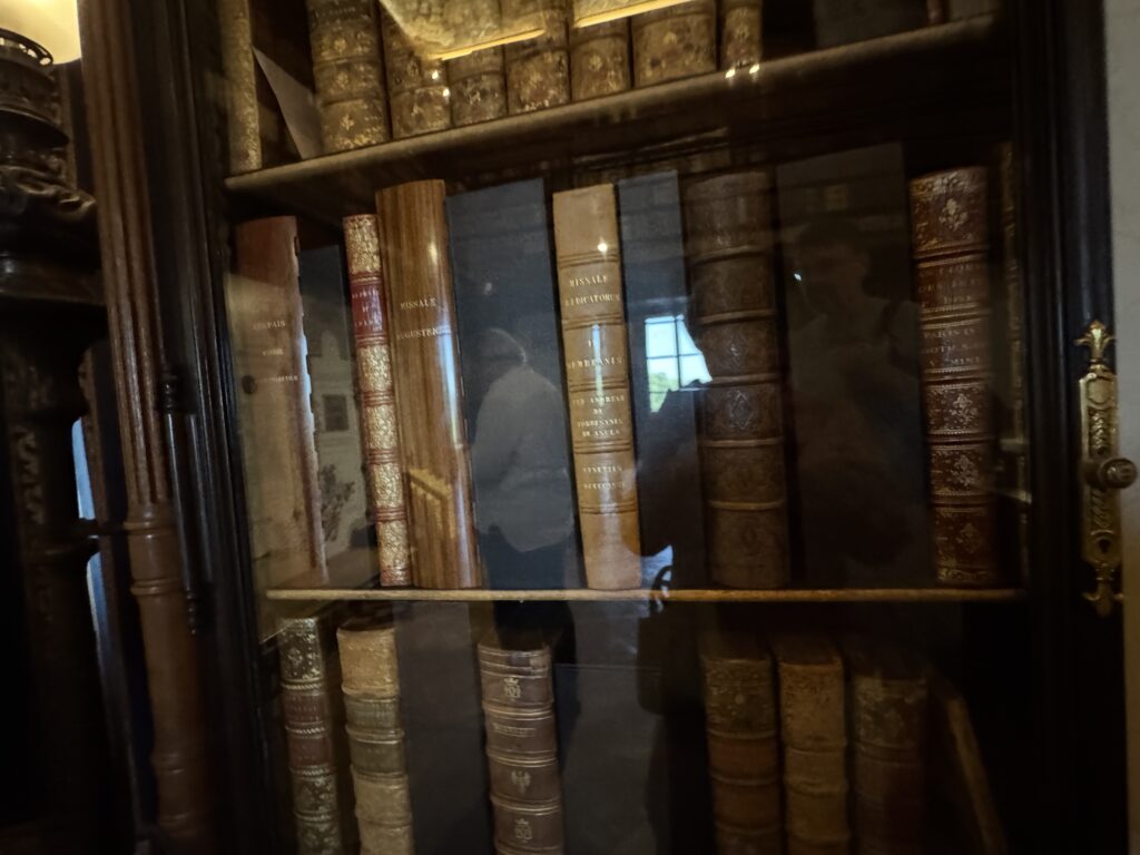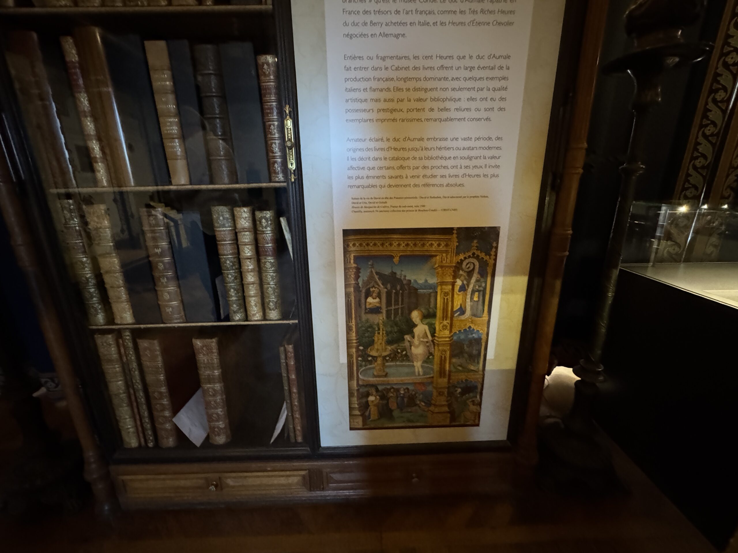 В книжном шкафу хранится 19 000 томов, включая 1500 рукописей. Среди этих сокровищ – 200 средневековых иллюминированных рукописей, 700 инкунабул, 2500 книг XVI века и уникальные, великолепные переплёты. Герцог Омальский отбирал эти книги по одной, учитывая их возраст, редкость, историческую значимость и красоту переплётов.