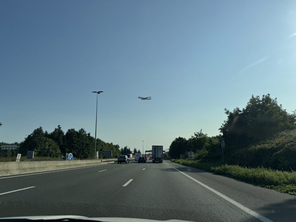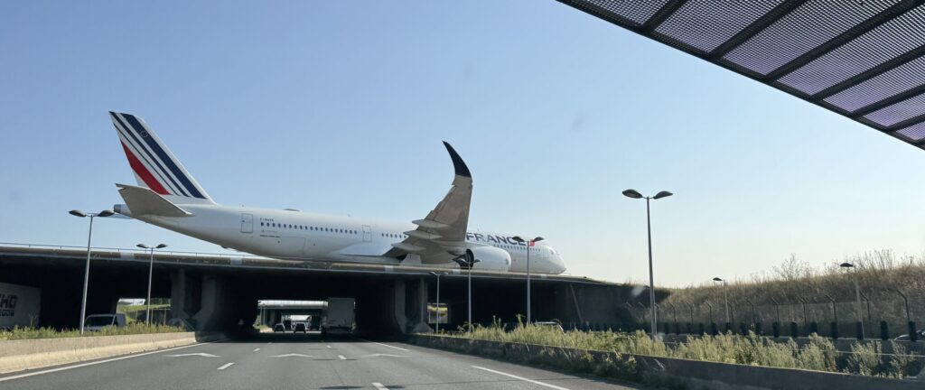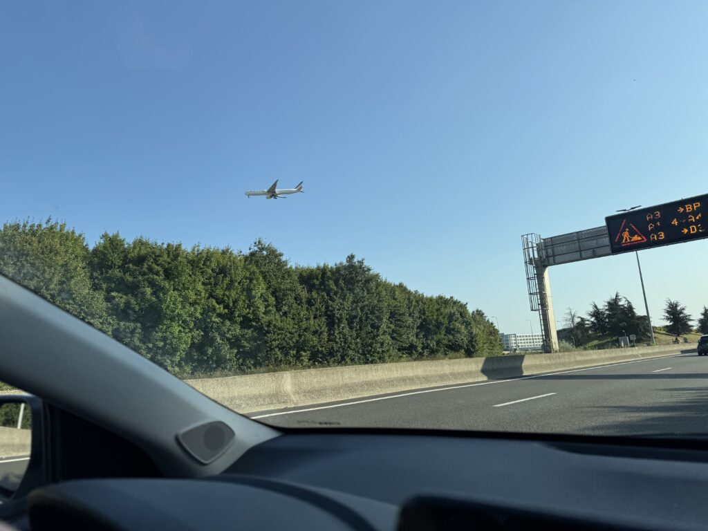 Едем дальше, к парку Анны Киевской. Дорога проходит около Аэропорта Шарля де Голля, и самолёт проезжает над нами — полоса на уровень выше.