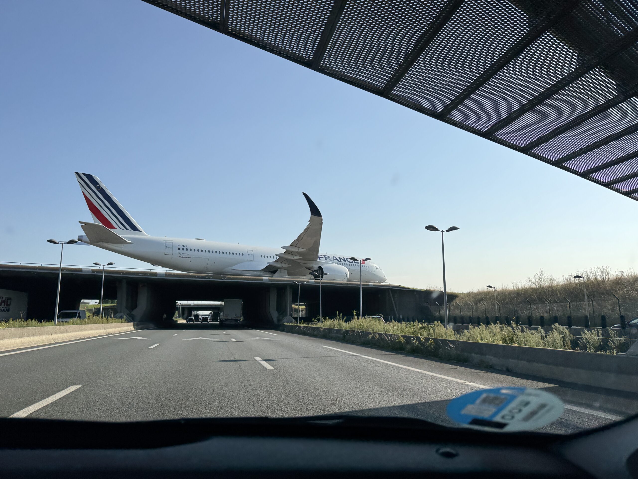 Едем дальше, к парку Анны Киевской. Дорога проходит около Аэропорта Шарля де Голля, и самолёт проезжает над нами — полоса на уровень выше.