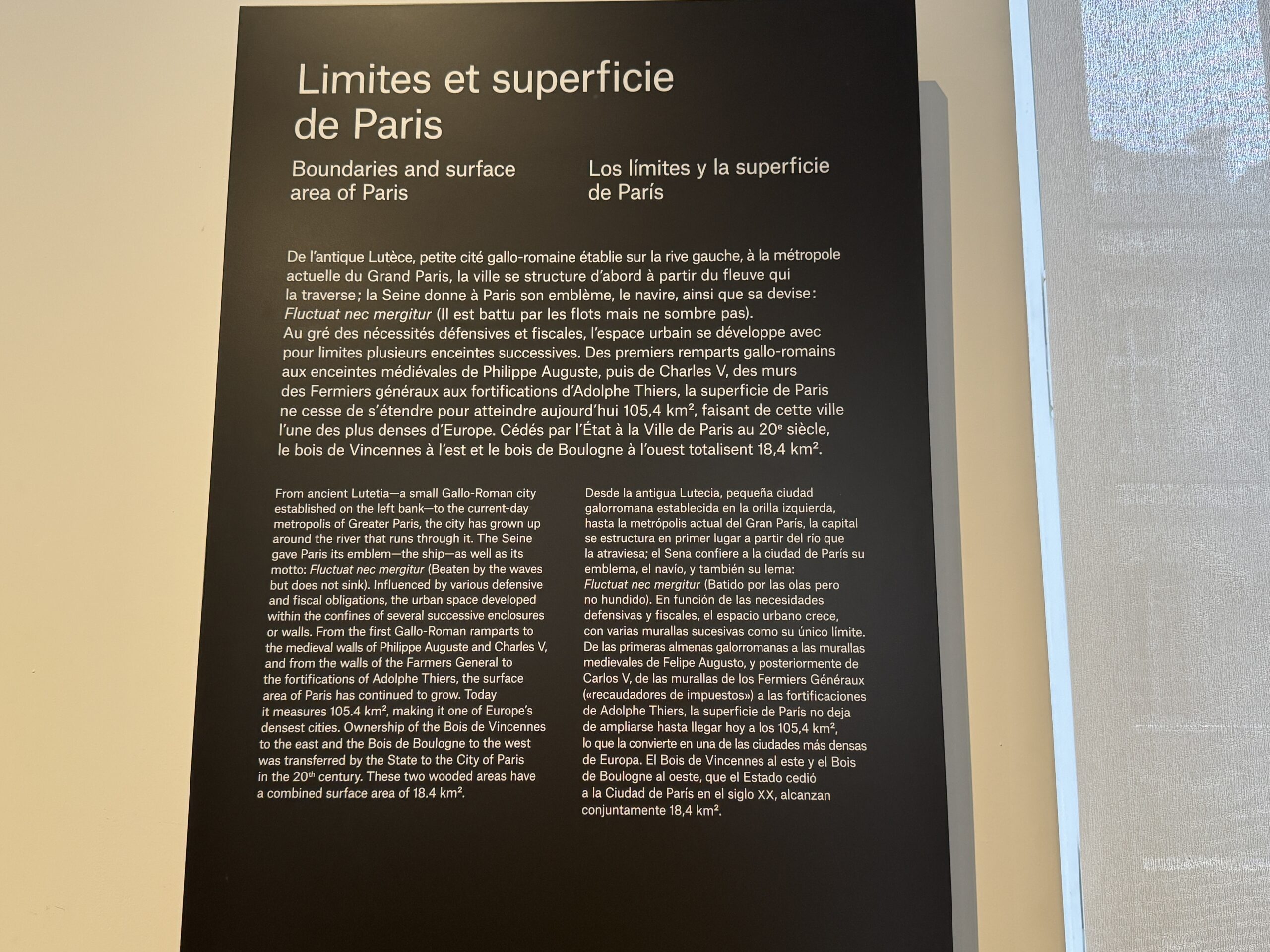 Границы и площадь Парижа. От древней Лютеции – небольшого галло-римского города, основанного на левом берегу – до современного мегаполиса Большой Париж, город разрастался вокруг протекающей через него реки. Сена дала Парижу его эмблему – корабль – и девиз: Fluctuat nec mergitur (Его качает, но он не тонет). Под влиянием различных оборонительных и фискальных обстоятельств городское пространство развивалось в пределах нескольких последовательно возводимых укреплений или стен. От первых галло-римских валов до средневековых стен Филиппа-Огюста и Карла V, от стен Генеральных откупщиков до укреплений Адольфа Тьера, площадь Парижа продолжала расти. Сегодня она составляет 105,4 км², что делает его одним из самых густонаселенных городов Европы. В XX веке Венсенский лес на востоке и Булонский лес на западе были переданы государством городу Парижу. Общая площадь этих двух лесных массивов составляет 18,4 км².