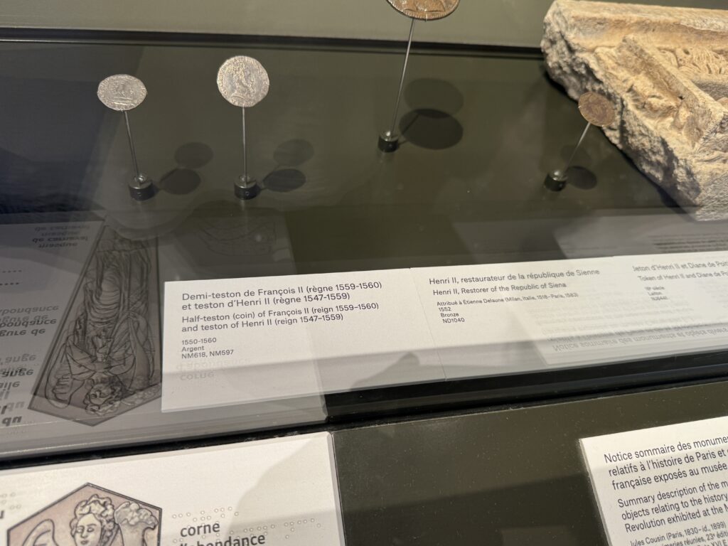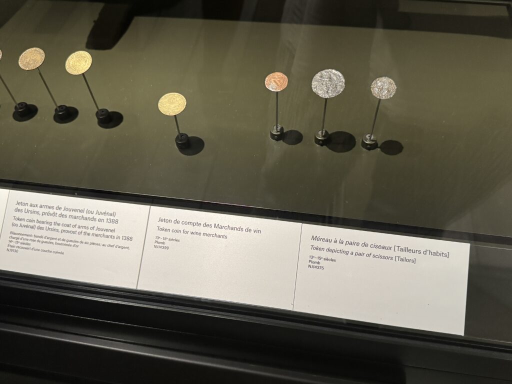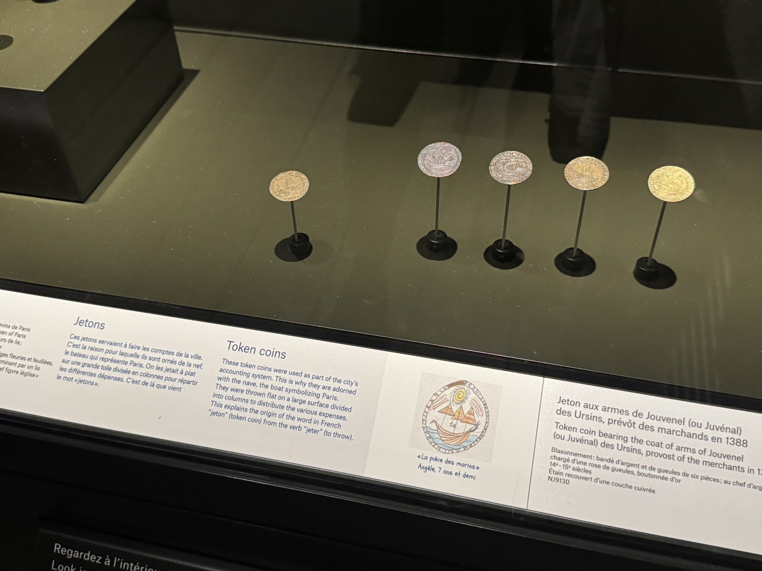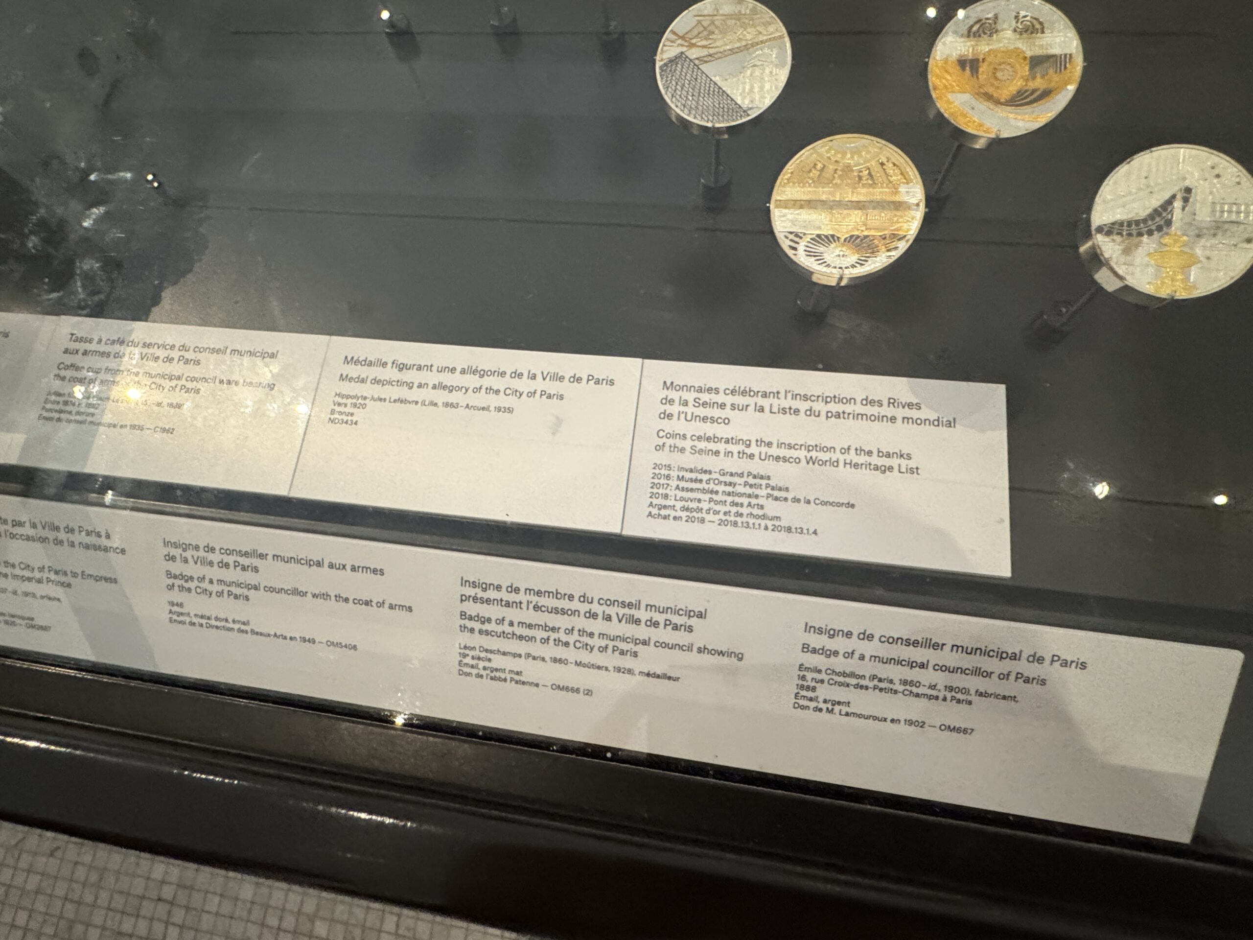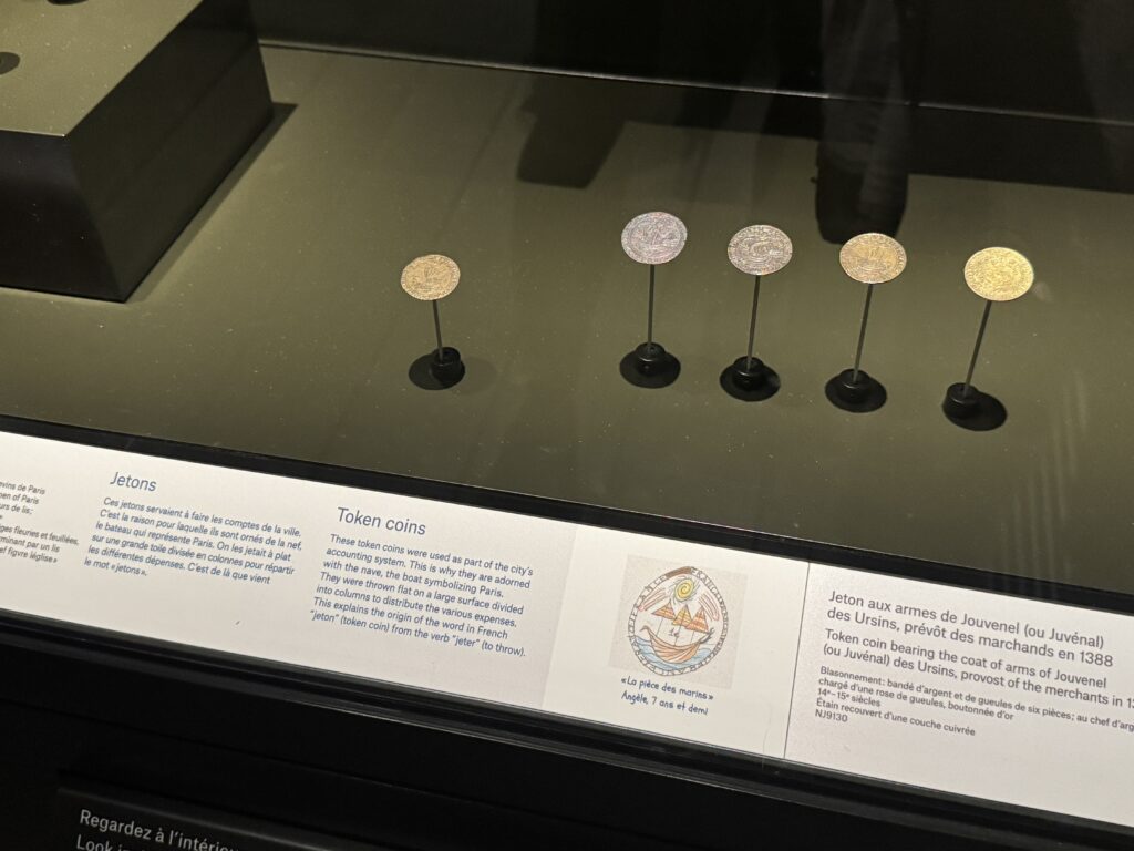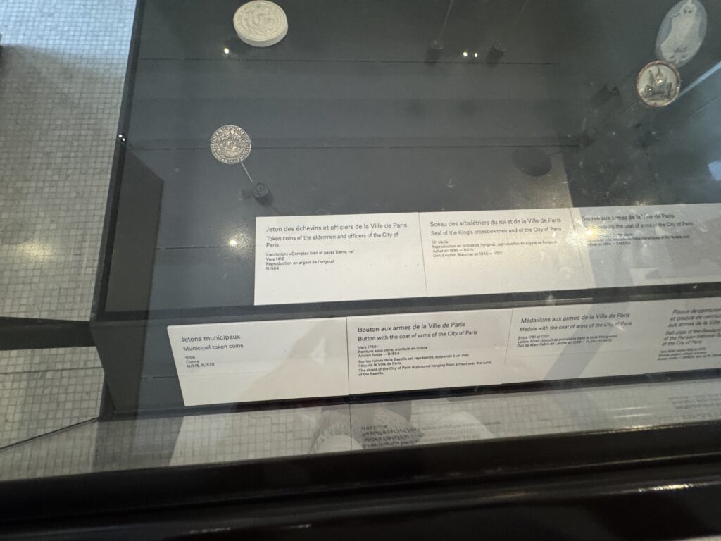 На табличке написано, что в витрине есть муниципальные разменные монеты 16  века и Печать королевских арбалетчиков и города Парижа (репродукции из бронзы и серебра).