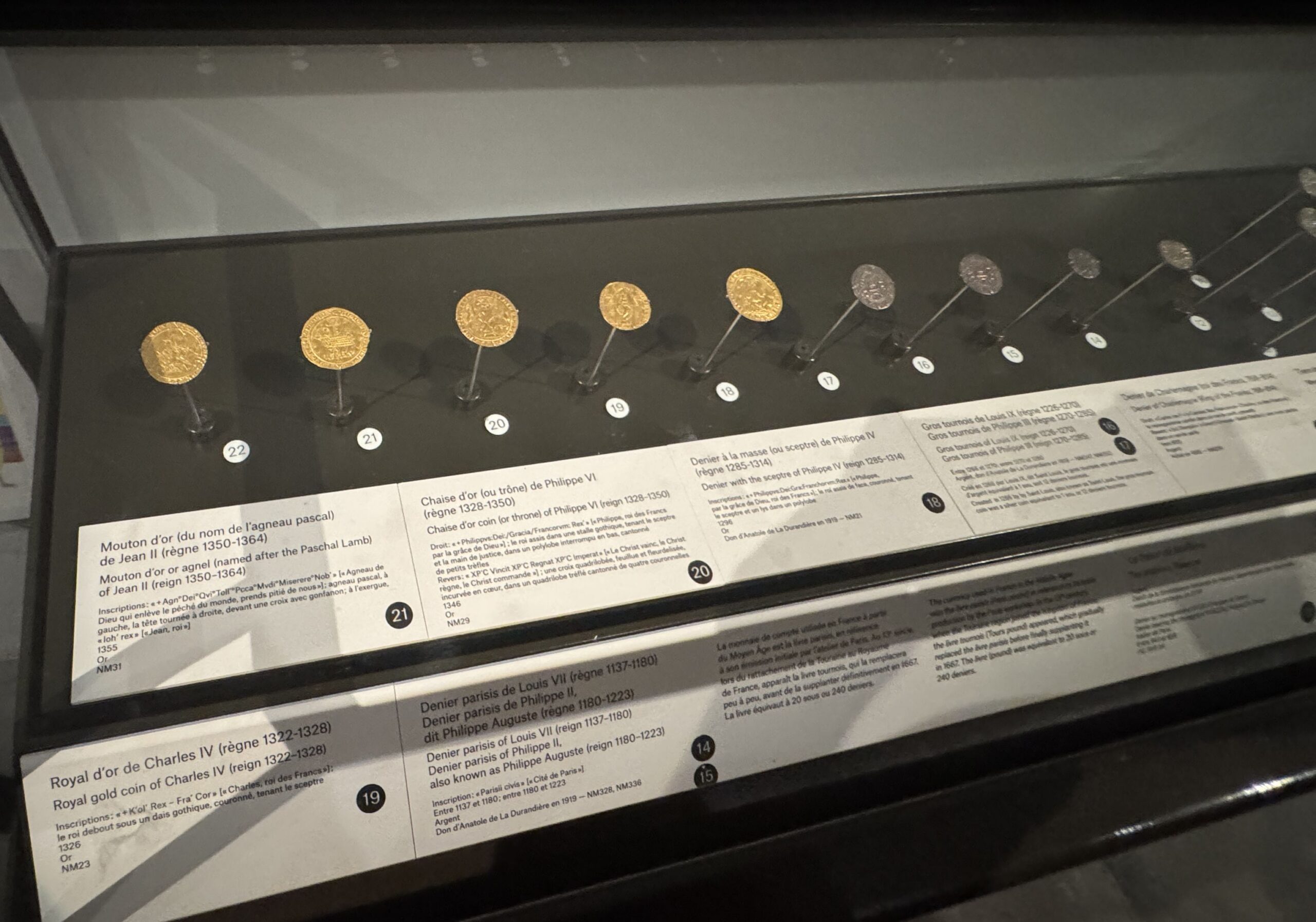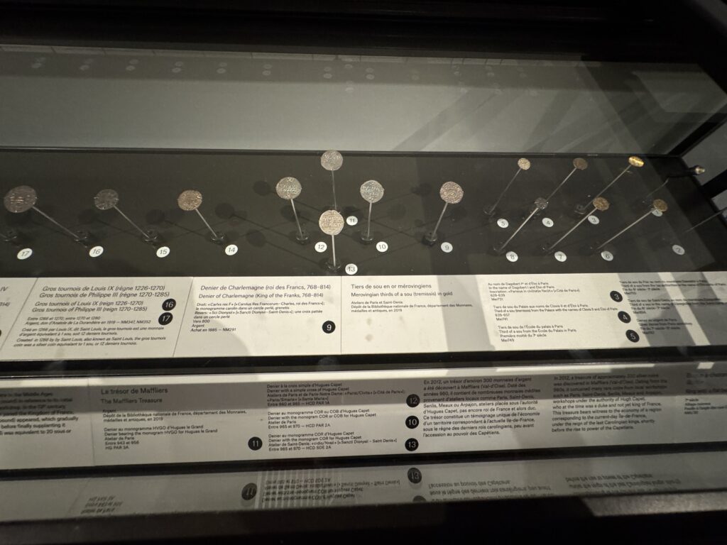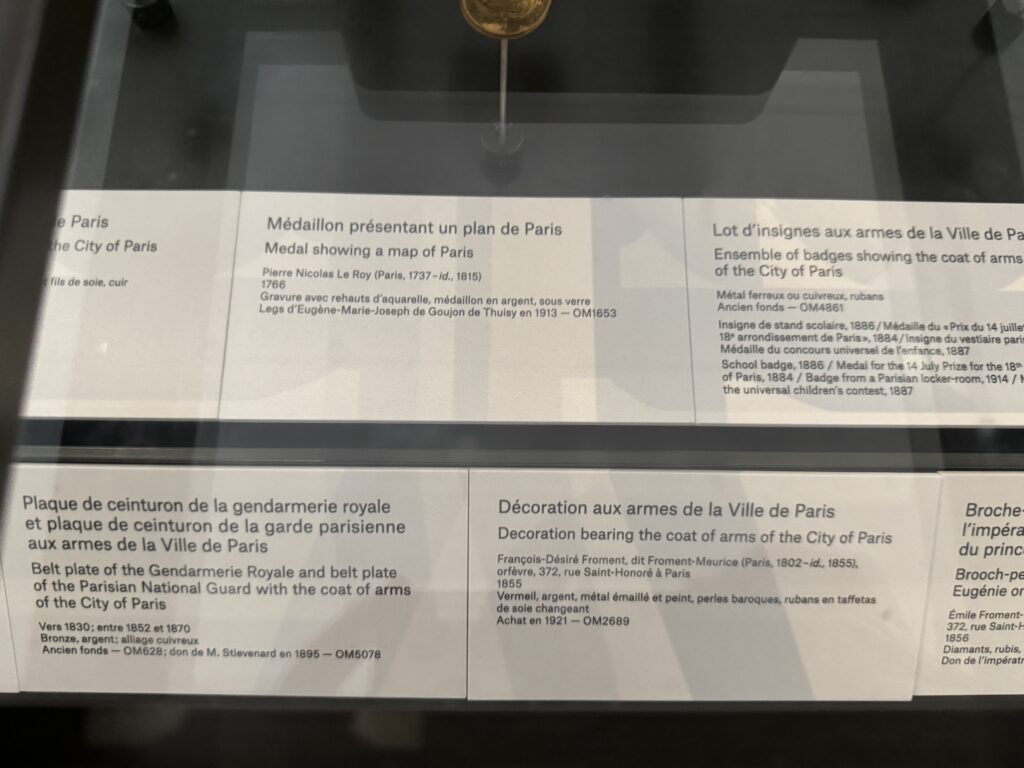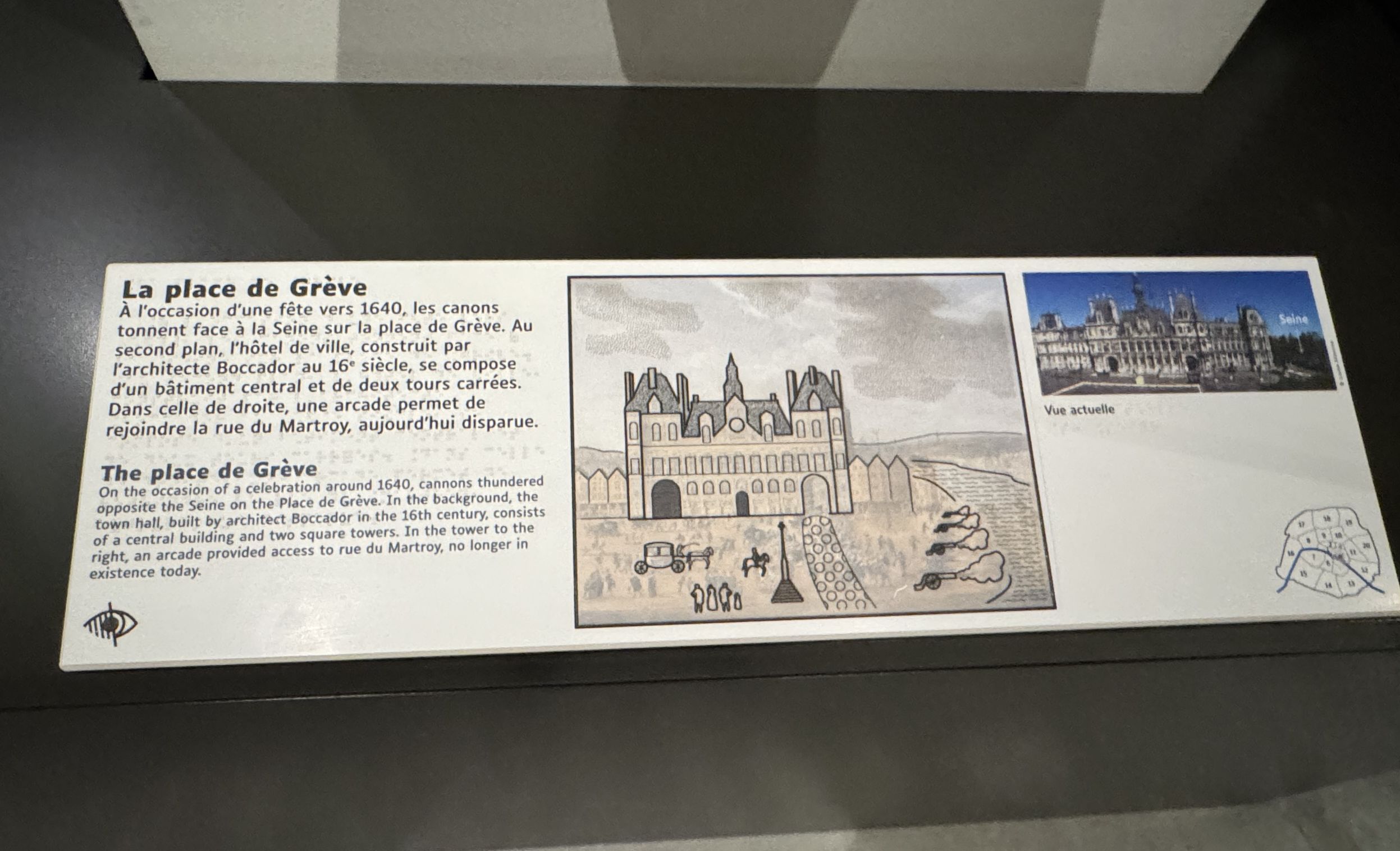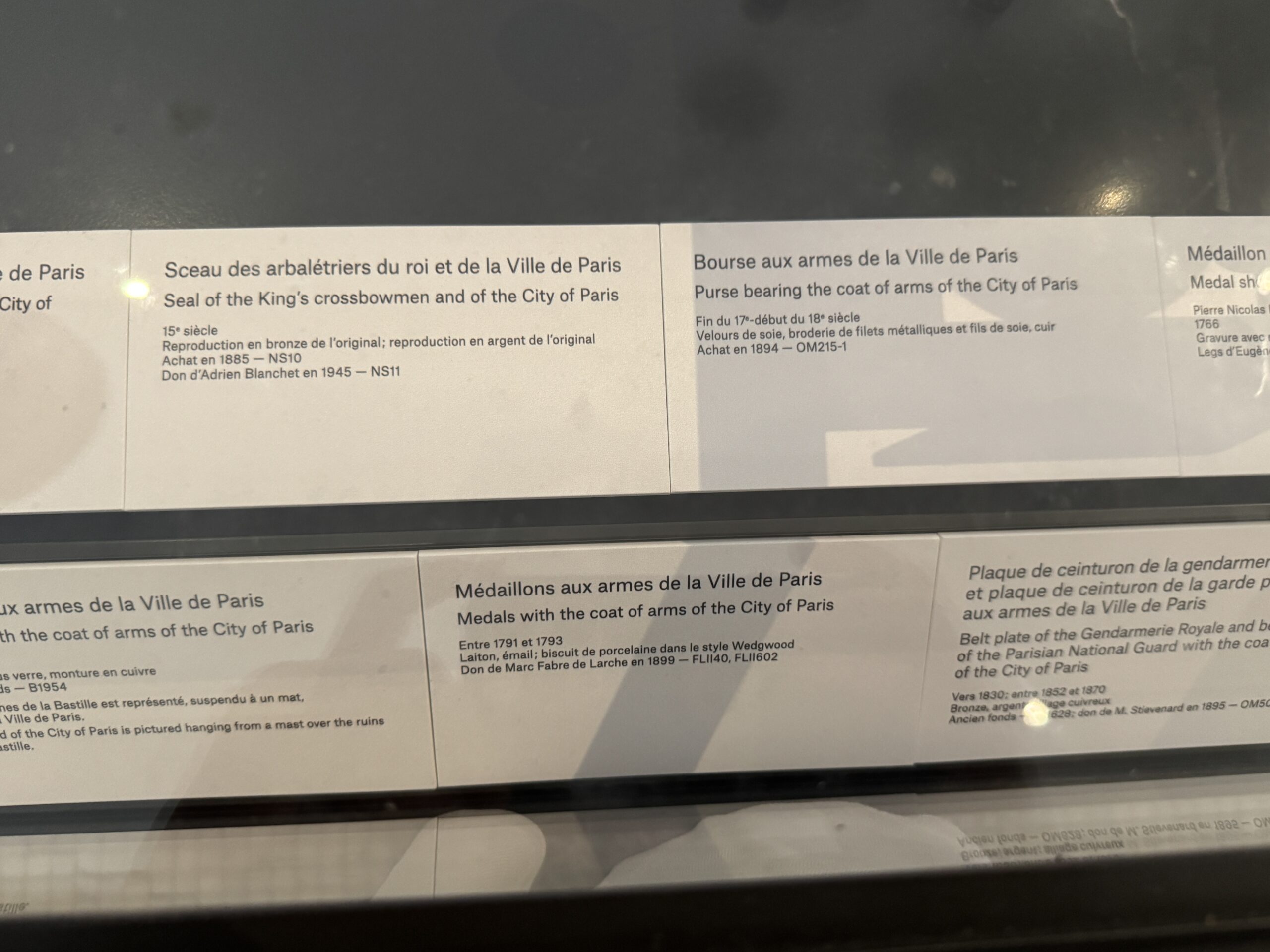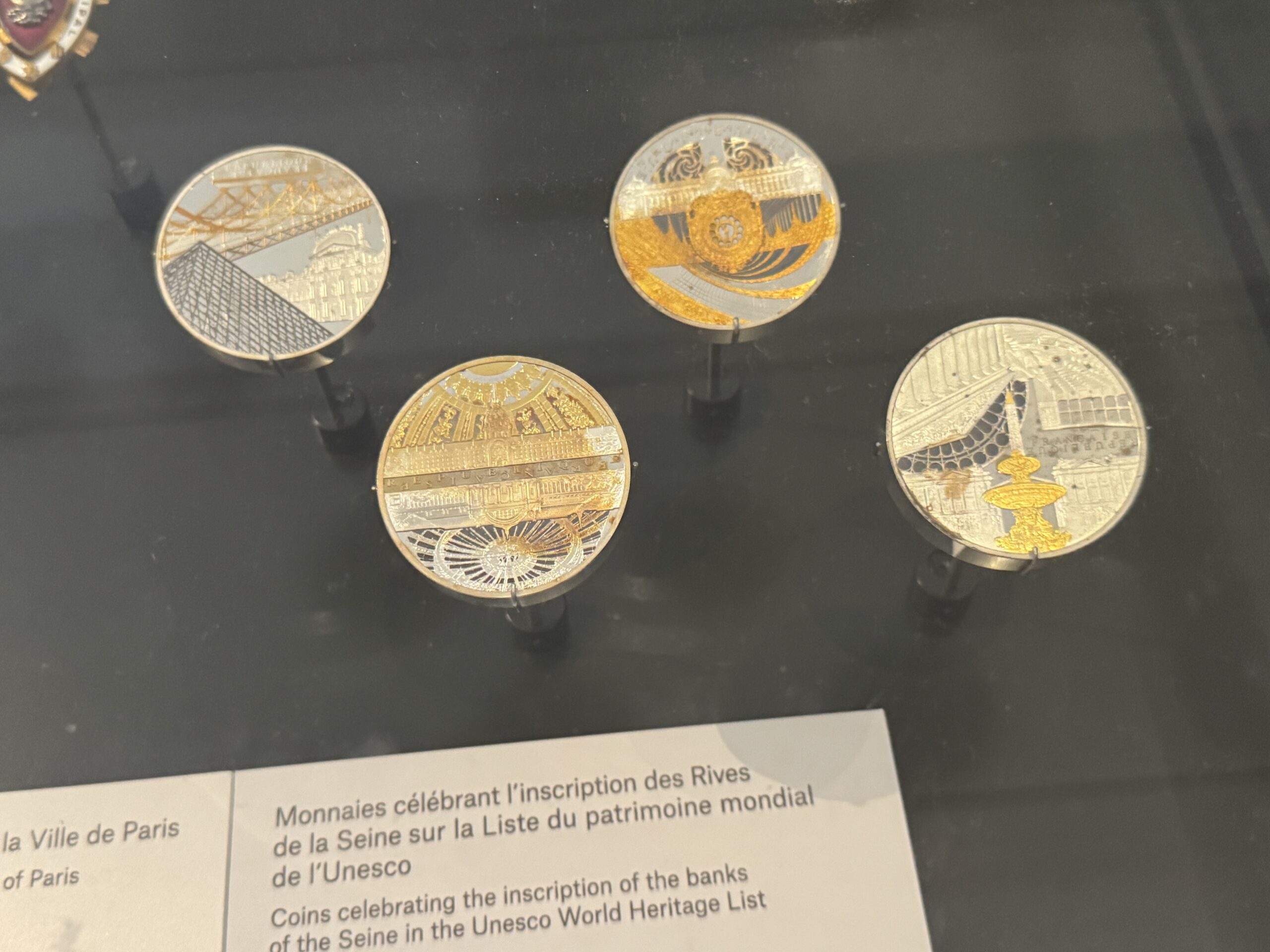 На табличке написано, что в витрине есть муниципальные разменные монеты 16  века и Печать королевских арбалетчиков и города Парижа (репродукции из бронзы и серебра).