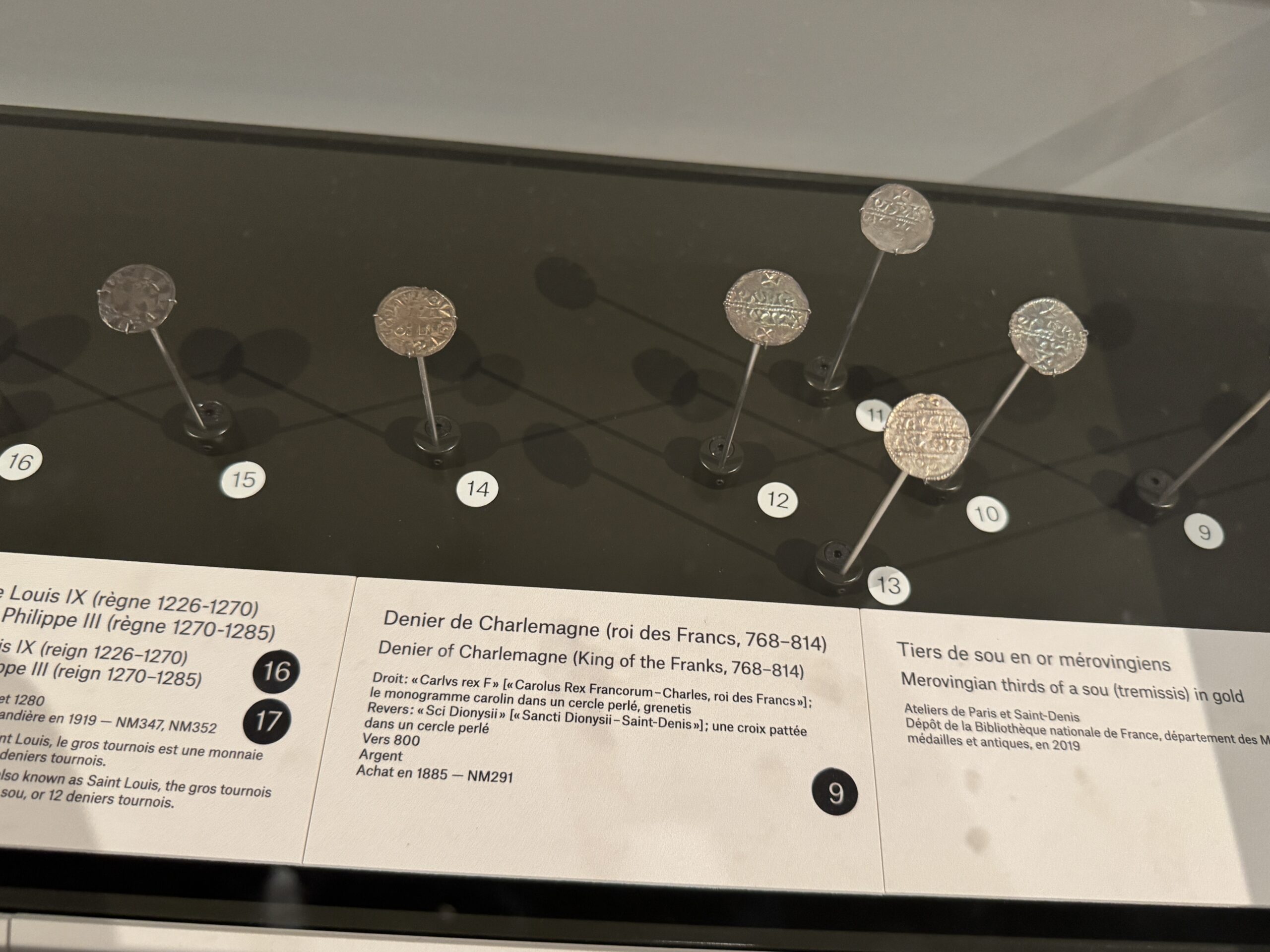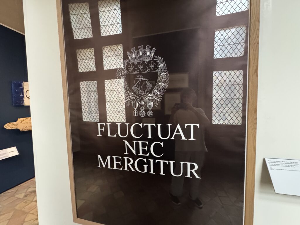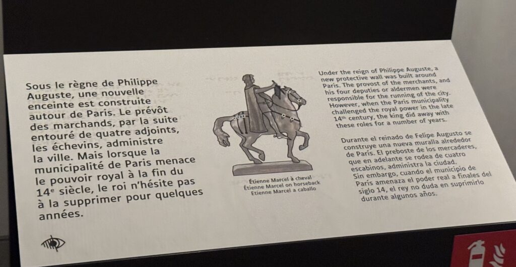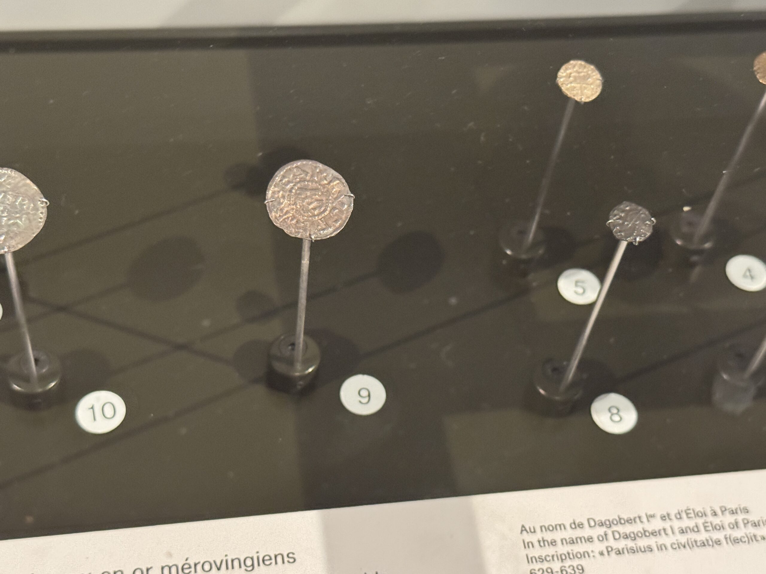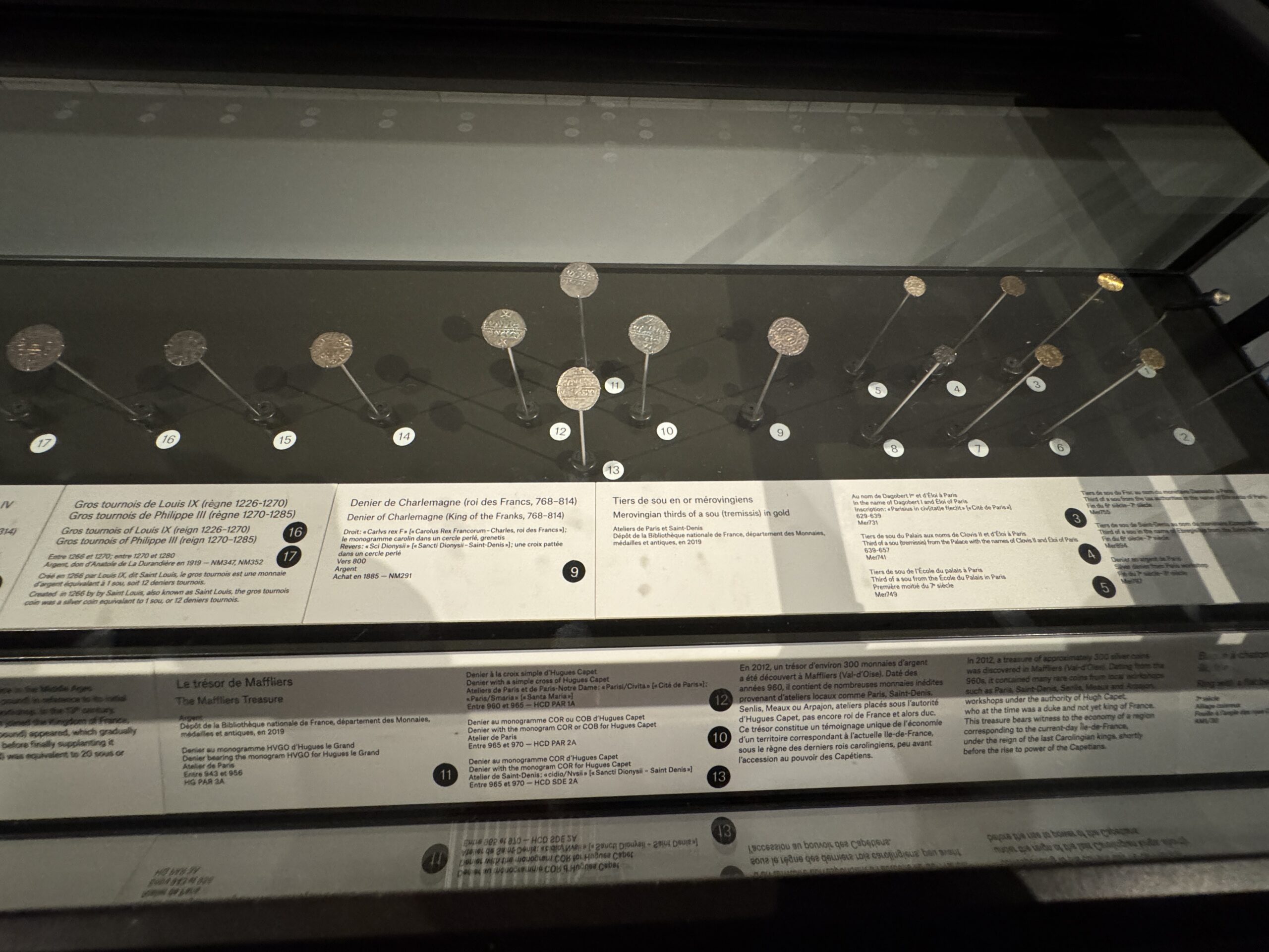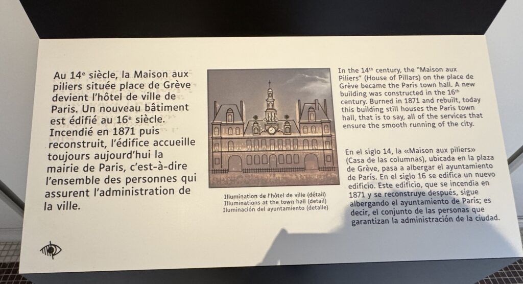 На табличке написано, что в витрине есть муниципальные разменные монеты 16  века и Печать королевских арбалетчиков и города Парижа (репродукции из бронзы и серебра).